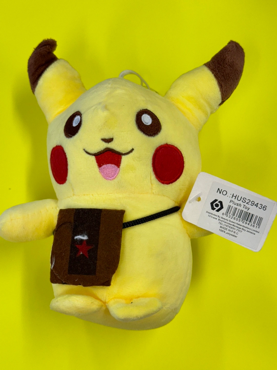 Yellow plush toy with a brown satchel, a red star on the satchel, and a black strap.