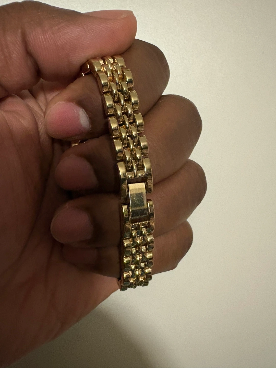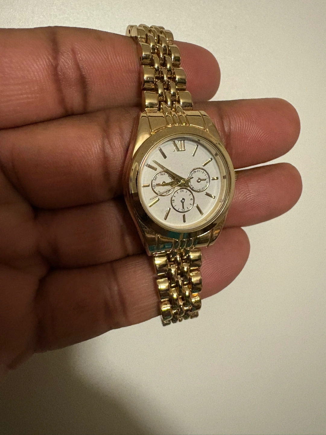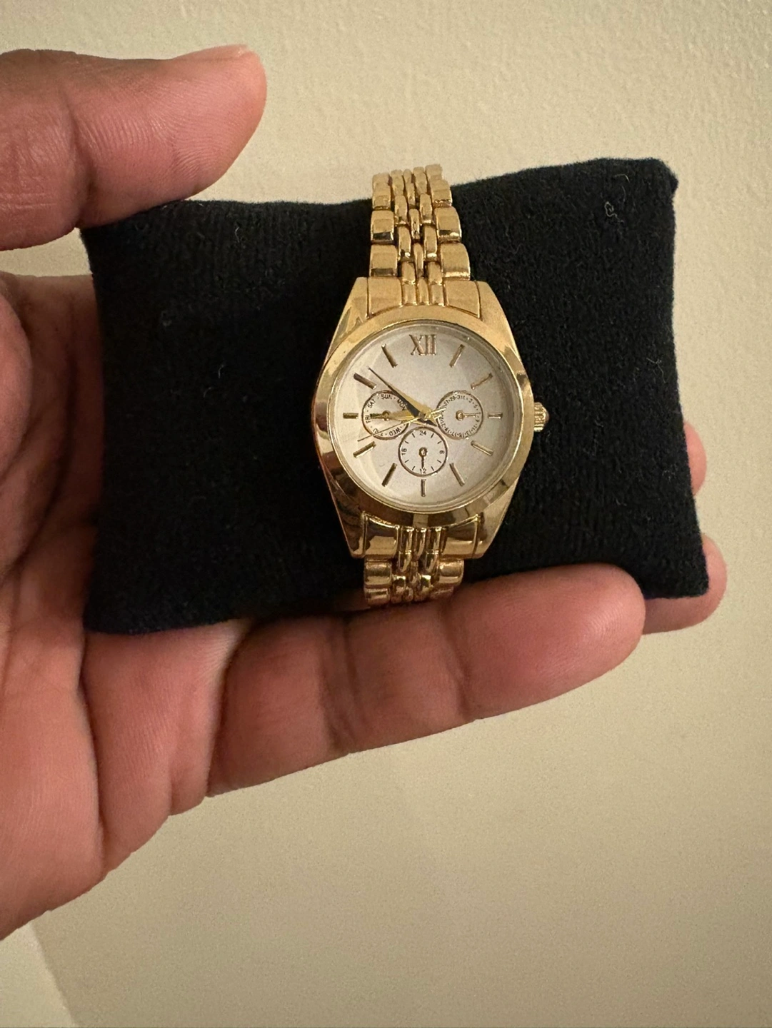 Gold watch with a white face. Includes a gold band. It only needs a new battery! Never ever used.