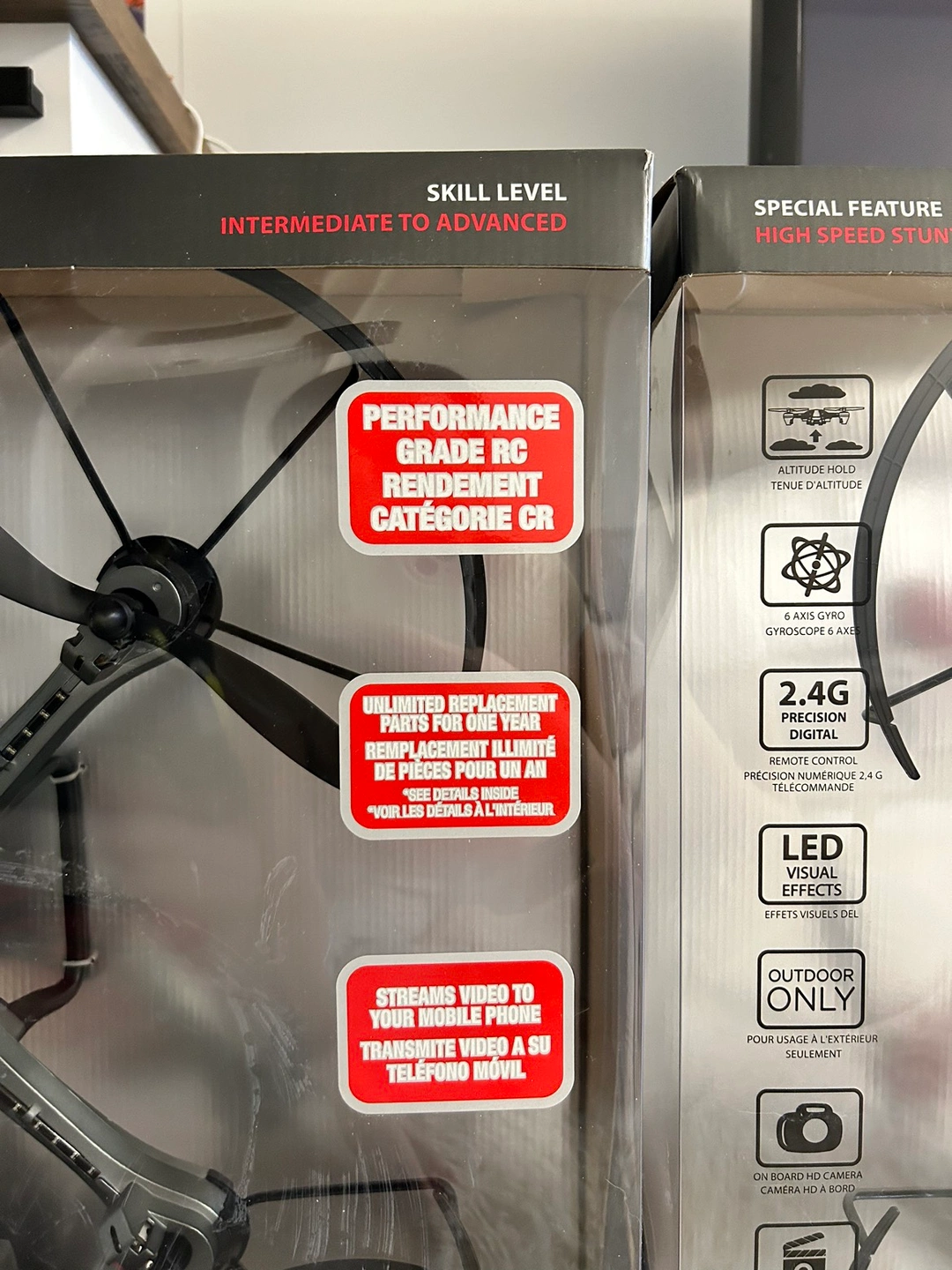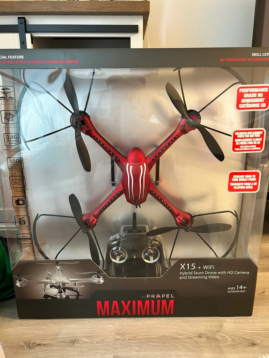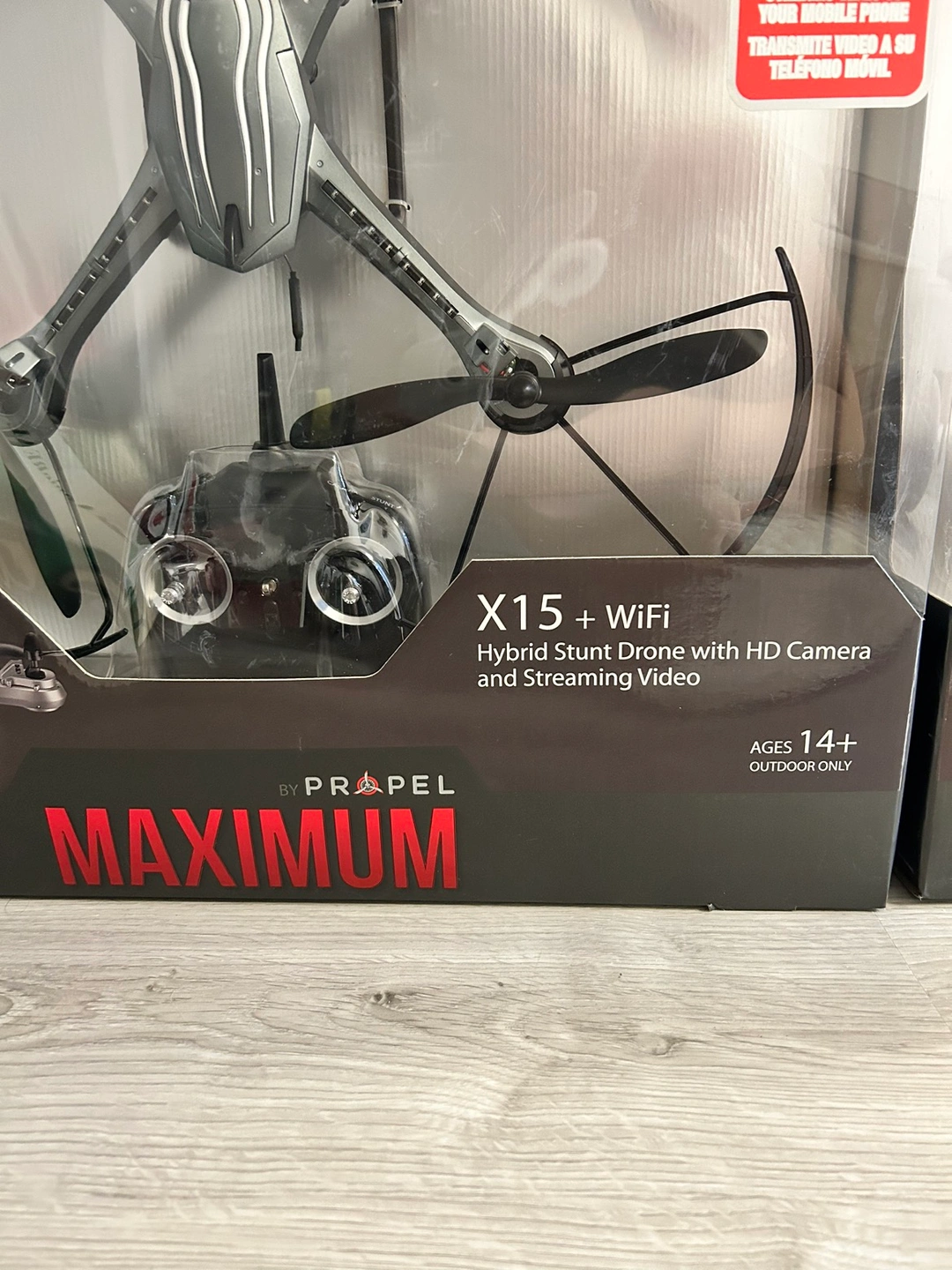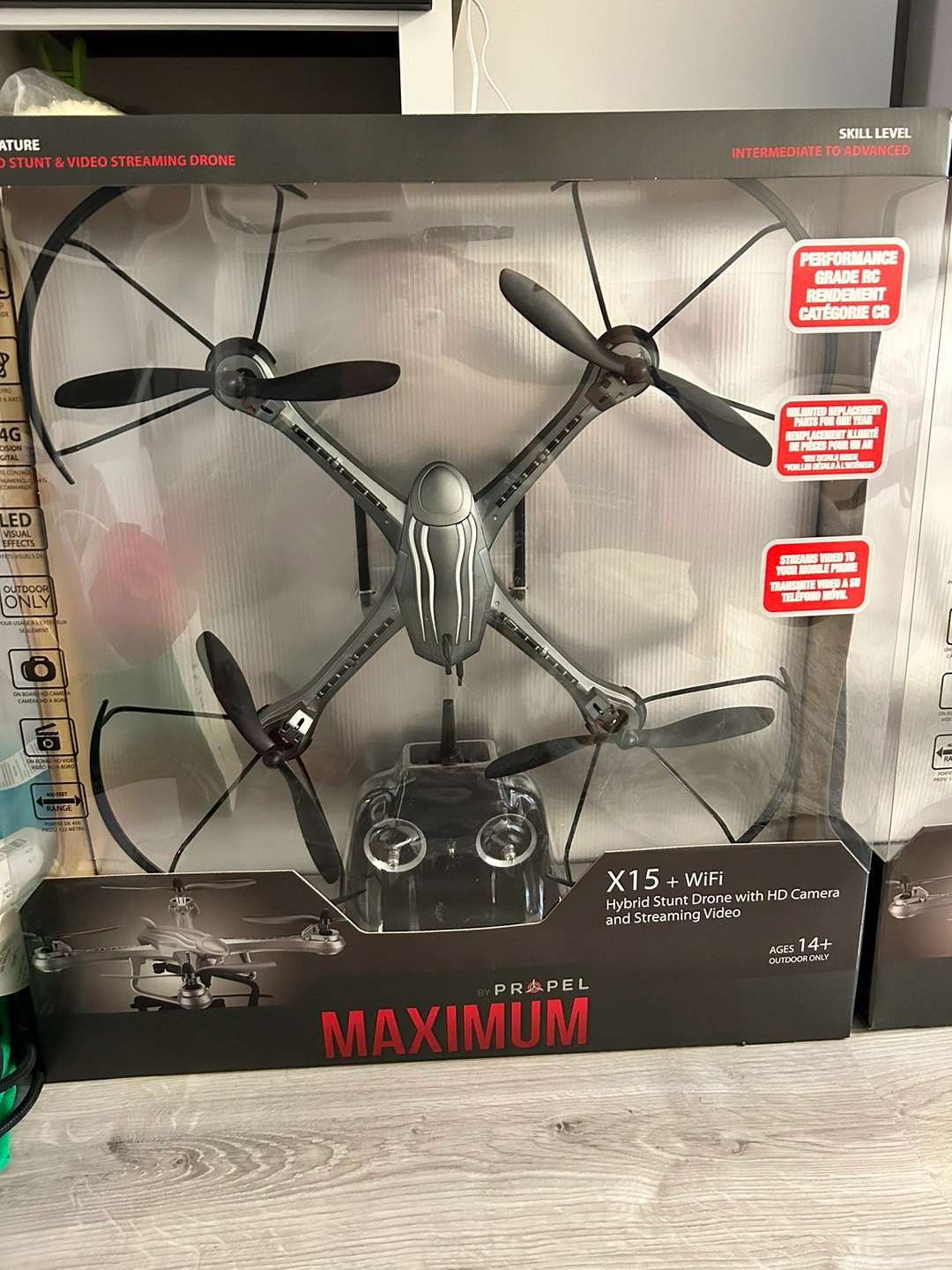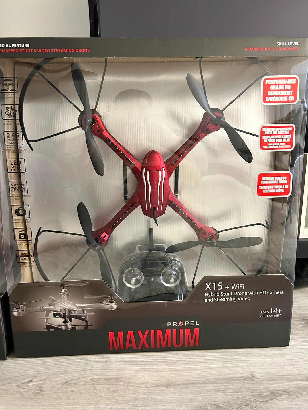 Brand new and in original box Maximum by Propel. High speed stunt and video streaming drone. Performance grade. High quality drone perfect if you like to travel, like photography and want to be able to take photos and videos from different angles, aerial views. 2 drones available, each $50. One is grey and black, the other is red and black. They are the same model, just different colours. $300 retail price. Pickup at finch station.