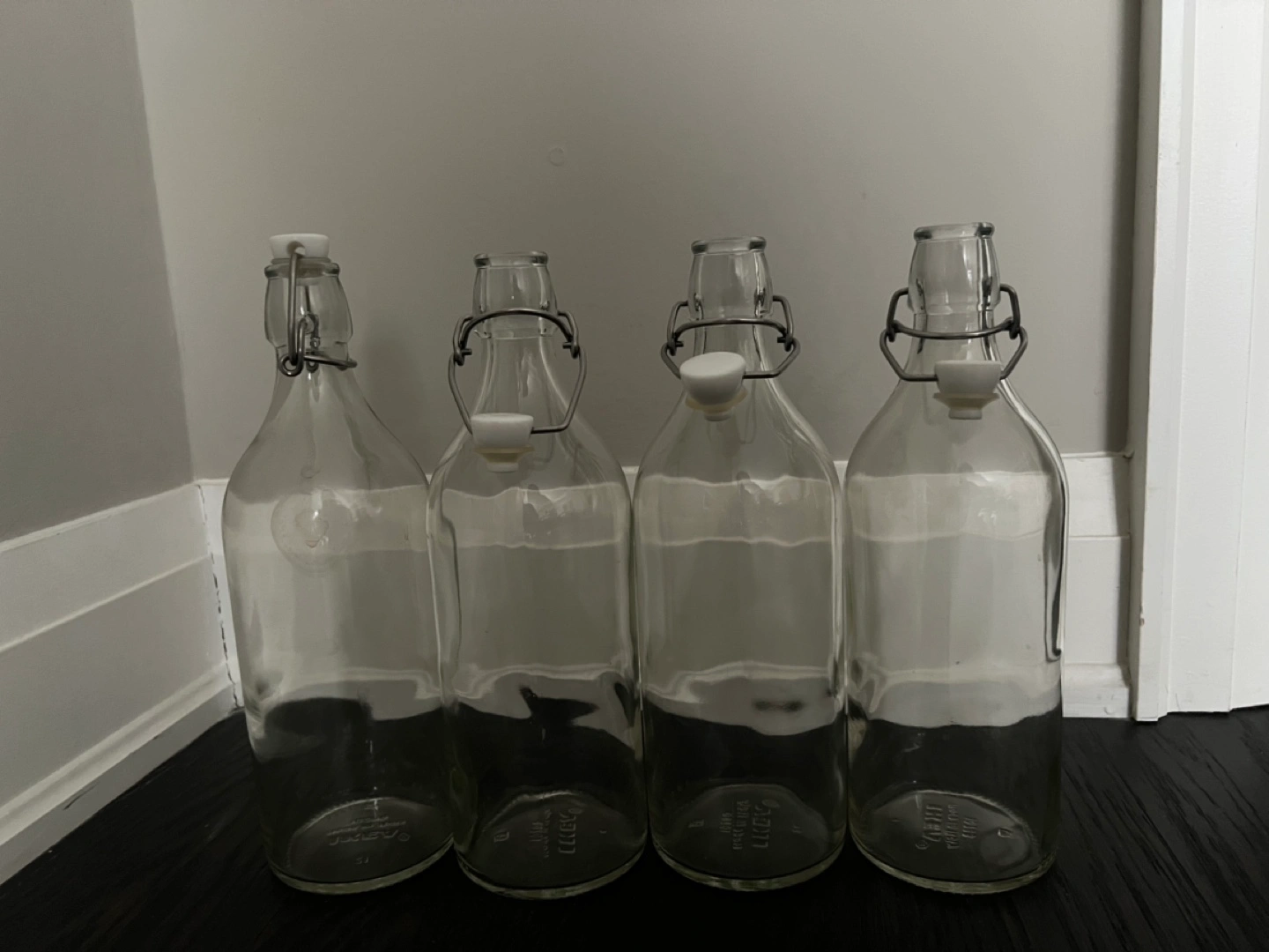 Set of 4 Ikea clear glass bottles with swing top lids. Perfect for storing homemade beverages or other liquids. All 4 for $5.