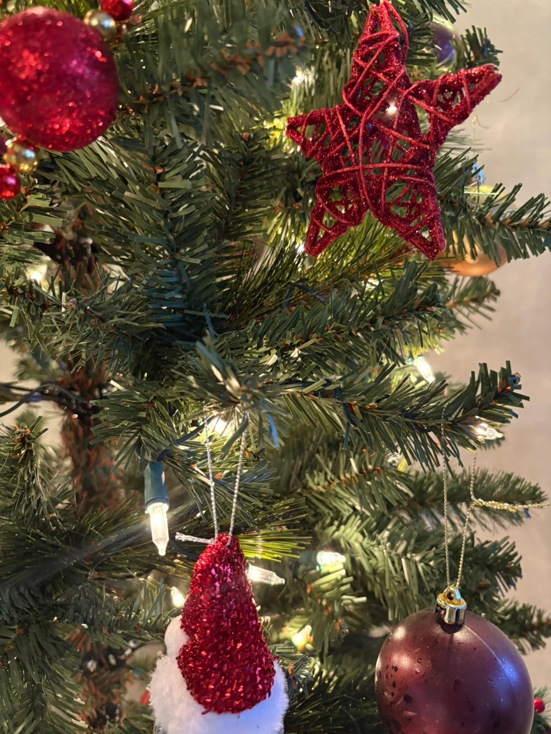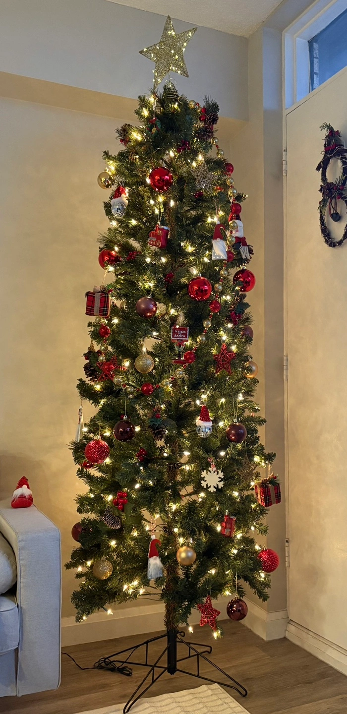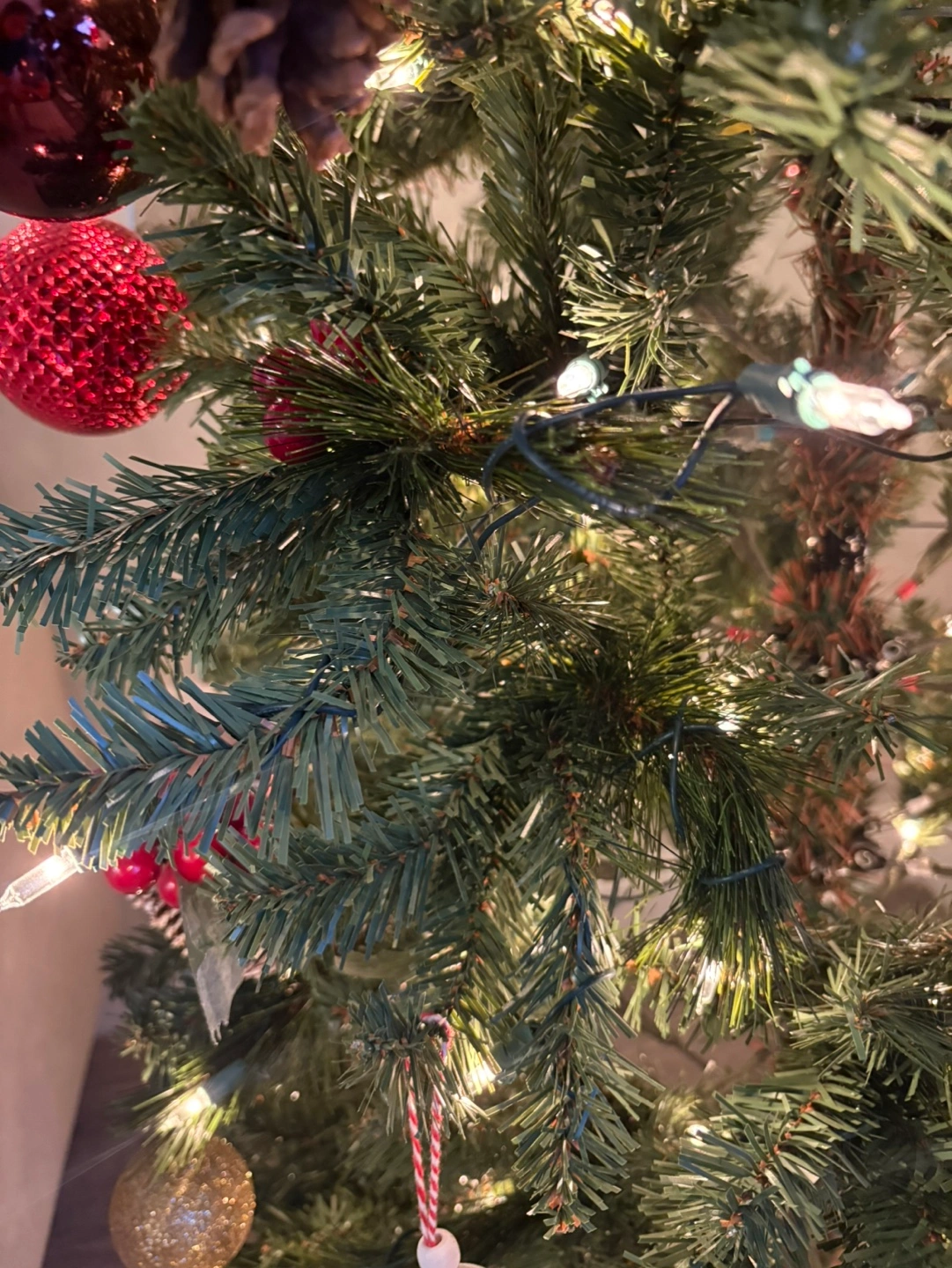Artificial Christmas tree with warm lights and stand. Ornaments not included. 7 feet (2.13m) tall 1 year old
