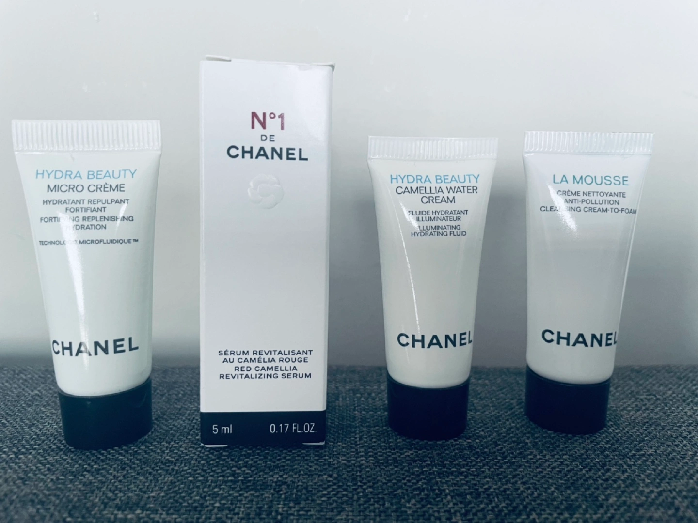 Set of four travel-sized Chanel skincare products, items are all brand new and unopened. Includes: Micro Crème, Camellia Water Cream, Red Camellia Revitalizing Serum, and Cleansing Cream-to-Foam.