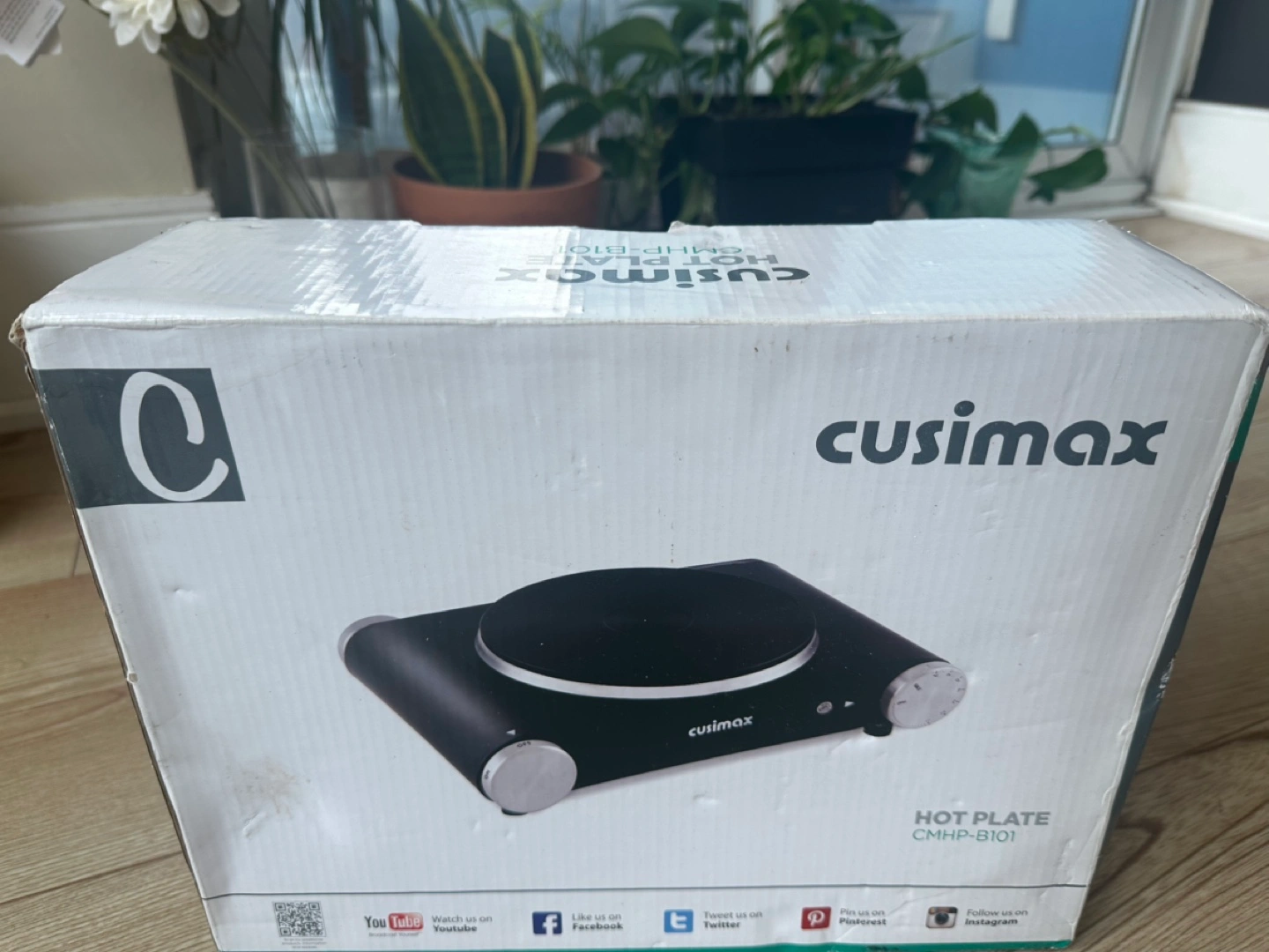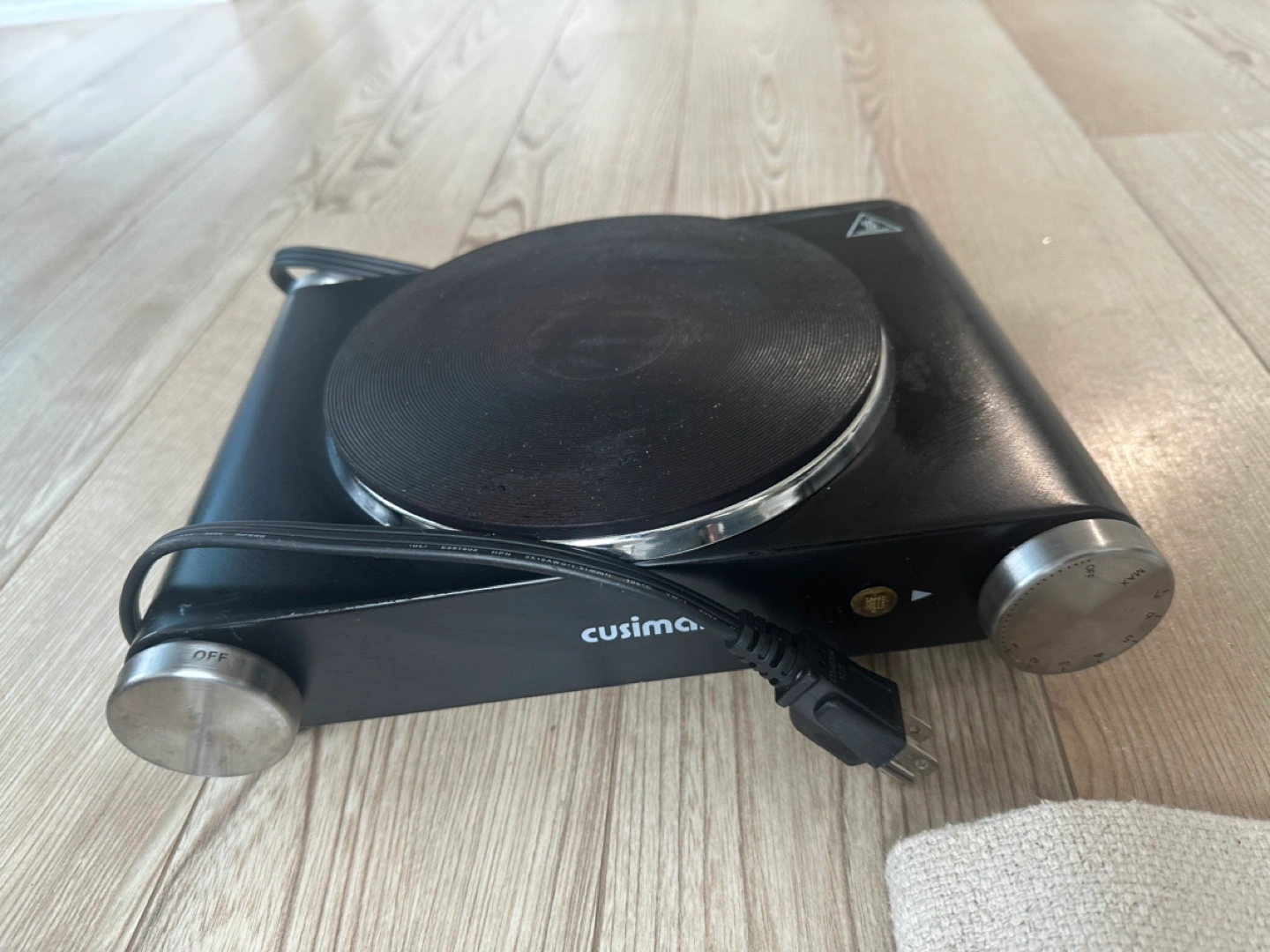 Black hot plate with temperature control knob and on/off switch. Includes cord.