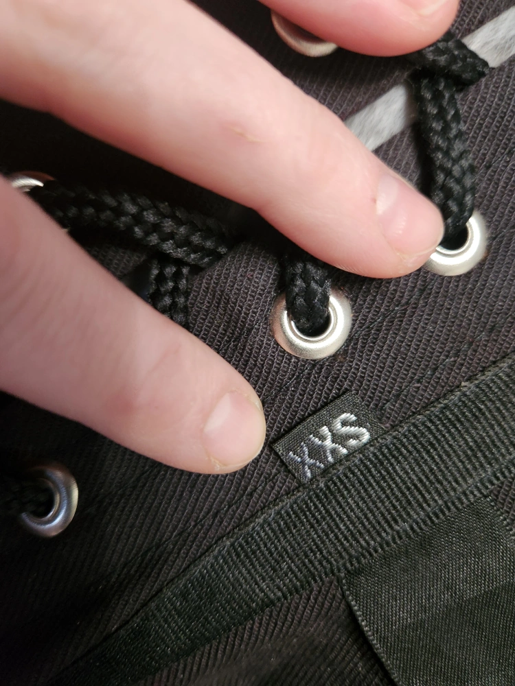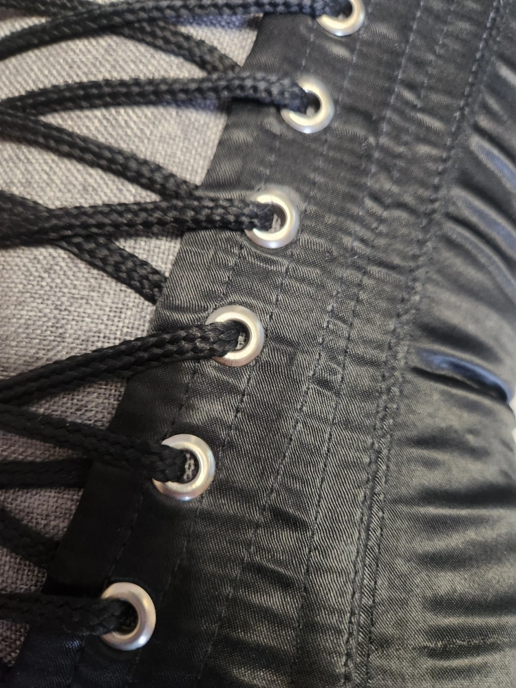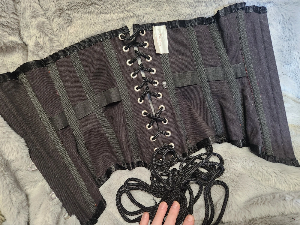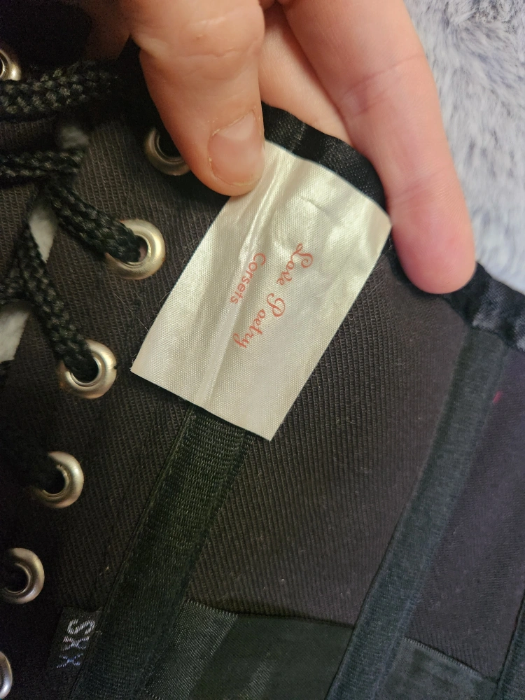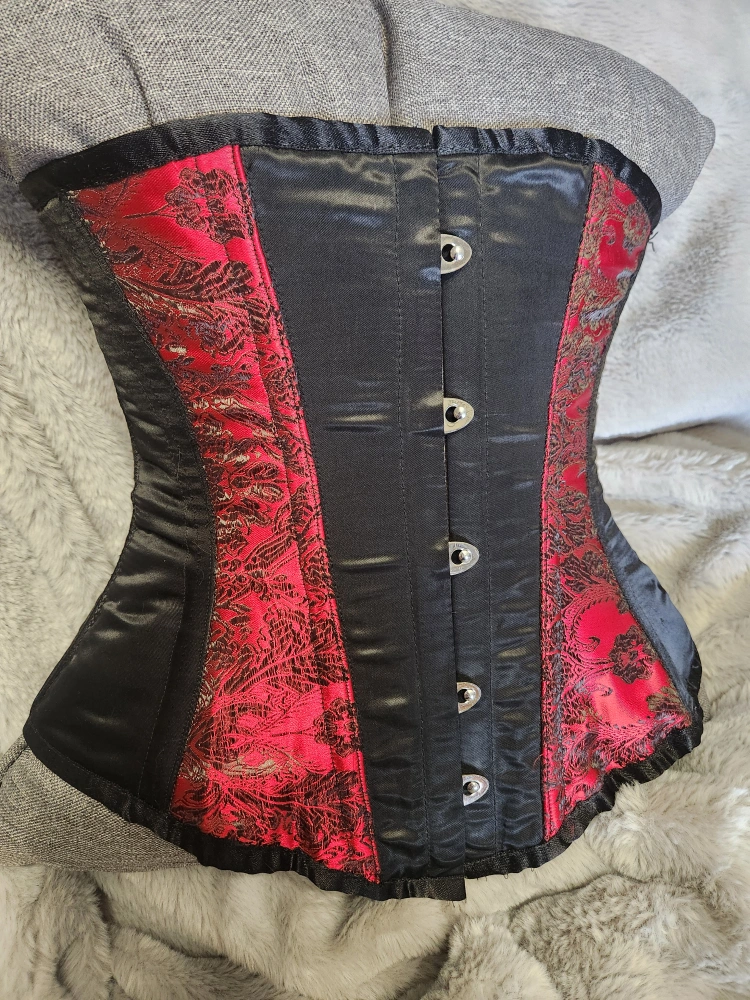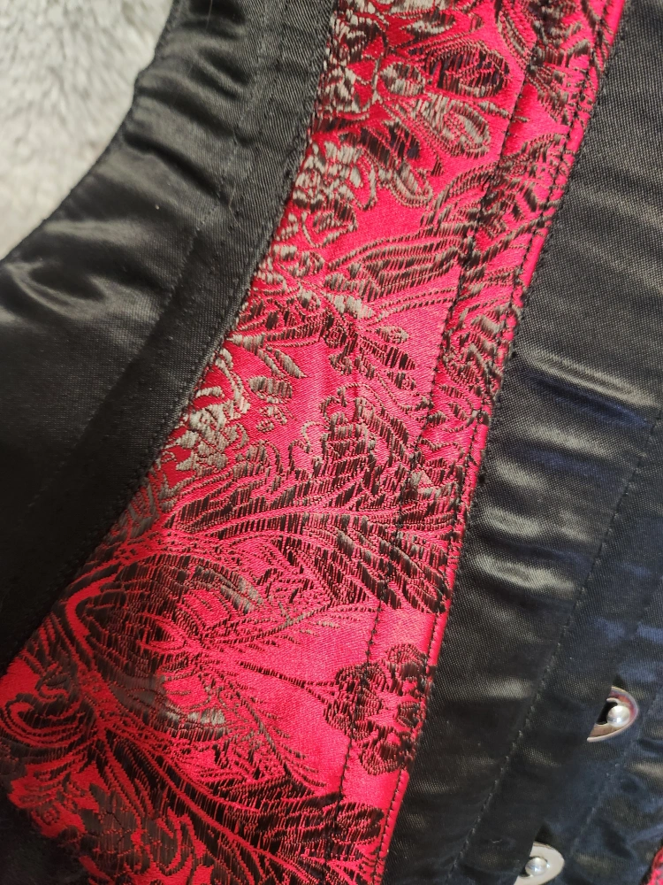 Black satin corset with red floral pattern on the sides. Lace-up back. Beautiful handmade corset here in Toronto by Love Poetry Corset. Bought for myself and worn only twice. I've always been impressed with their quality and attention to detail. Made with a 100% cotten lining, they are comfortable and creative and hour glass shape. Boning is a strong, flexible steel. This is a one of a kind corsets, durable and beautiful.