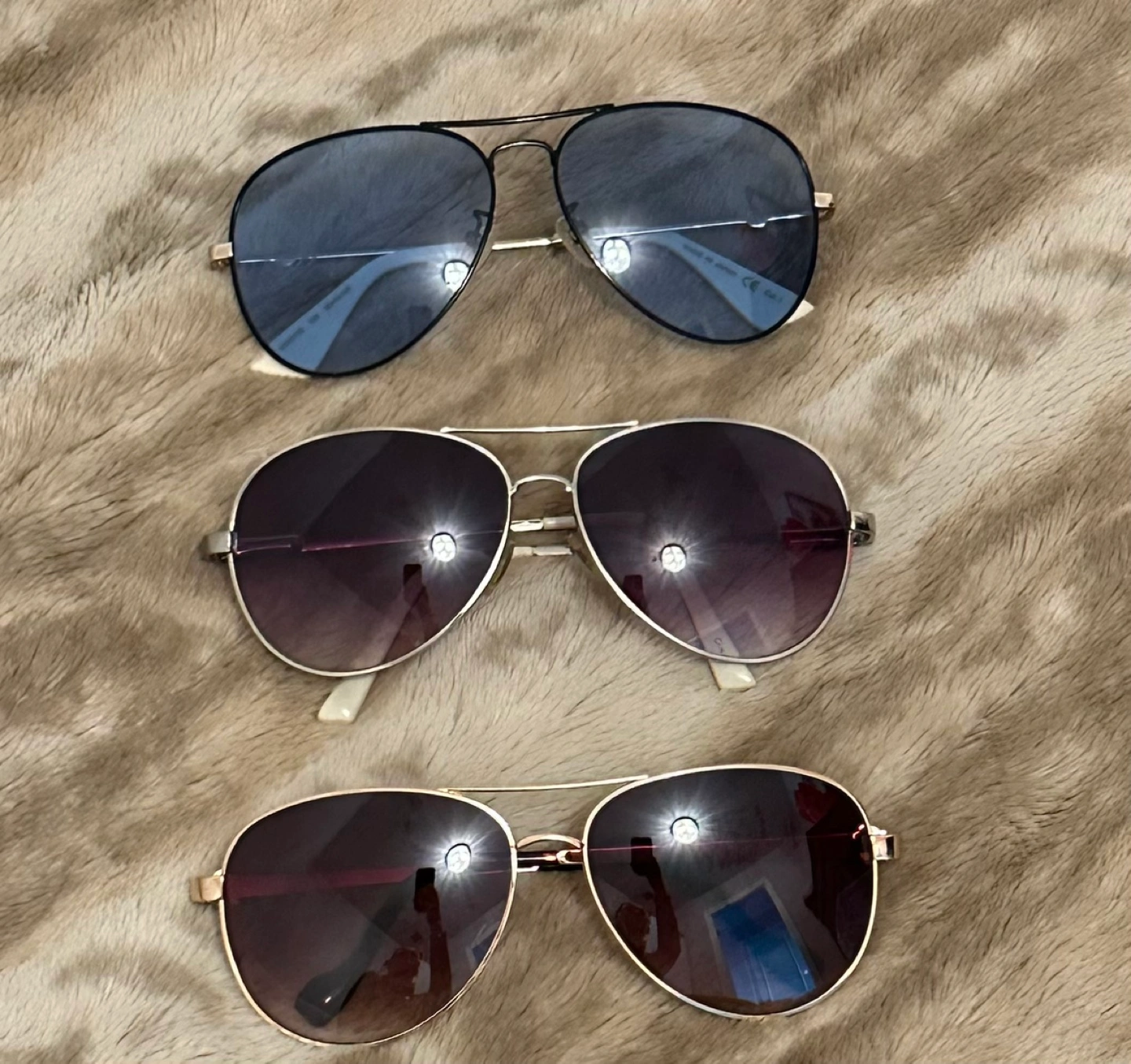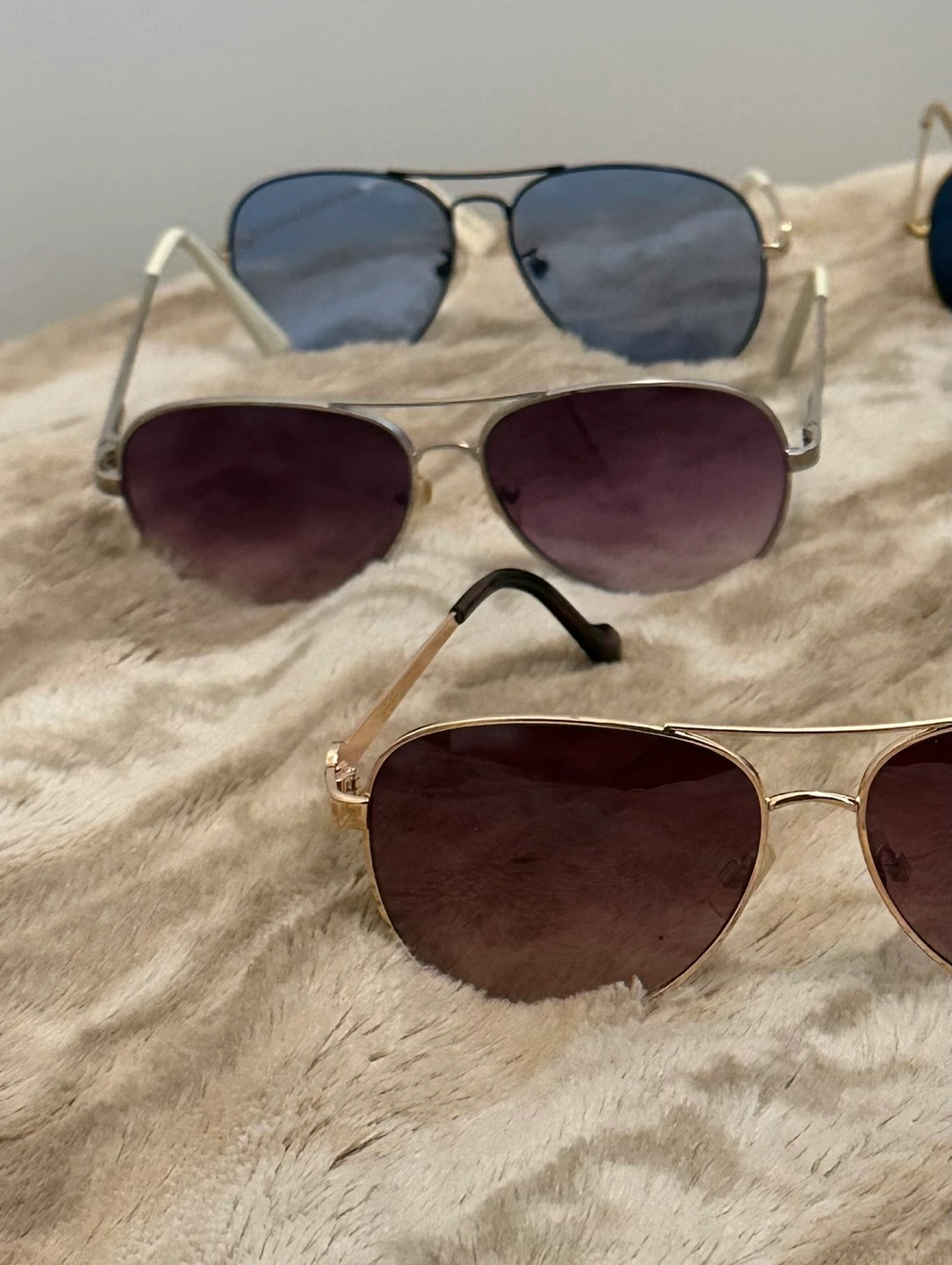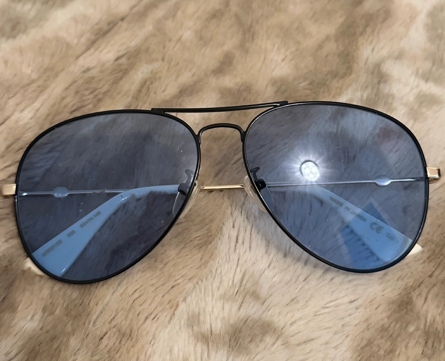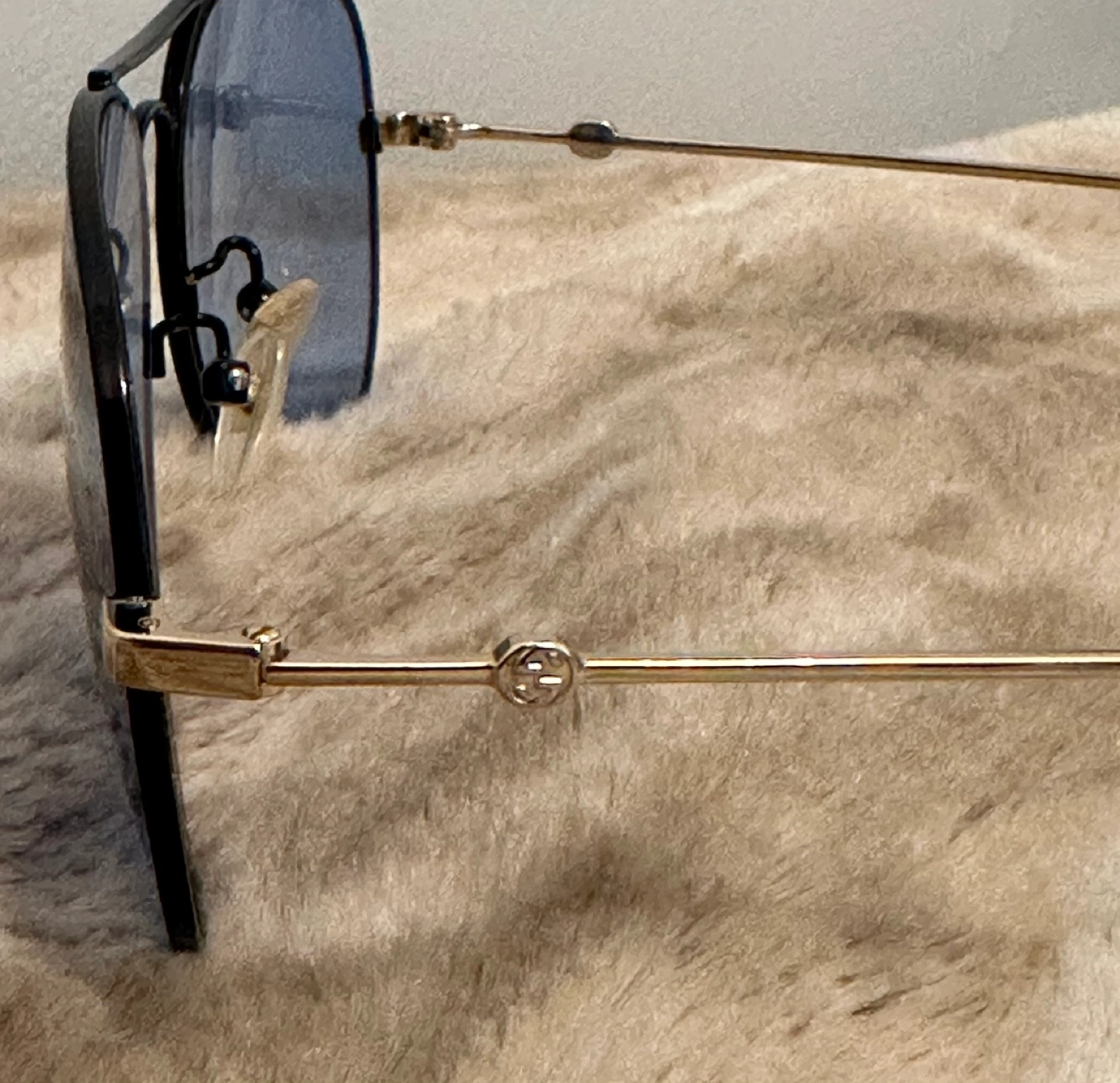 Pair of aviator sunglasses, black frames and gold accents. Blue lenses.Gucci are $40.00 Jessica Simpson $10and Steve Madden $10 no case I have cloth pouches for each
