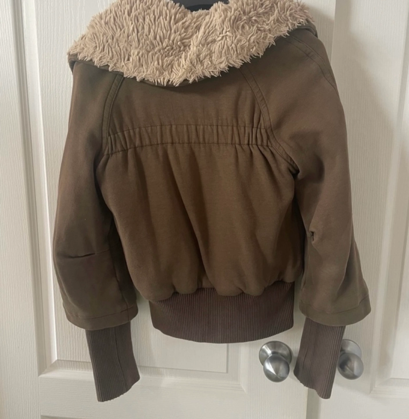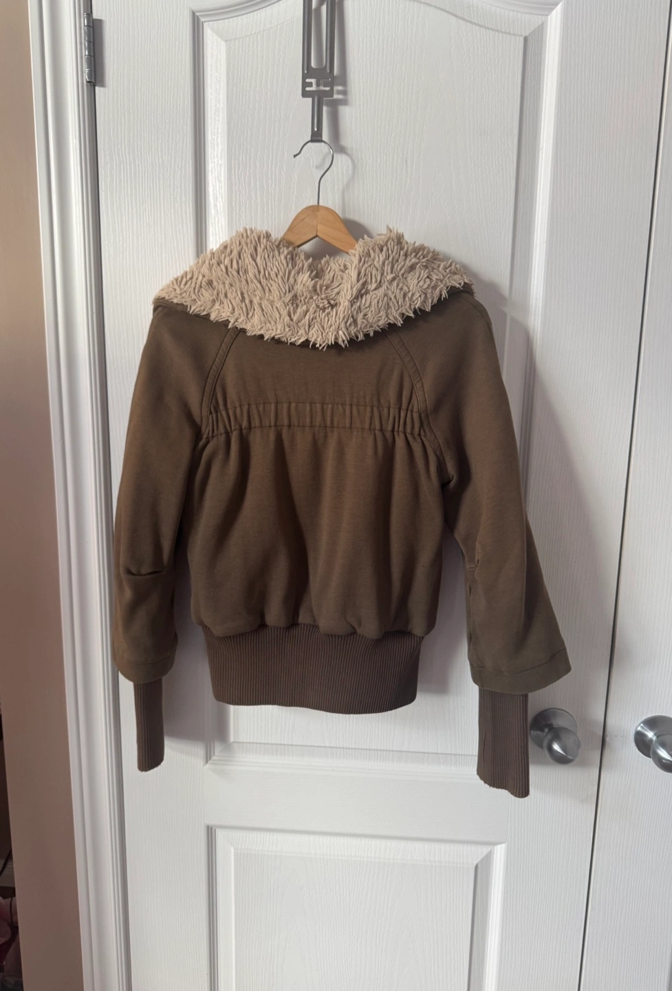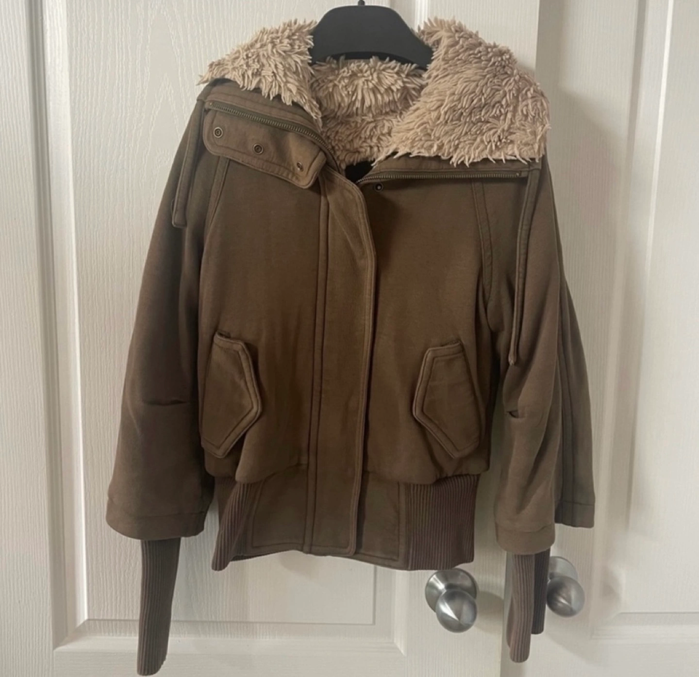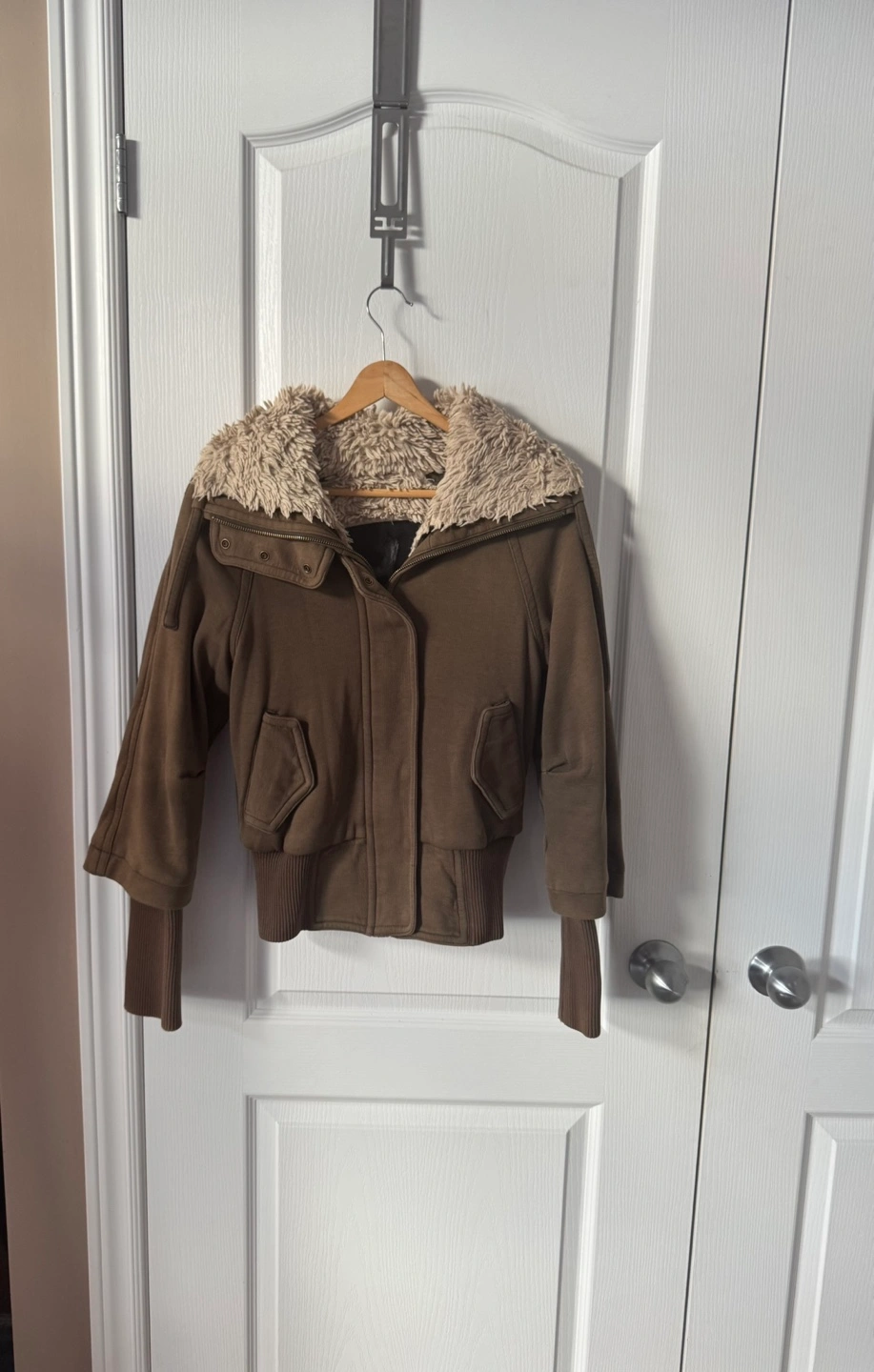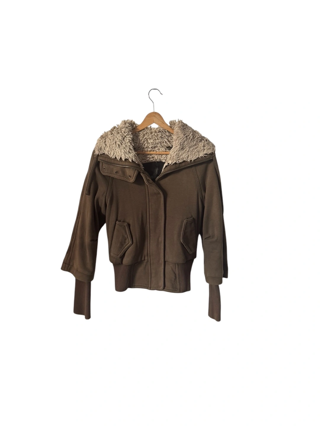 Green bomber jacket with a removable faux fur collar. Has a zipper and button closure. Pockets on the front.