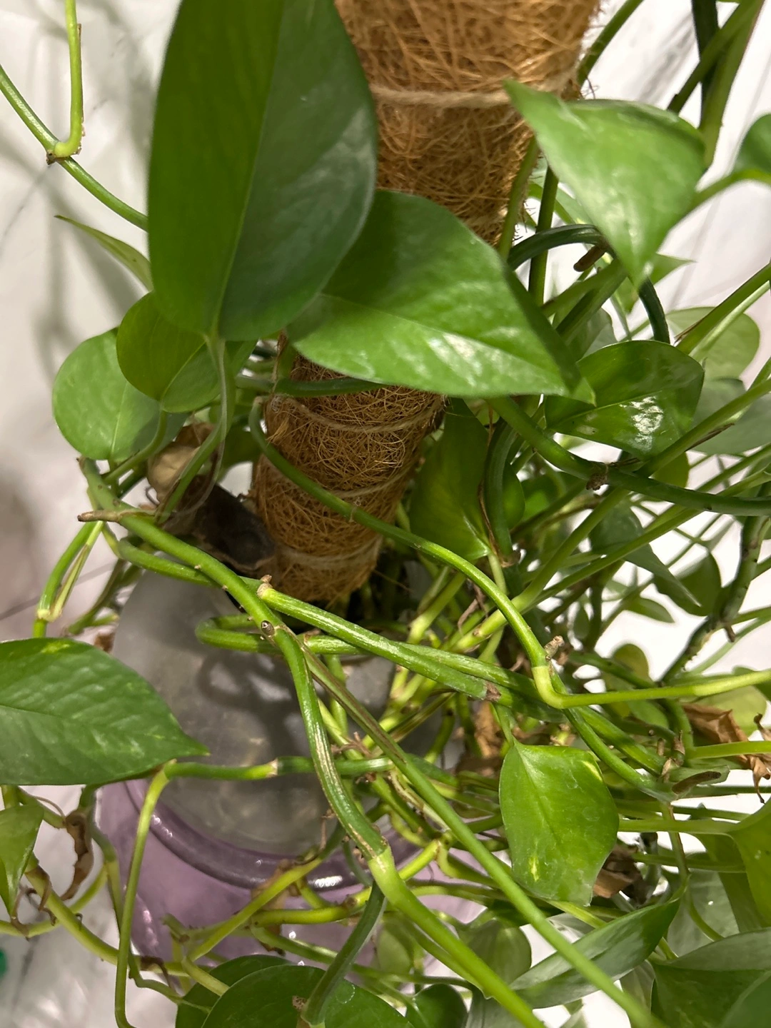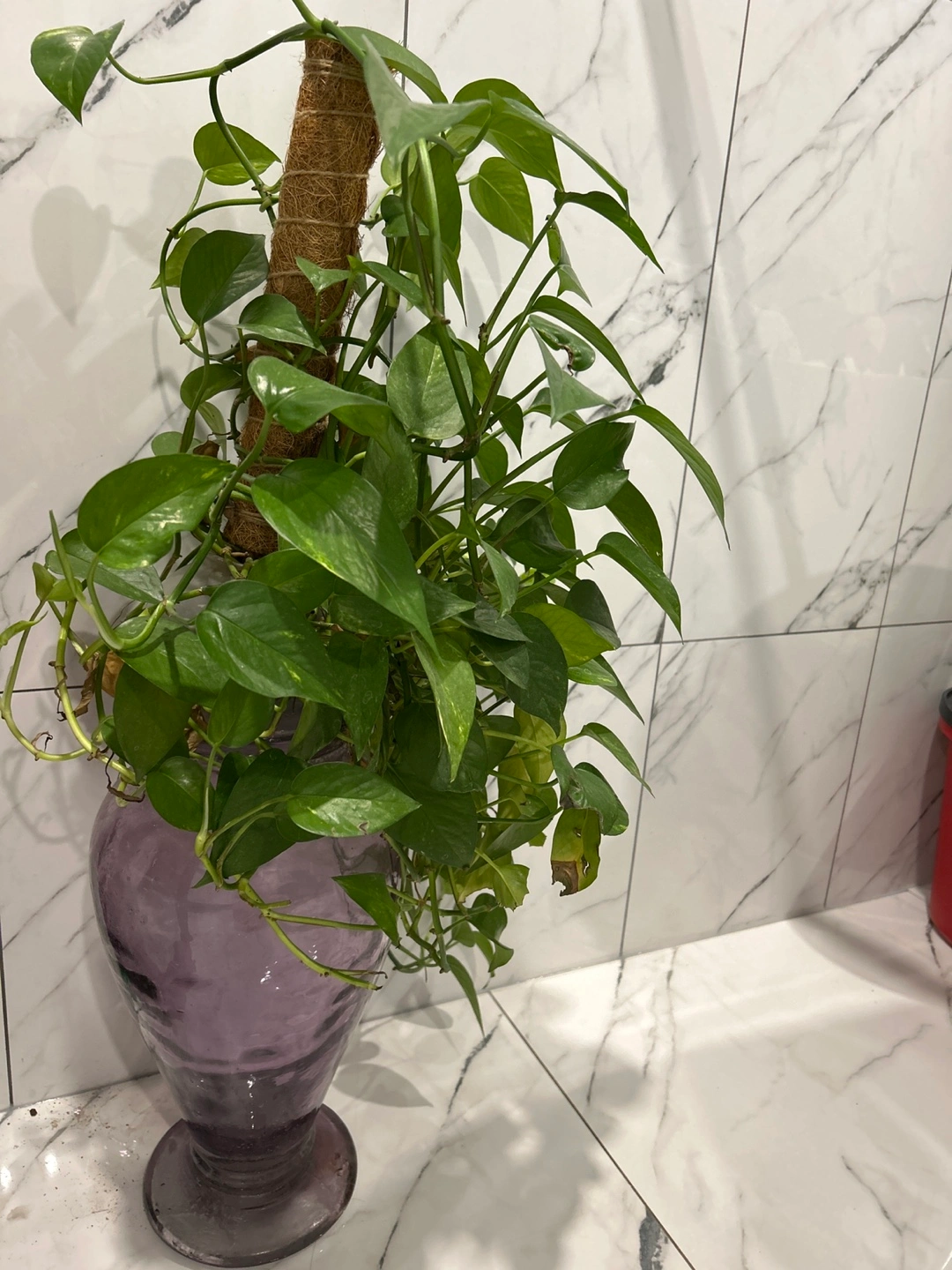 Large pothos plant in a purple glass vase. Healthy, mature plant. Well established with lots of growth.
