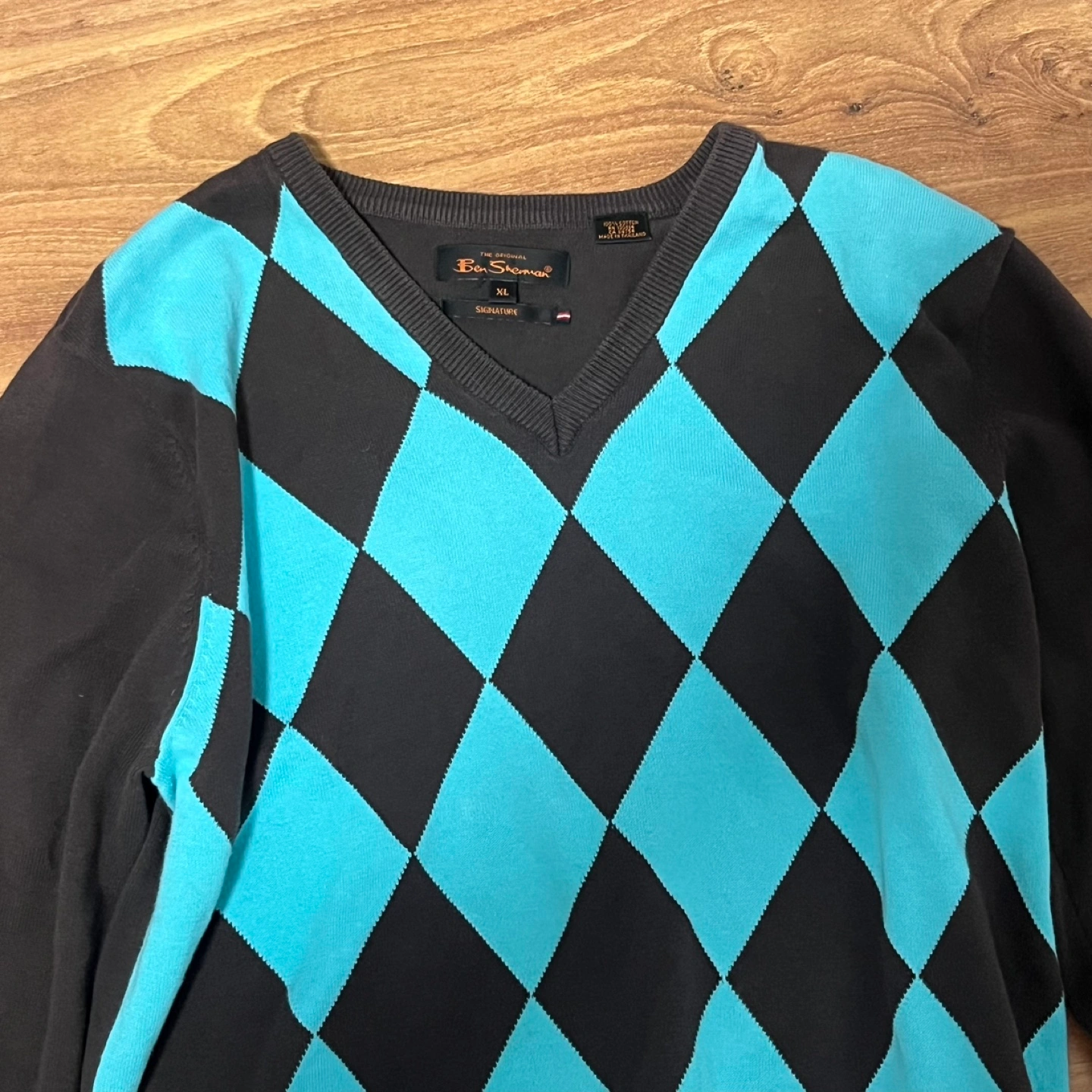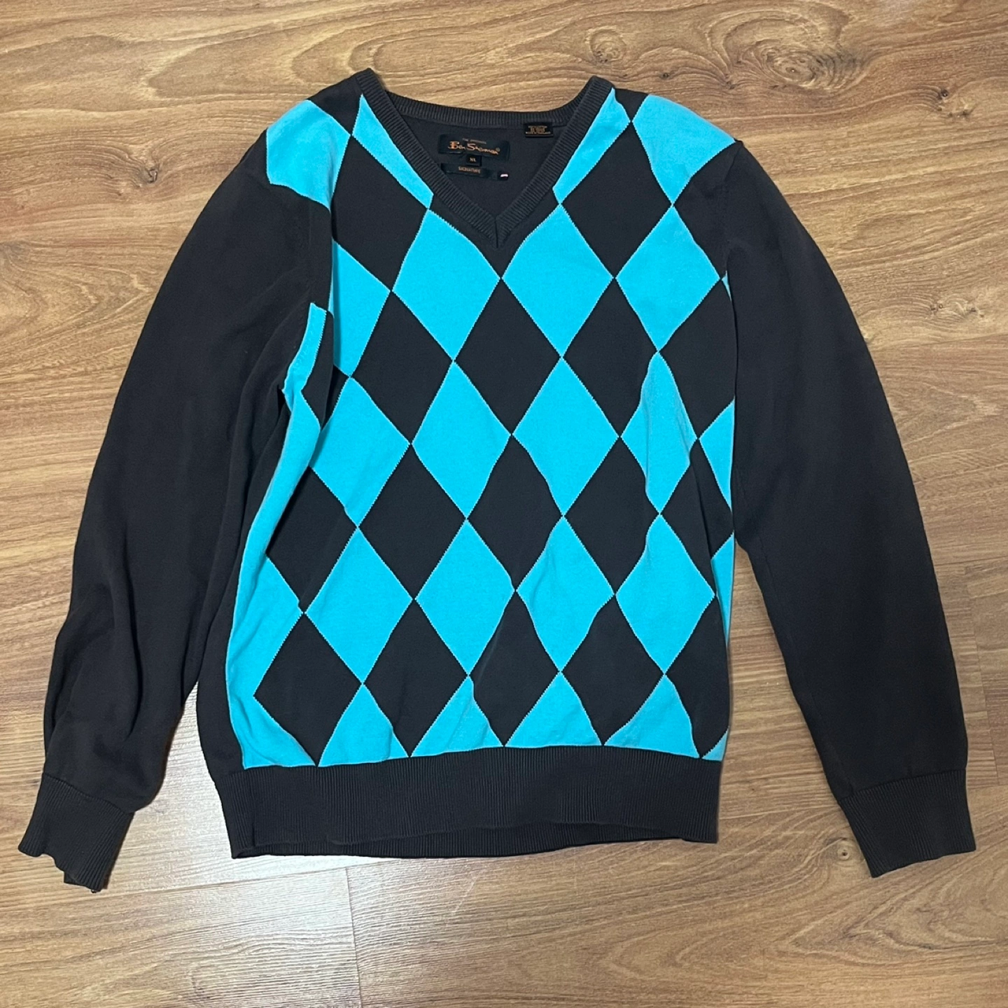 Brown and turquoise diamond patterned sweater. Labelled size XL but I think fits more like an L. Very comfy and unisex.