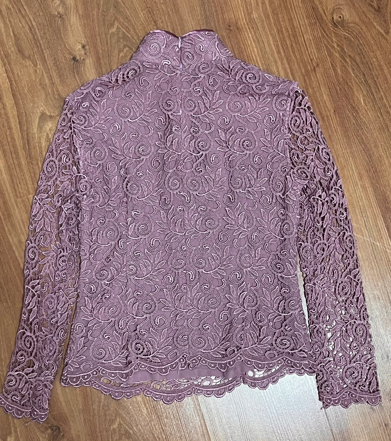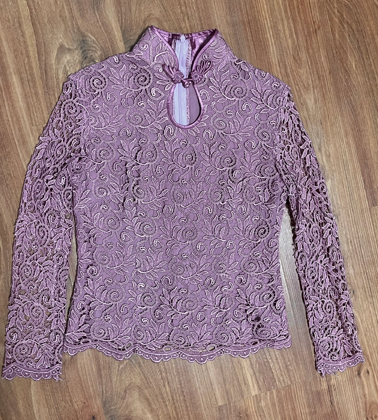 Long-sleeved, delicate lace top with a mandarin collar. Features a keyhole opening at the neckline and a zipper closure at the back. Arms are sheer but the torso part has a lining.