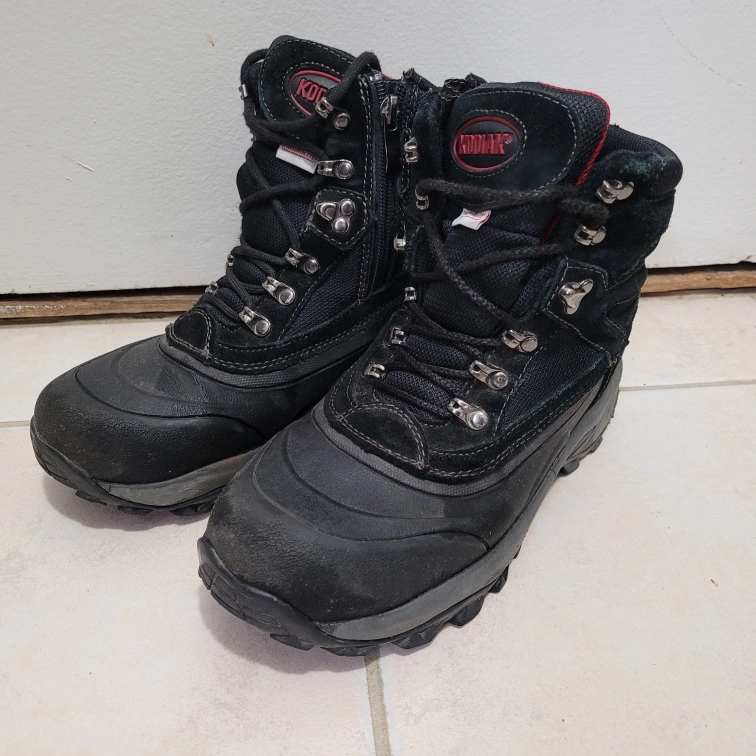 Thrifty sale! Black leather winter boots. Waterproof and have a side zipper. Used but in good condition. Unisex mens 7 women's 9 Pick up only Etobicoke Kipling and Eglinton area no PPU (high-rise) YES You MAY try them on first!