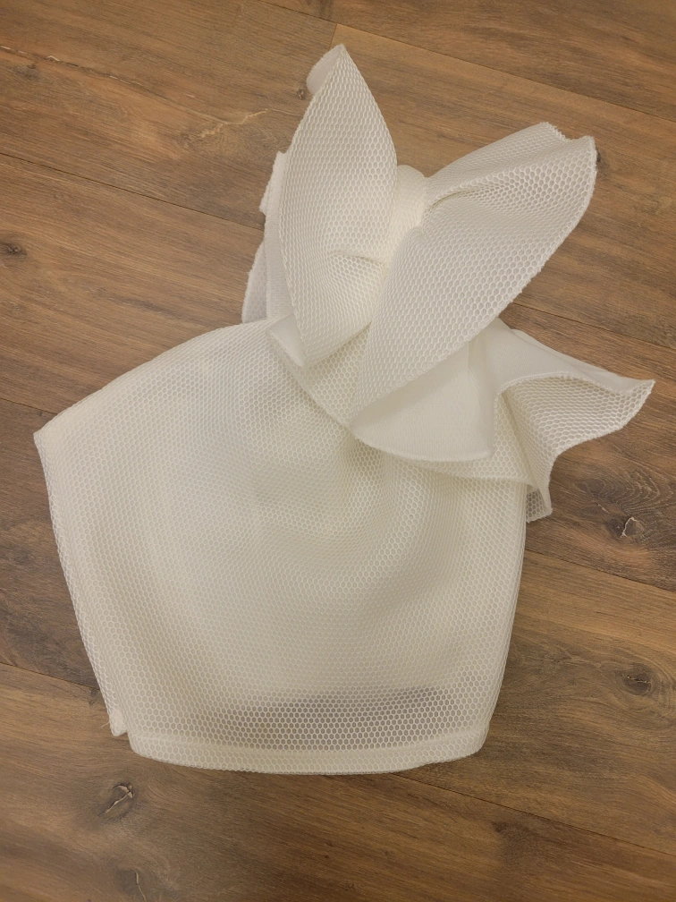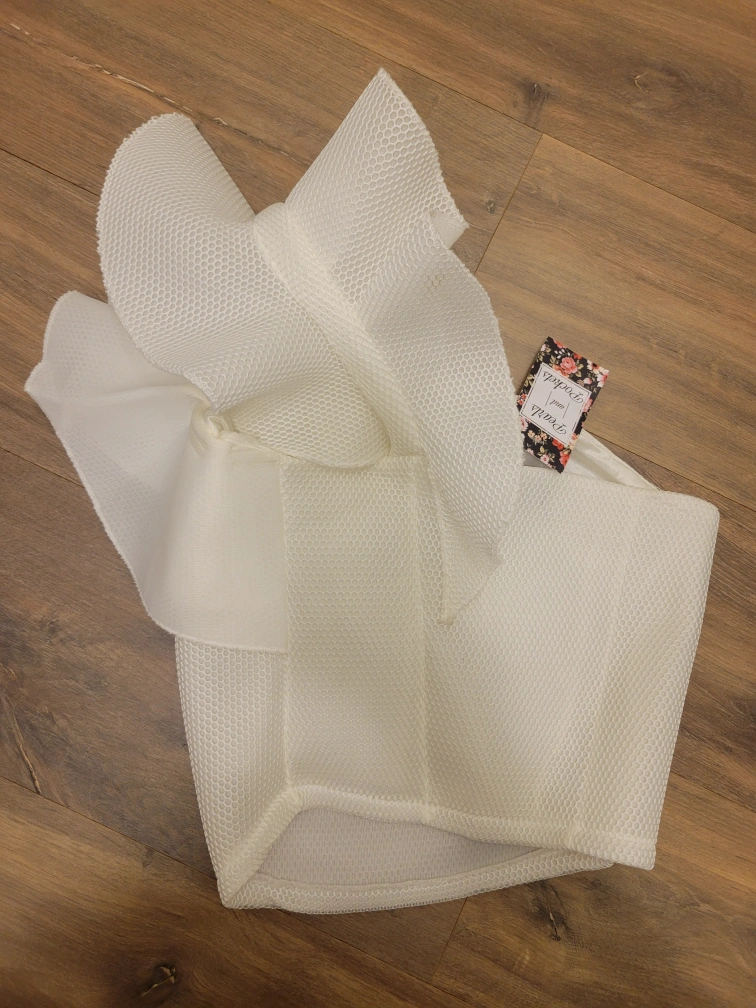 White one shoulder crop top with a ruffle detail. The top is made of a mesh material.