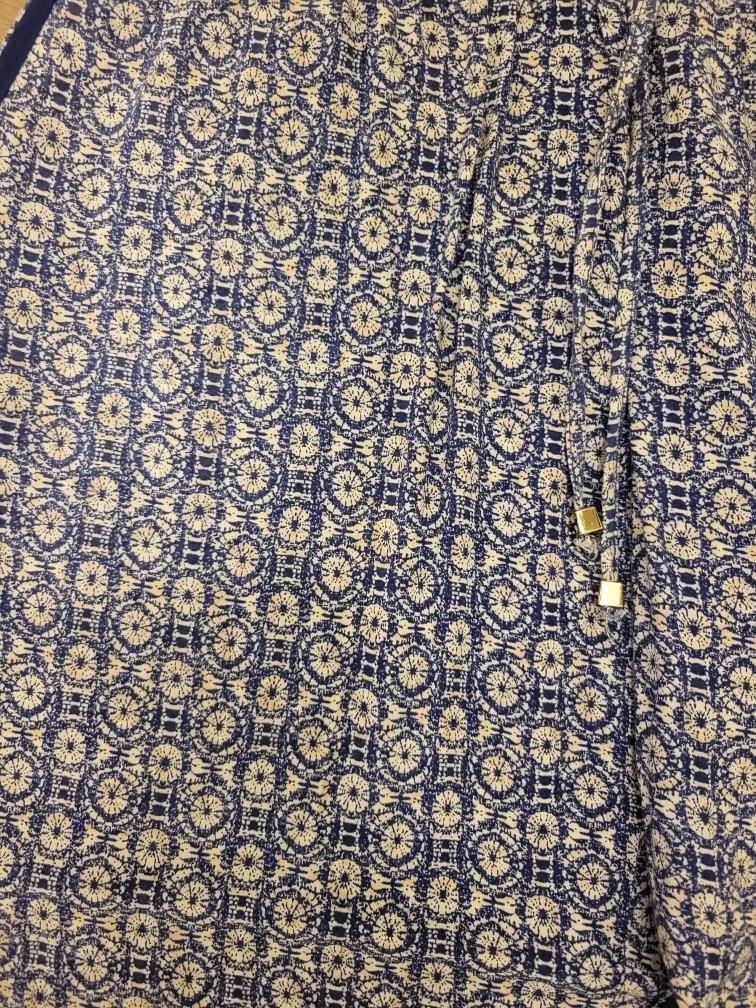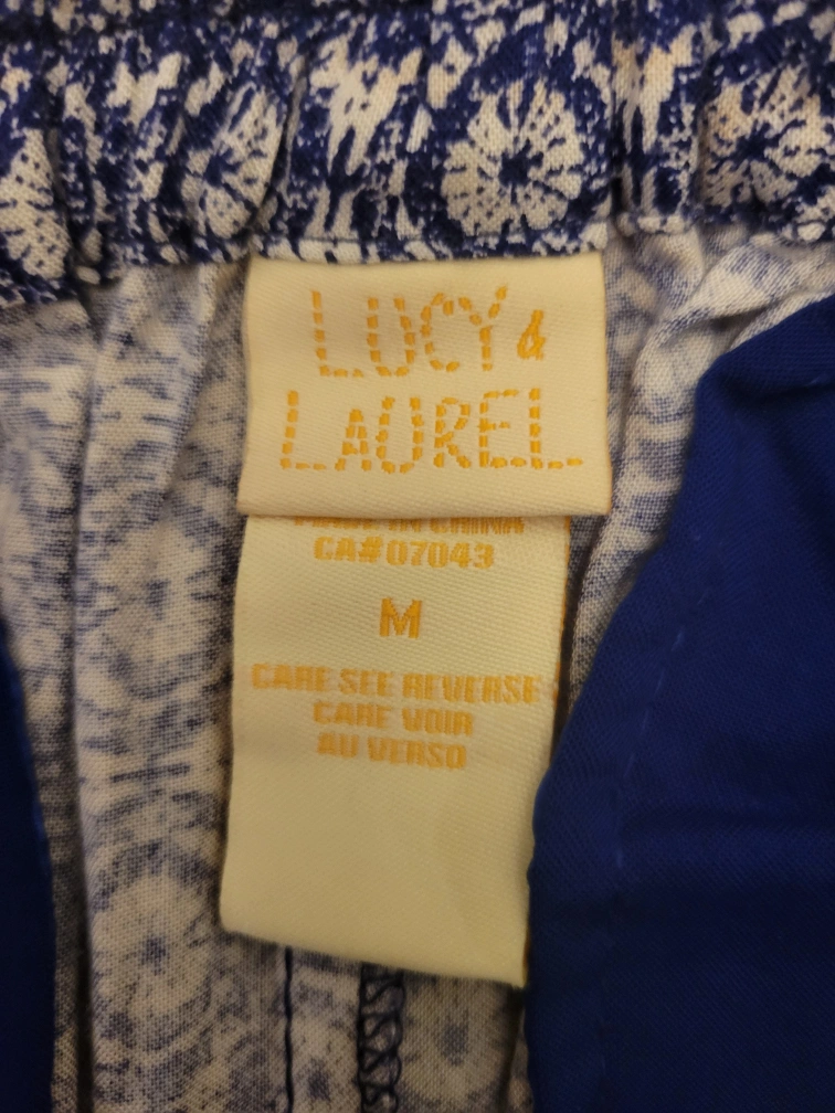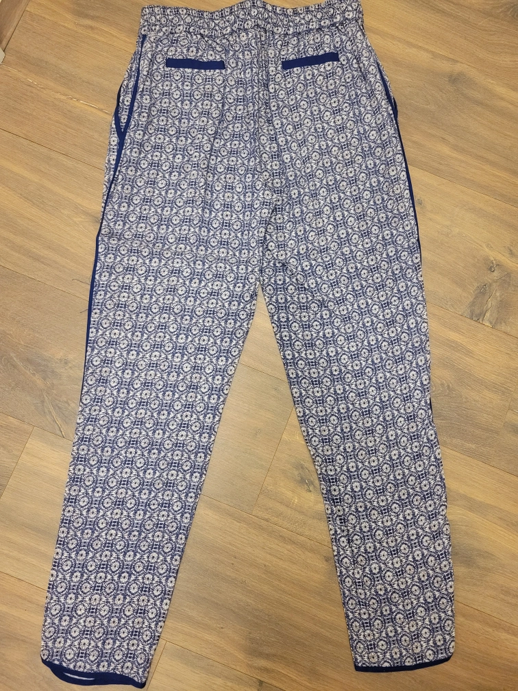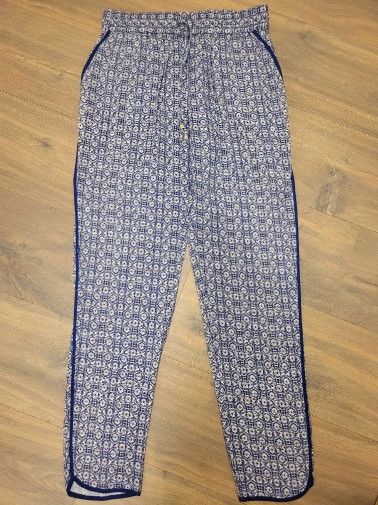 Blue and white floral print pants with drawstring waist and blue trim. Size M.