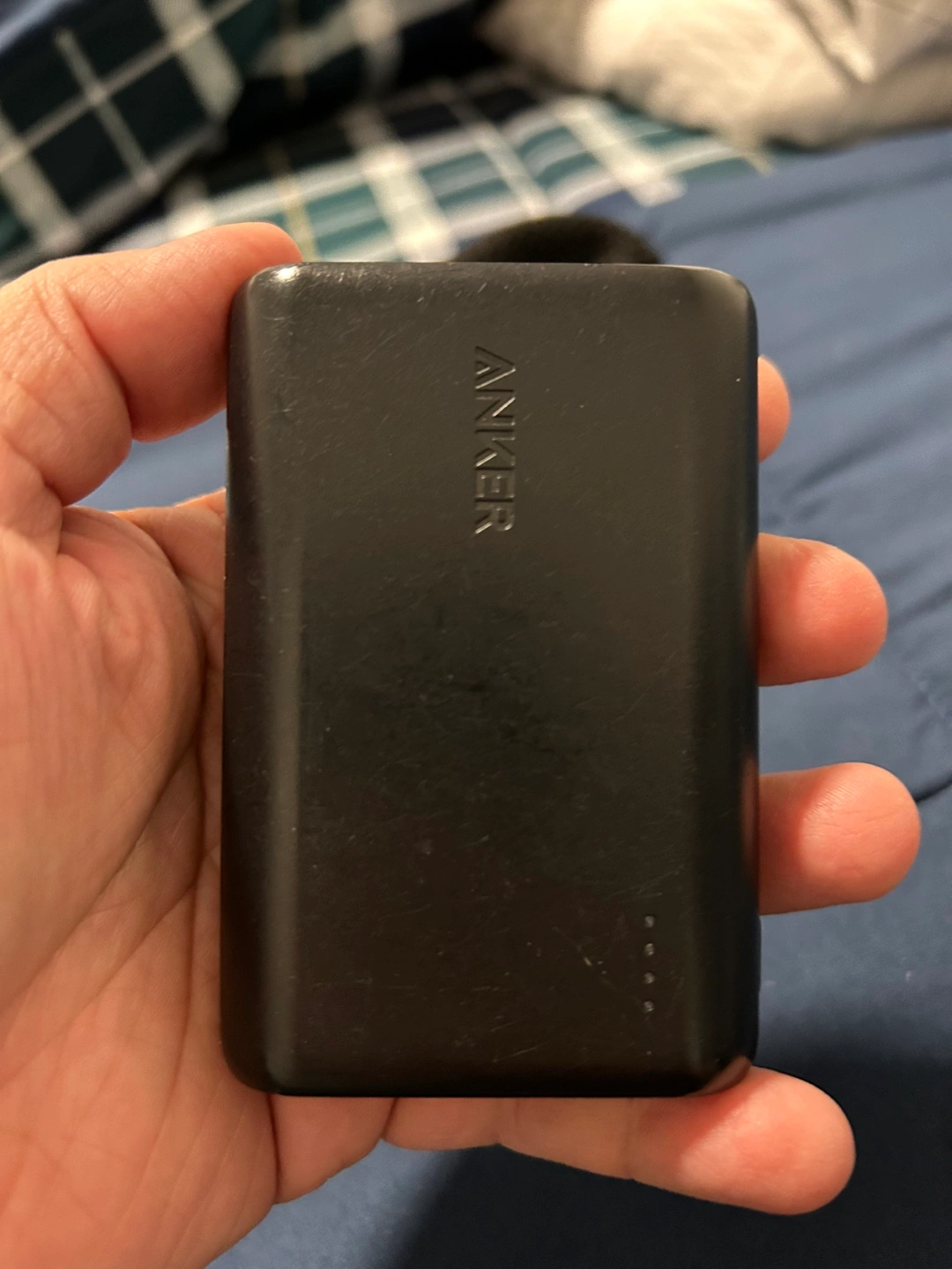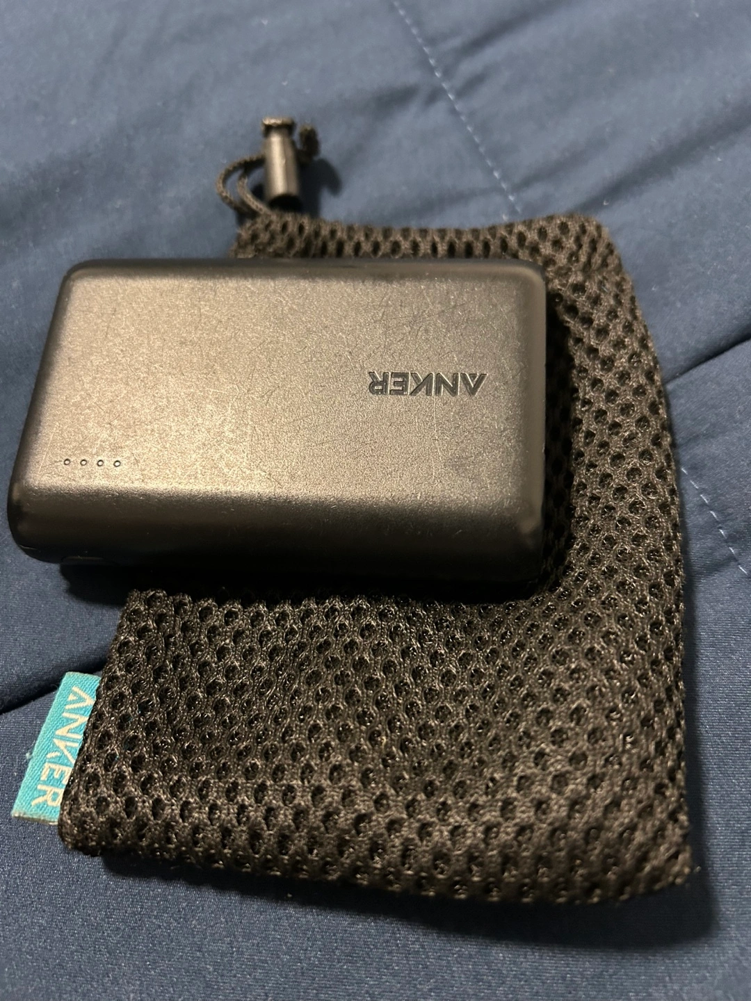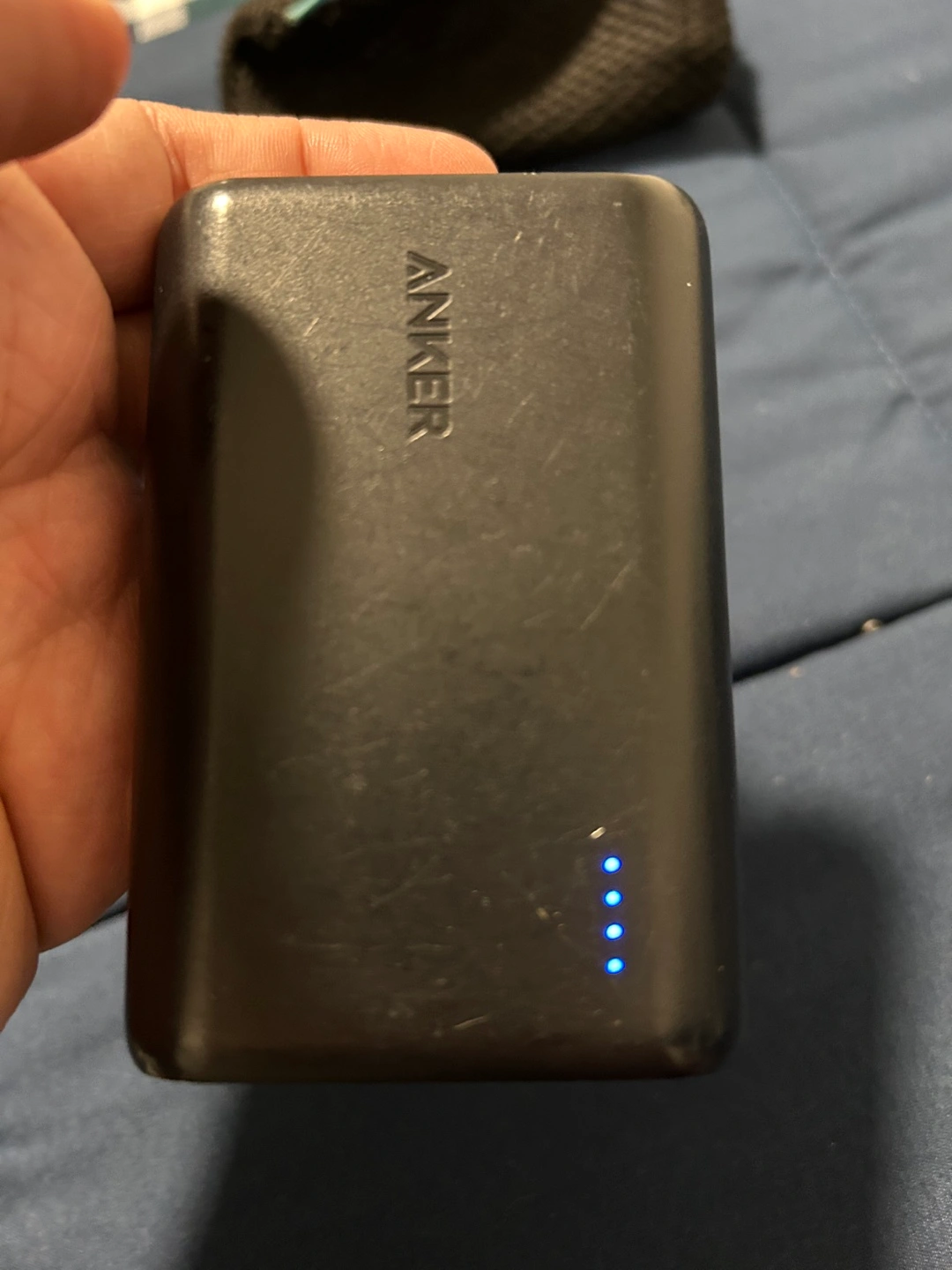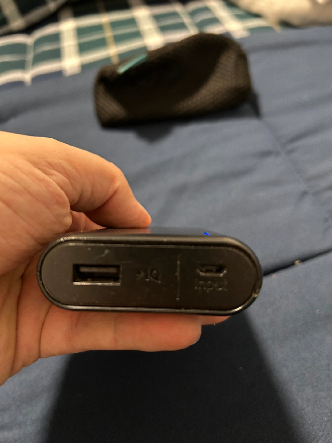 Black portable charger with a carrying case. Has 4 indicator lights and 1 USB output port. It has minor wear and tear.