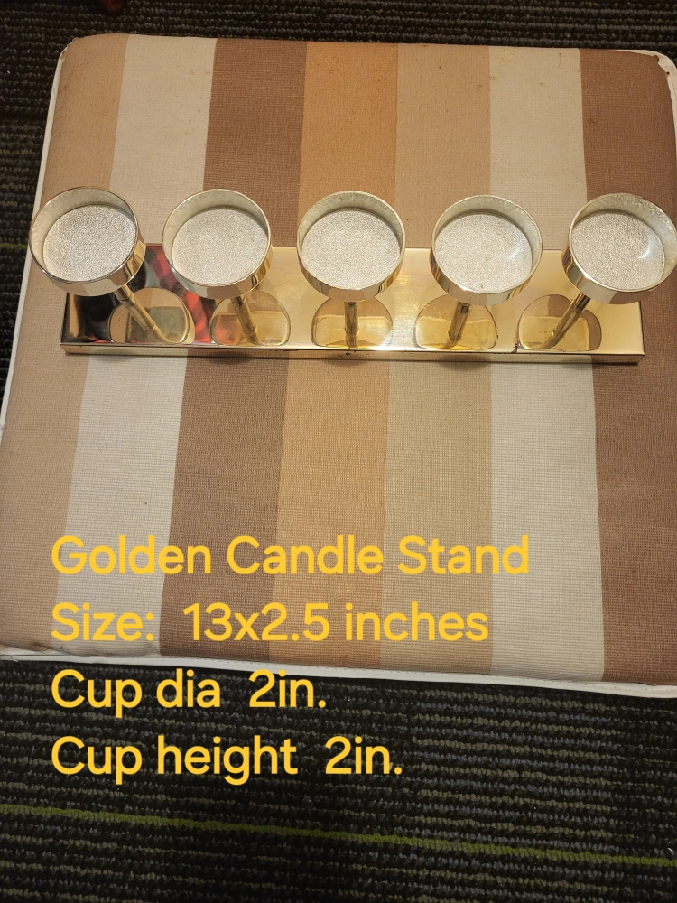Luxurious 5 candle holders Rail Set. Free standing Golden color. Great gift. Measures 13x2.5 inches. Each cup measures 2 inches in diameter and 2 inches in height. Meet Ups: 1. Tim Hortons at Jane Park Plaza 2. Any subway station from Kipling to young and Bloor station The original price is way more + Tax Here, Price is the lowest/firm to go away faster. Please call/ text for a faster response. 647 855 6217 NOTE: If u like, please see my other ad postings. Leather shoes, dress shirts, dress pants, jeans, Tennis/Squash Badminton Rackets, Exercise/Bike stuff, and more….. Mostly, brand name stuff is new or like new to go away in about half price. Thanks for your time.