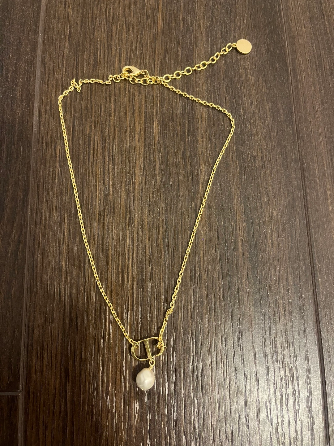 Gold chain necklace with pearl and a charm. Chain is about 16 inches long.
