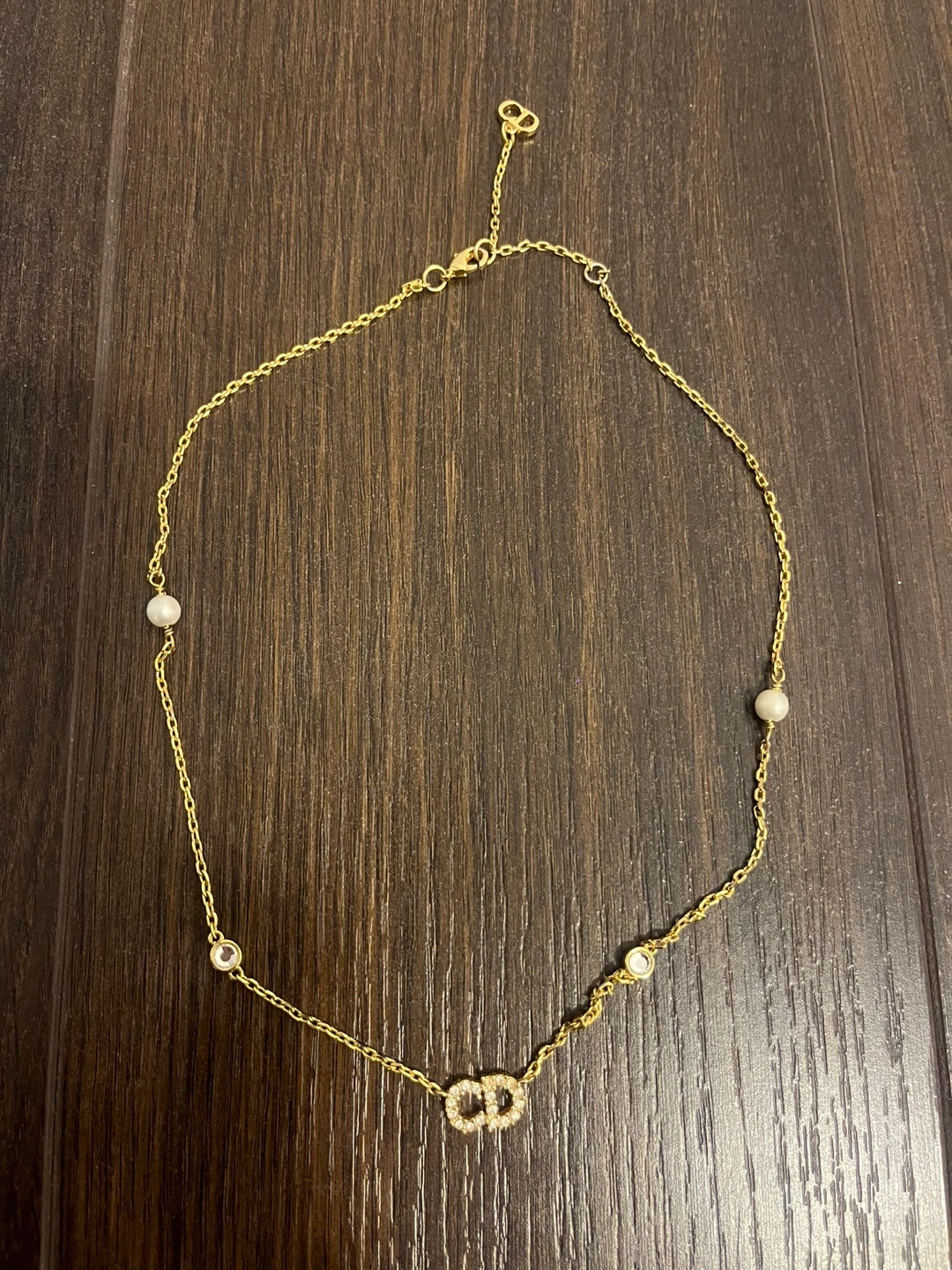 Gold chain necklace with two pearls and a Dior charm. The charm is encrusted with rhinestones.