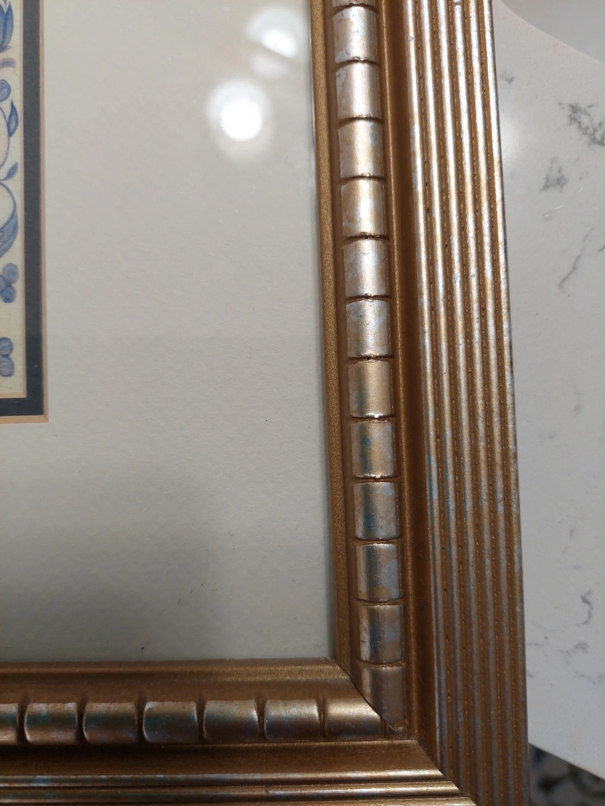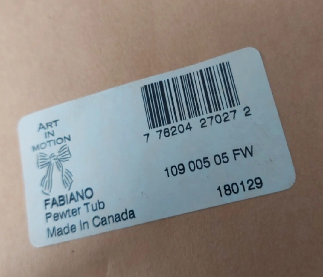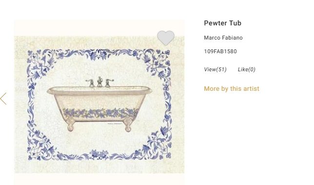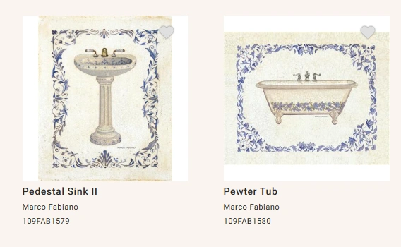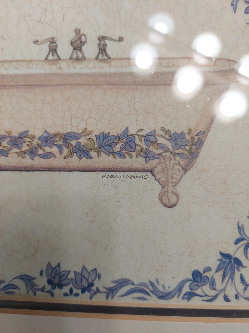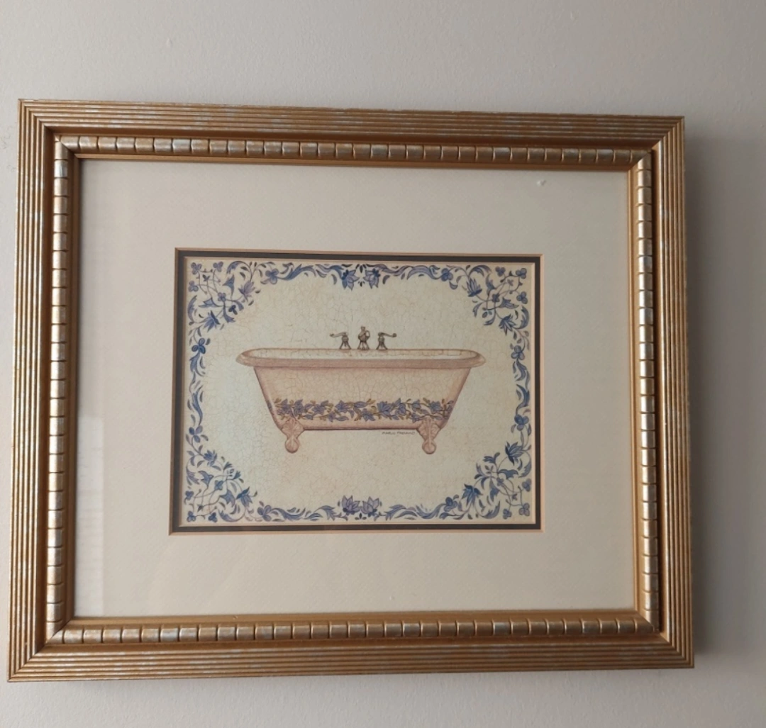 Framed art print of a pewter bathtub, with blue floral accents. The print is made in Canada and measures 13 inches by 17 inches.
