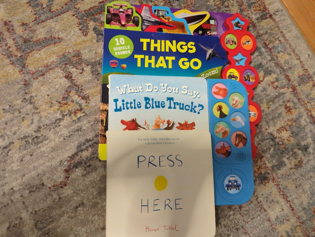 Three board books, two are sound books. all activity books. decluttering Board Book Bundle: Things That Go rumble vroom zoom What Do You Say, Little Blue Truck? Press here