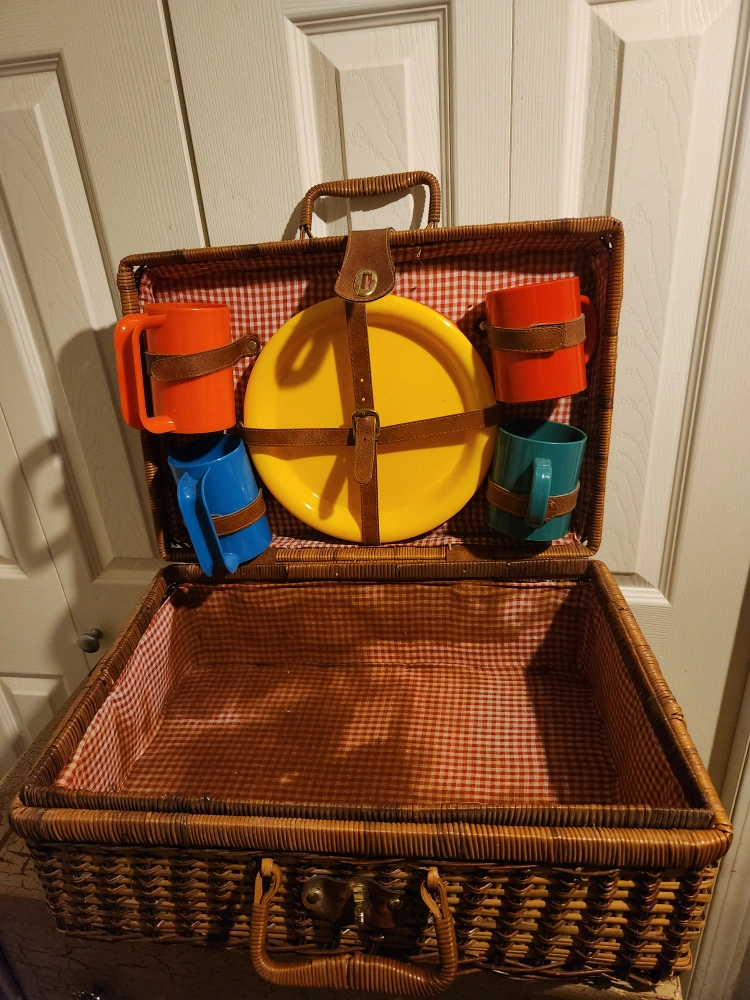 Wicker picnic basket with leather handles and a red and white checkered lining. Includes a yellow plate and four mugs.