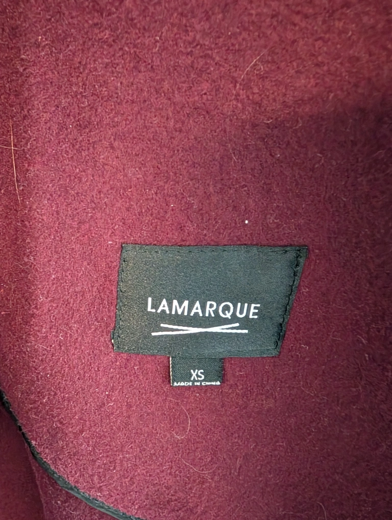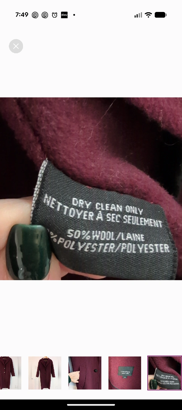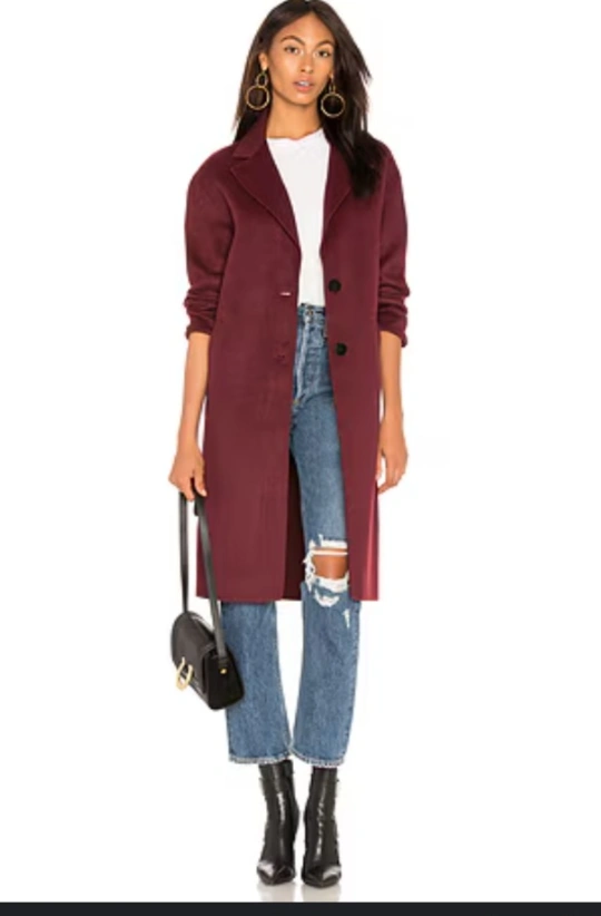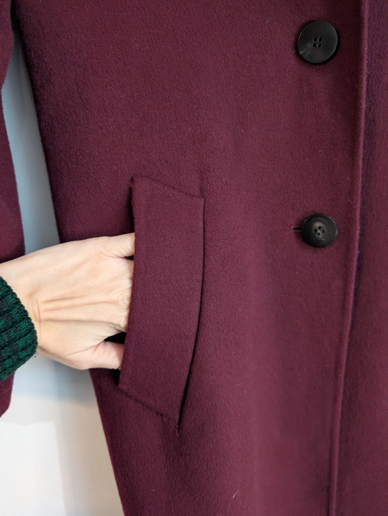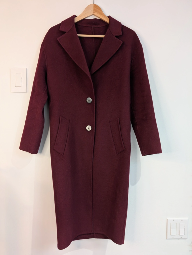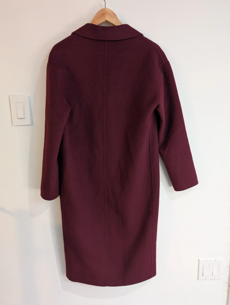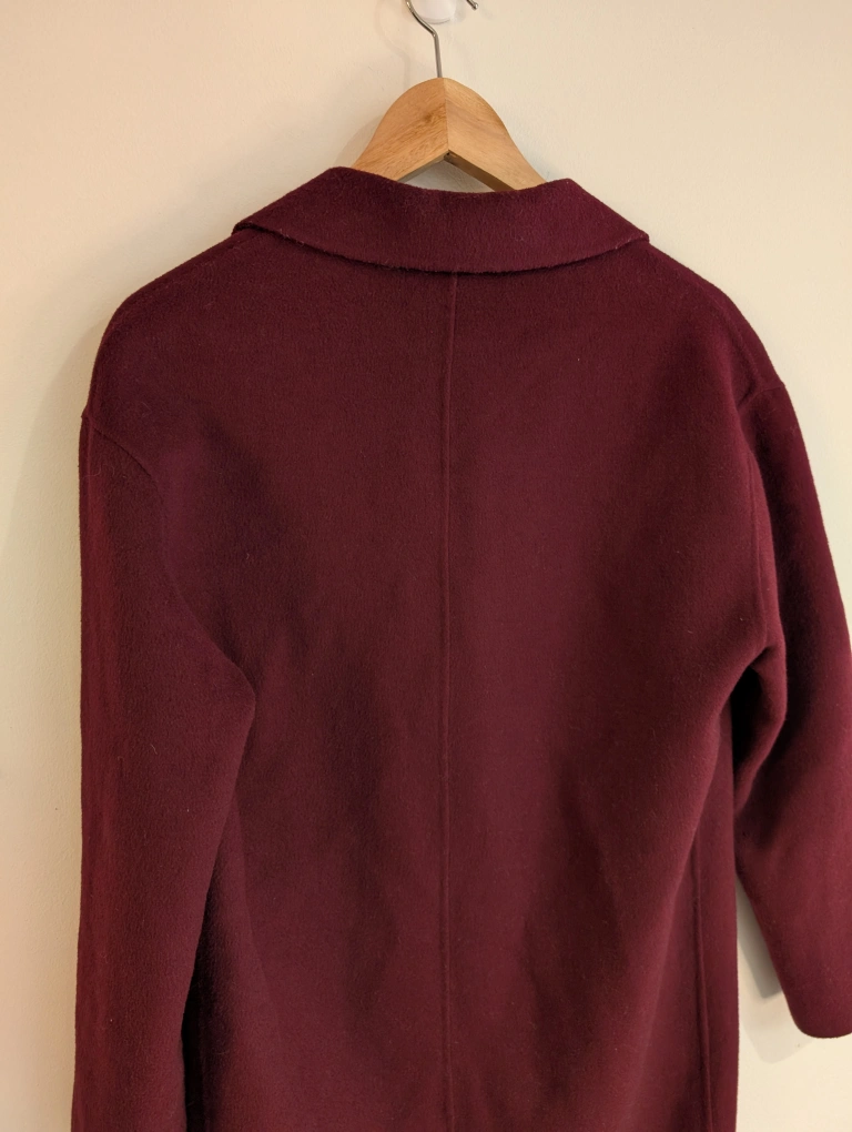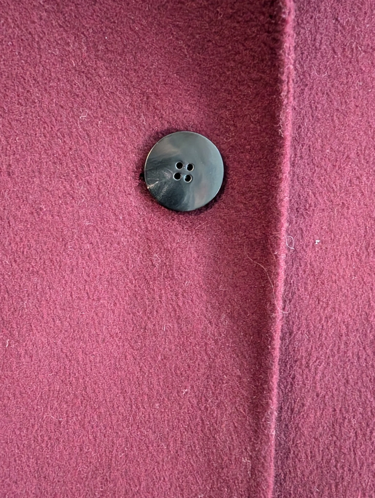 Elegant wool coat in a rich burgundy color. Features a stylish 2 black button detail. 2 pockets. Perfect for a sophisticated look. light weight perfect for fall or spring on its own or a nice layer piece for winter, it would be good going from your car to your destination or if you are going shopping. shoulders 19' pit to pit 19.5" waist 18" hips 19" length 42" good used condition. I love this coat, only selling because it no longer fits 😠retails $845