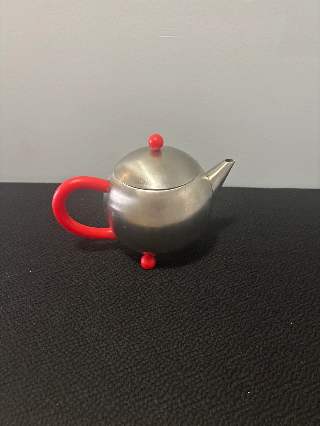Stainless steel teapot with a red handle and red accents. Includes a lid. Great for tea lovers.