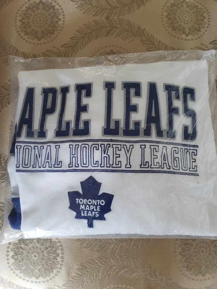 White jersey with blue and grey accents. Features the team logo and NHL branding. Size L, it's been used once.
