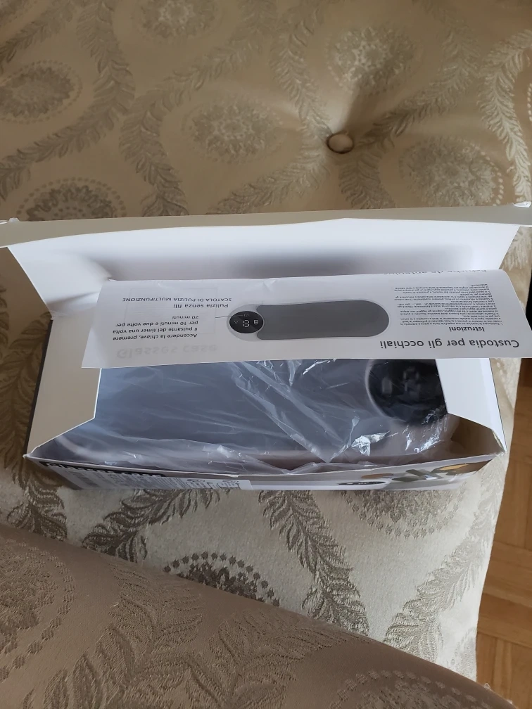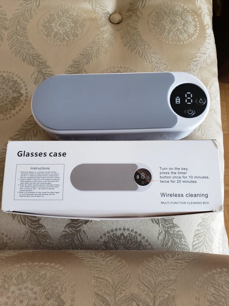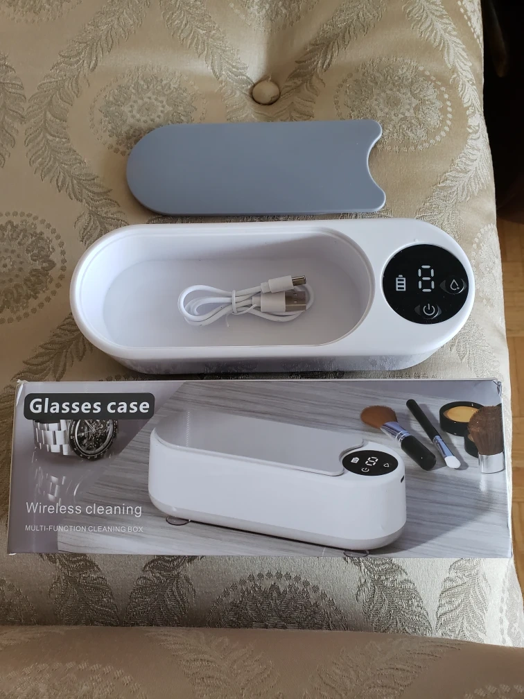 Wireless cleaning box. Includes a charging cable. Turns on and uses a timer for 10 or 20 minutes. Great for jewelry, coins, glasses etc.