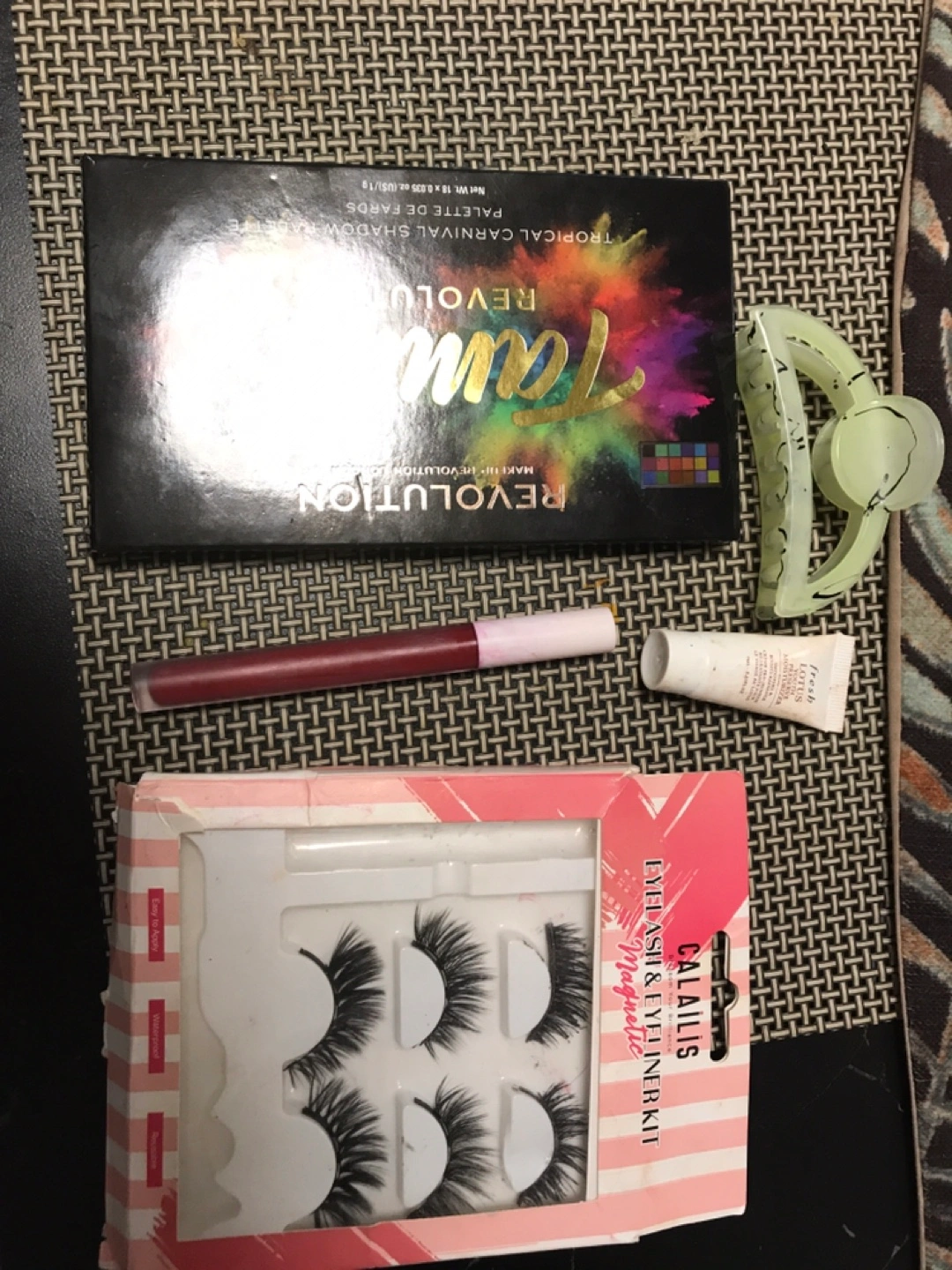 Bundle includes a Revolution Tropical Carnival eyeshadow palette, a black liquid eyeliner, and a set of magnetic eyelashes with an applicator. I want to trade this for snacks or chocolates and brownie or cake mixes Message for more details π