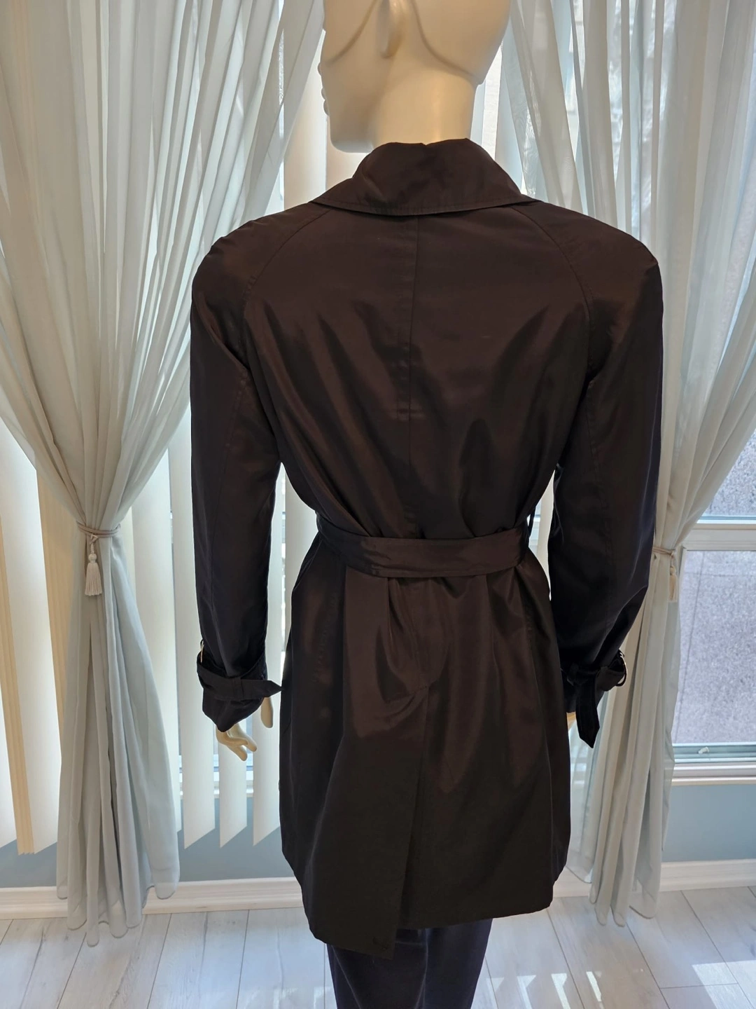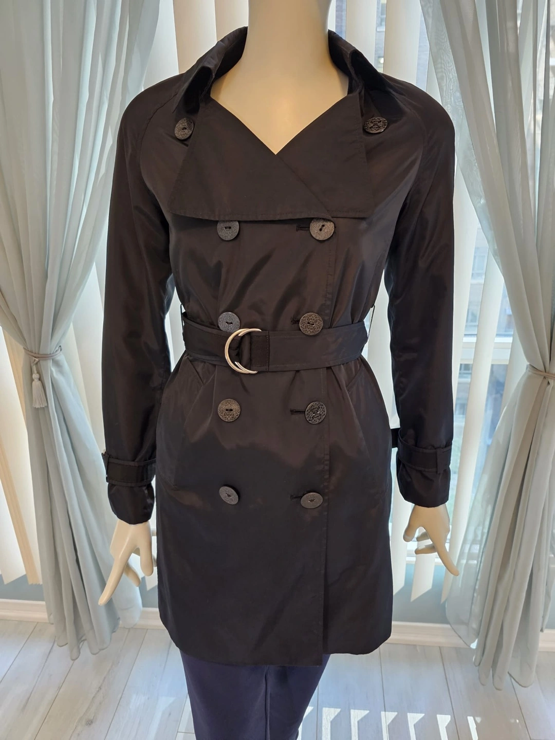 Black trench coat with a belt, double-breasted, long sleeves, and button closures. The coat has a collar that can be worn up or down. In pristine condition