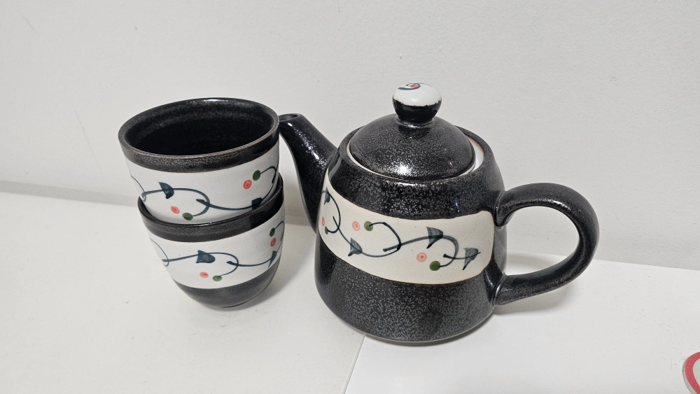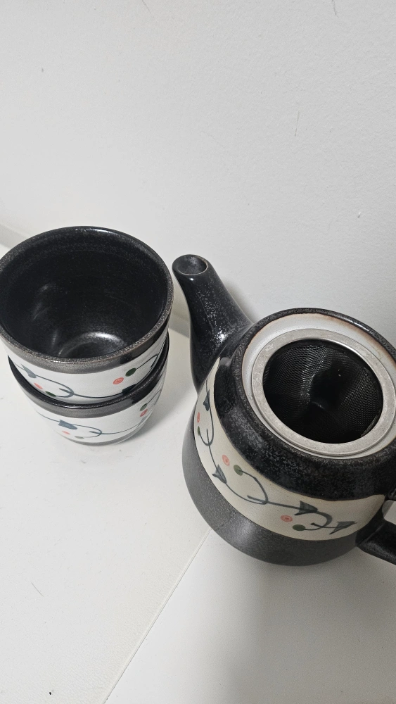 NEW Black teapot with a white and green vine design and two matching cups. Includes a built-in strainer.