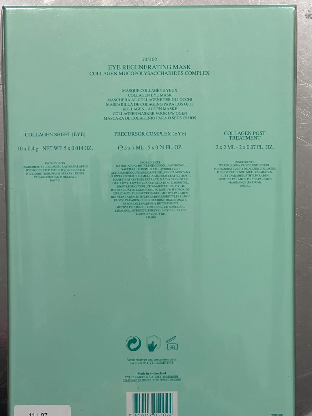 Brand new sealed box Valmont Eye Regenerating Mask Collagen Mucopolysaccharides Complex, made in Switzerland. Includes 10 x 0.4g Collagen Sheet (eye) + 5 x 7ml Precursor Complex (eye) + 2 x 2ml Collagen Post Treatment. Retails over $480 plus tax!! Inspired by Valmont's medical origins, this regenerative eye mask treatment with collagen imbues the skin with reparative dermo-tensor collagen so that it intensely hydrates, soothes and smooths wrinkles and fine lines in only 20 minutes. The eye area is left sparkling and well rested thanks to decongesting ingredients that reduce puffiness and dark circles and activate microcirculation. This mask is suitable for all skin types and can be used as a one-off beauty treatment or as a five week therapy. Soothe and de-puff the eye contour area with this deeply moisturizing mask. Only 20 minutes to a fresher, brighter look with reduced dark circles!