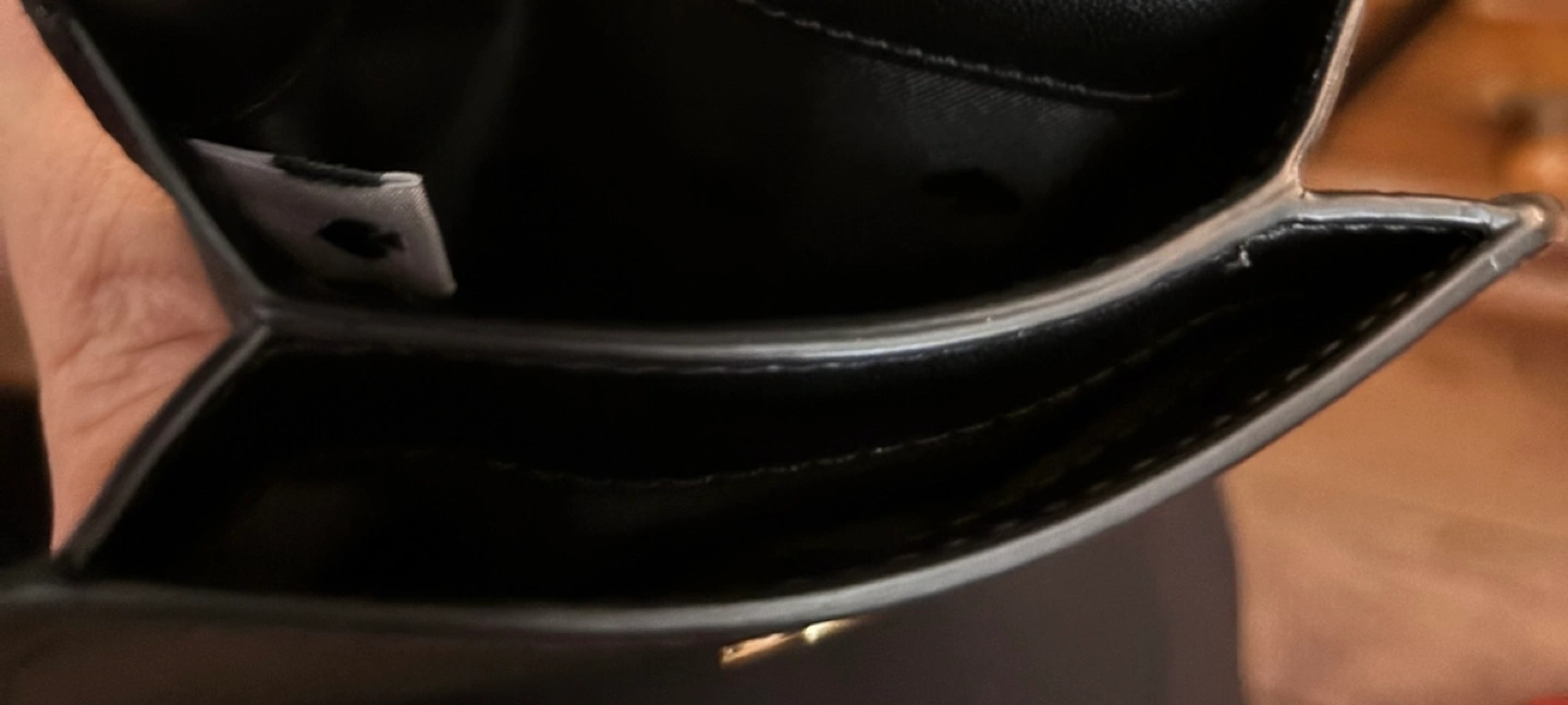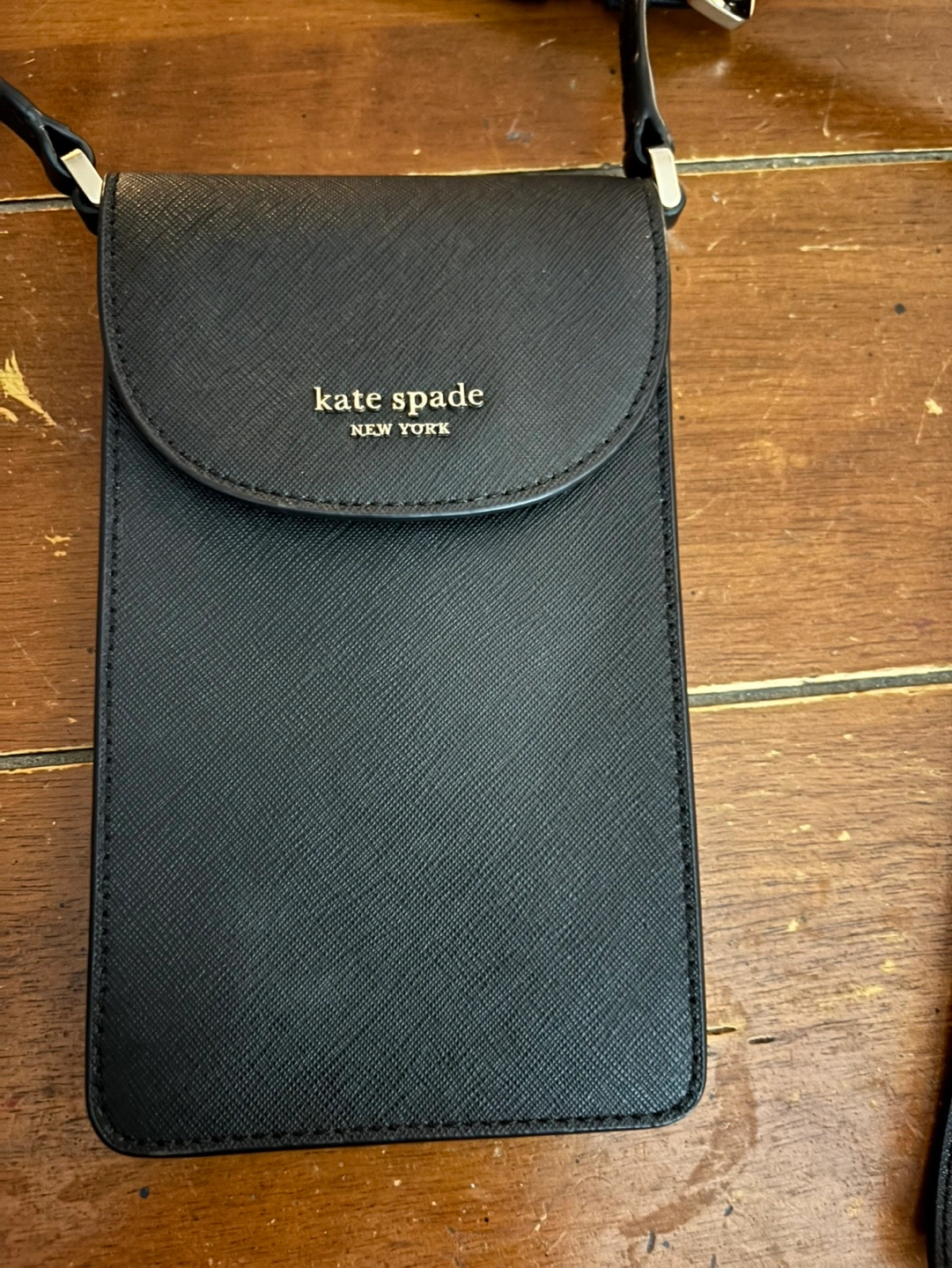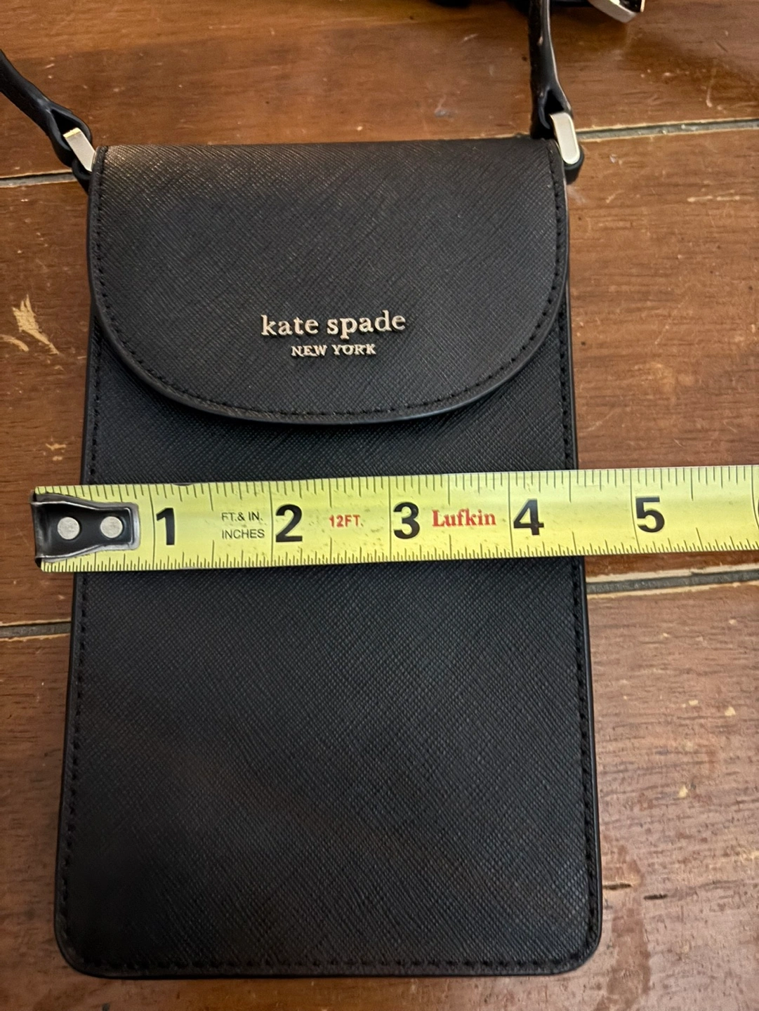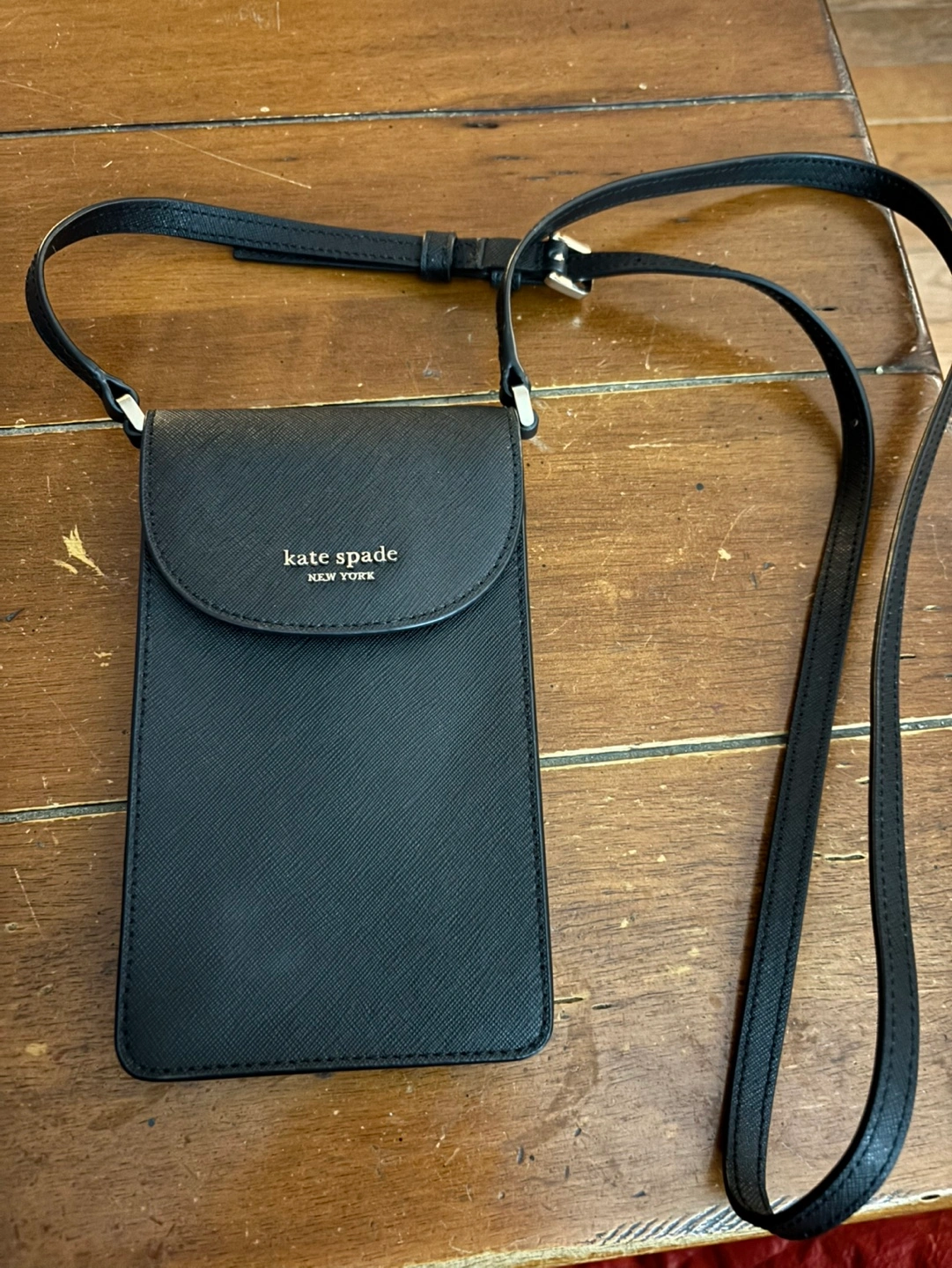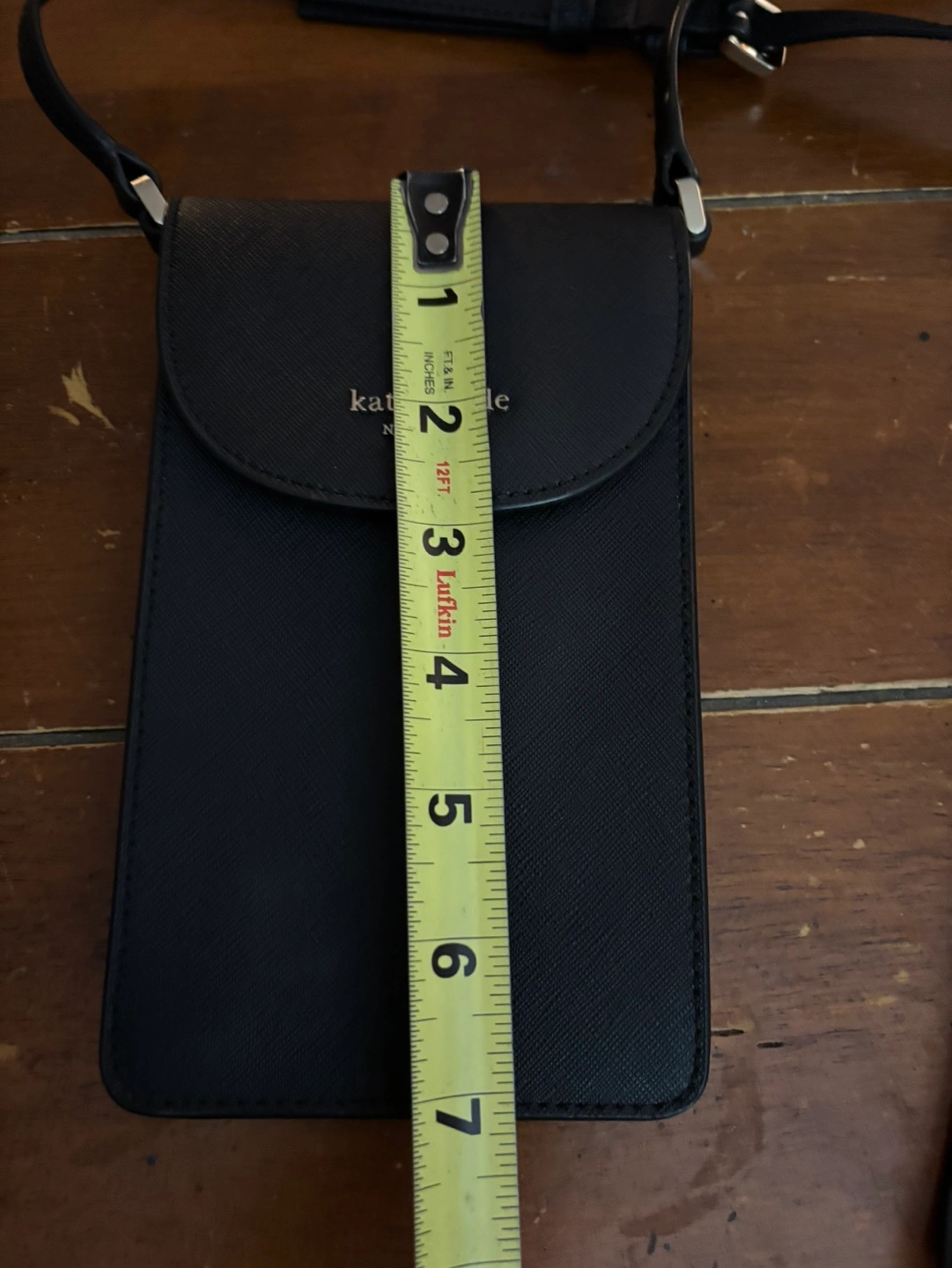 Black crossbody bag with a small flap pocket. It has a long adjustable strap and is about 7 inches tall. Like new