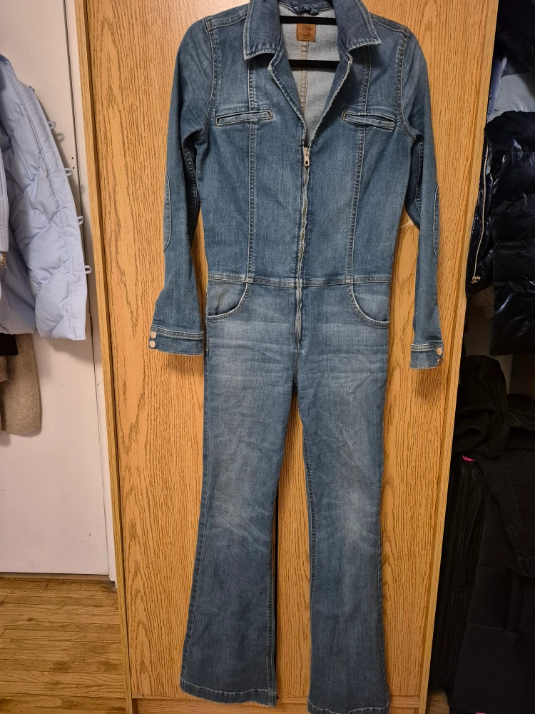 Blue denim jumpsuit with a zip up front. Long sleeves, pockets and flared legs.