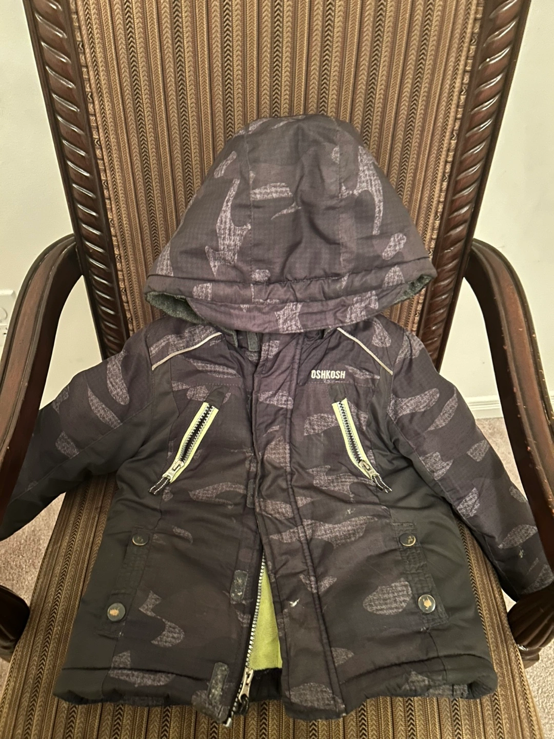 Black winter jacket with a camo pattern. Has a hood and zipper closure. Size: 3T