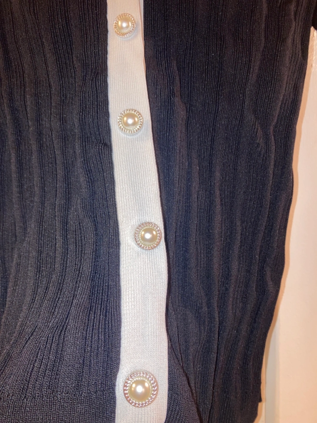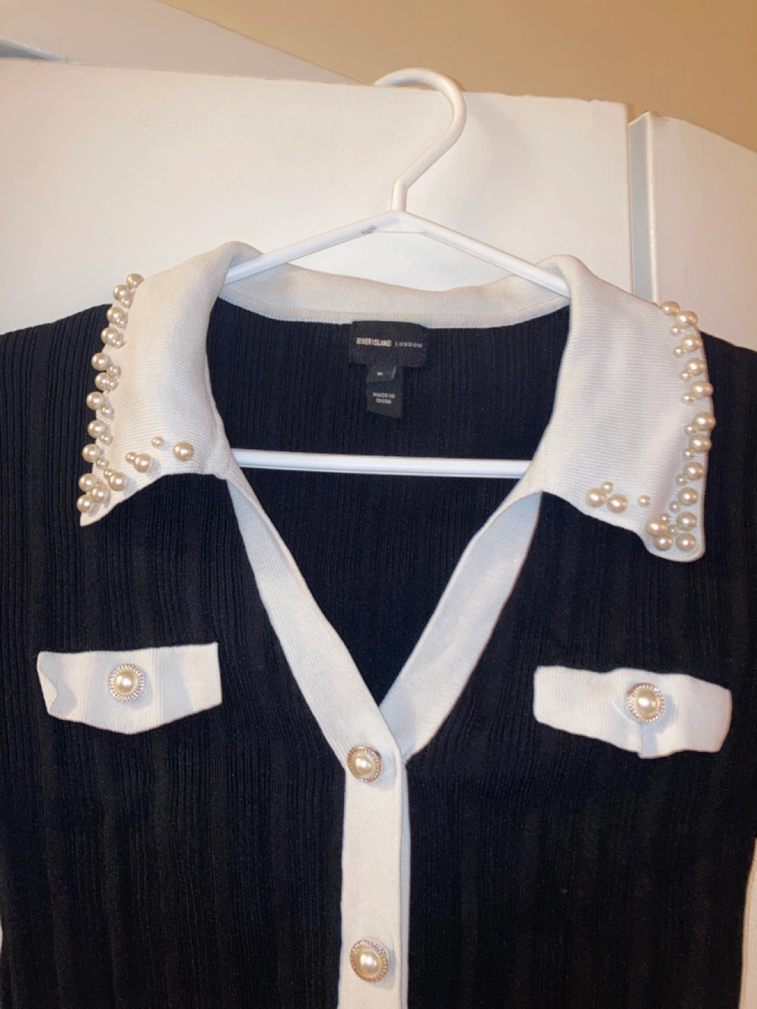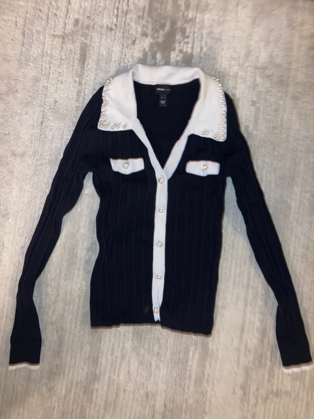 Long-sleeved cardigan with a white collar and pearl trim. Button-up front. Super cute with dress pants or jeans for any occasion Brand: River Island London Size 8, eur 34 Worn twice. Pickup Hurontario and Dundas in Mississauga. Cash only.