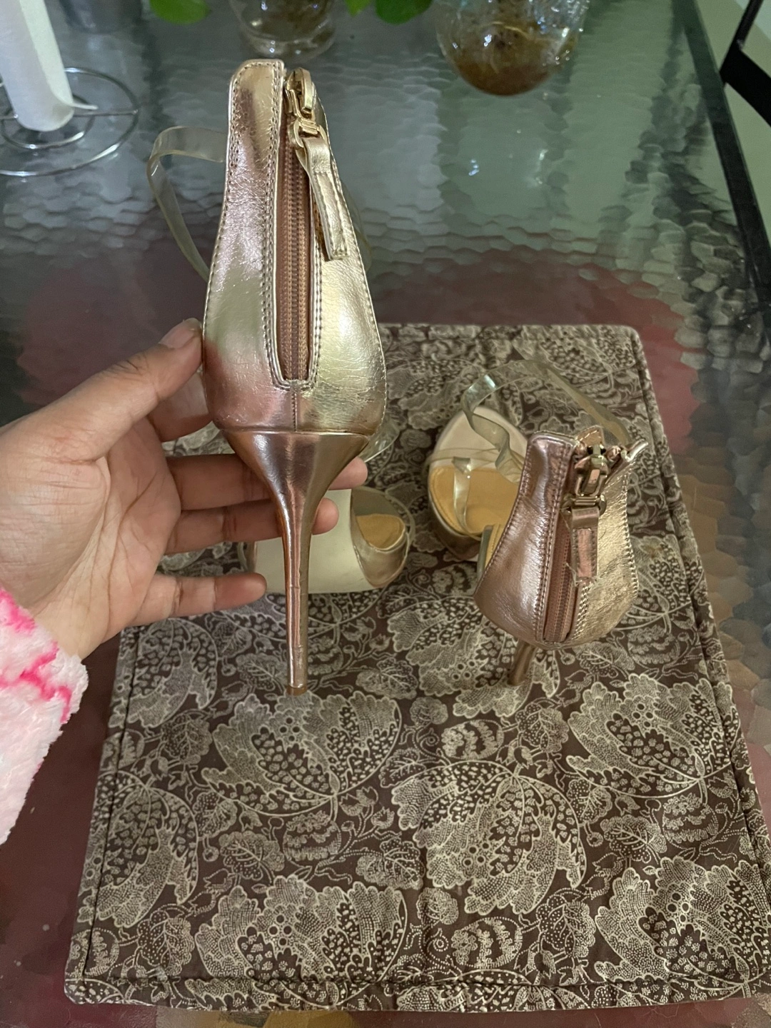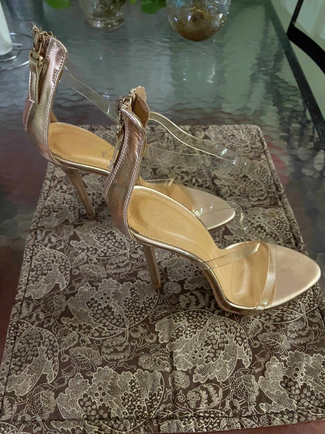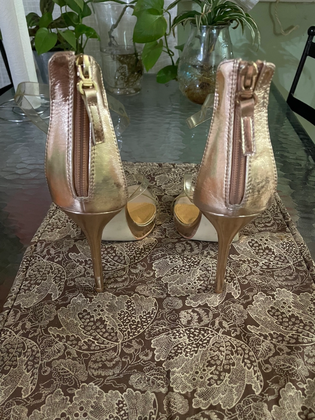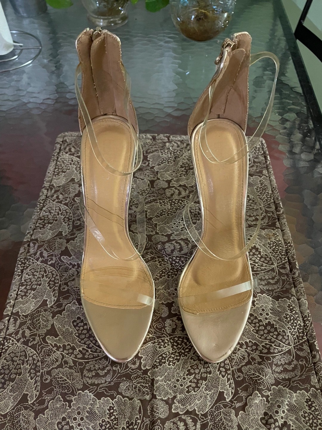 Gold heels with clear straps and a zipper on the back. Lightly worn, like new condition! Size 9