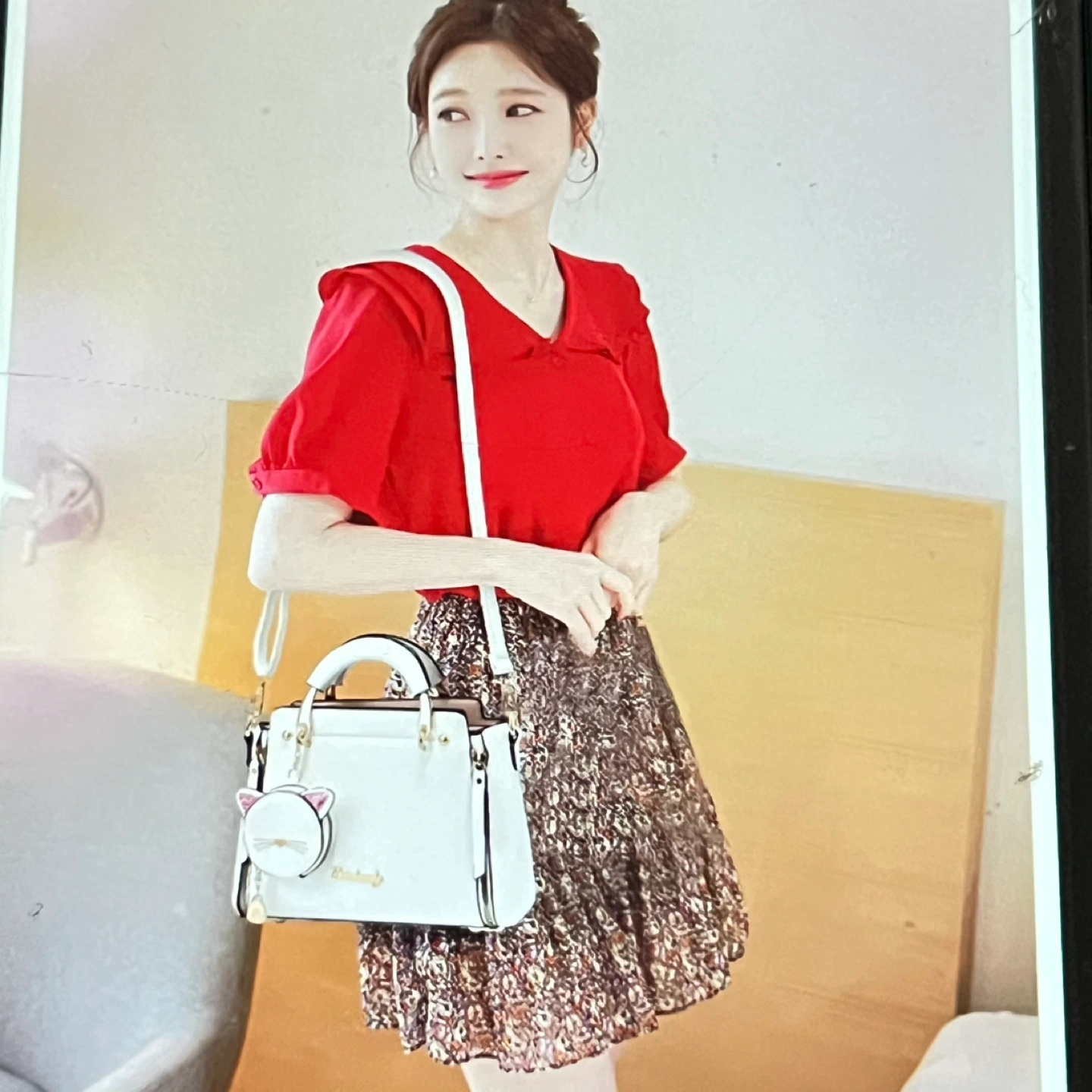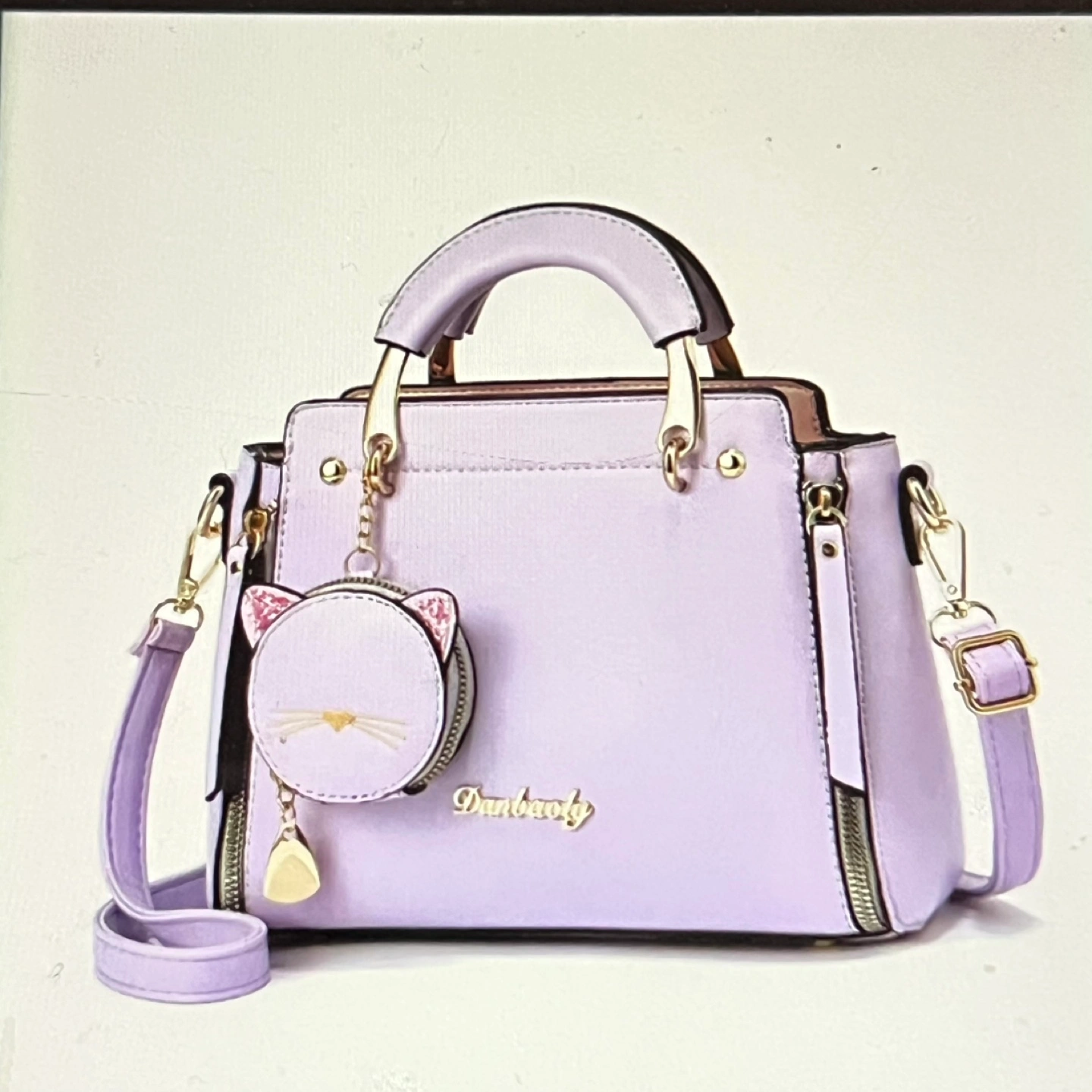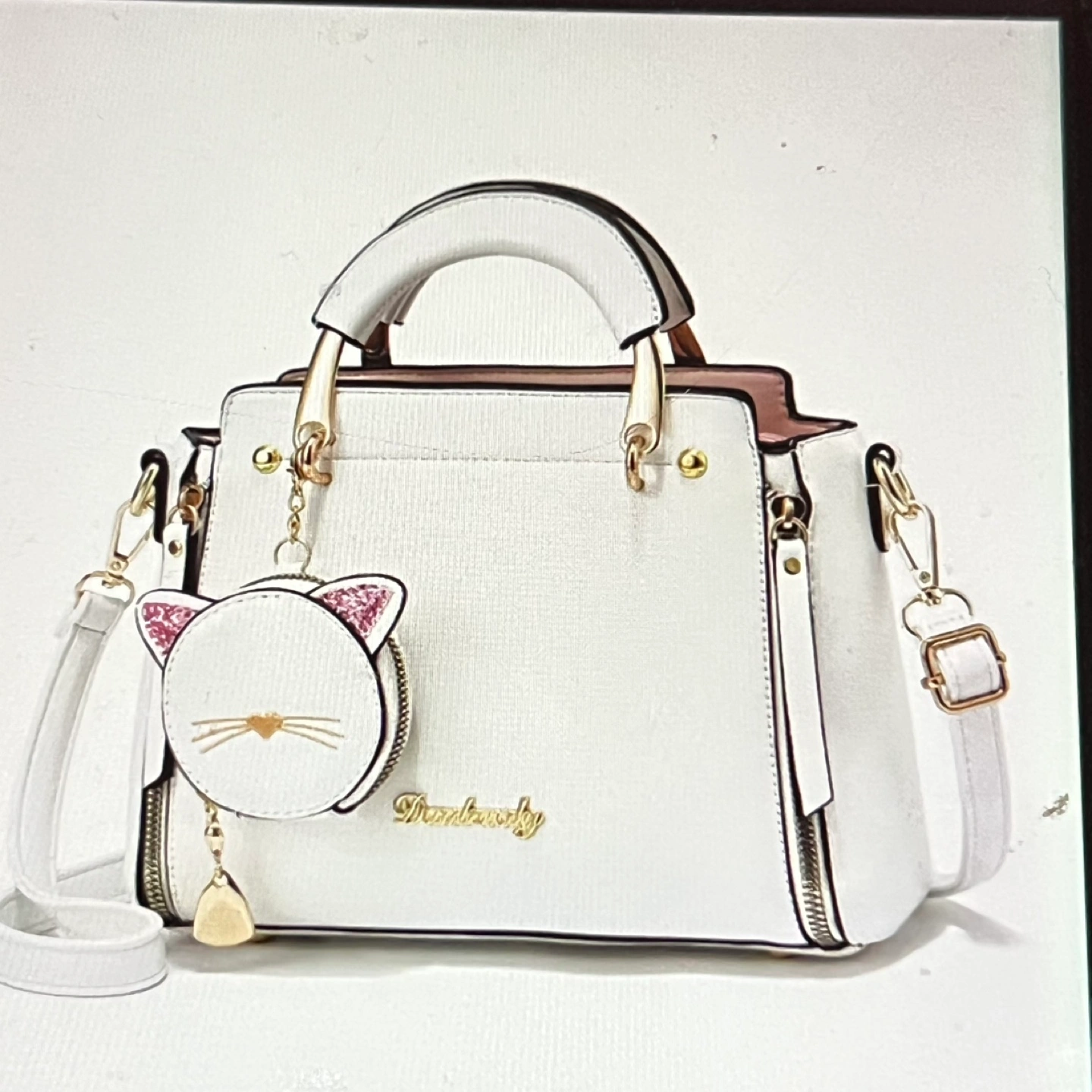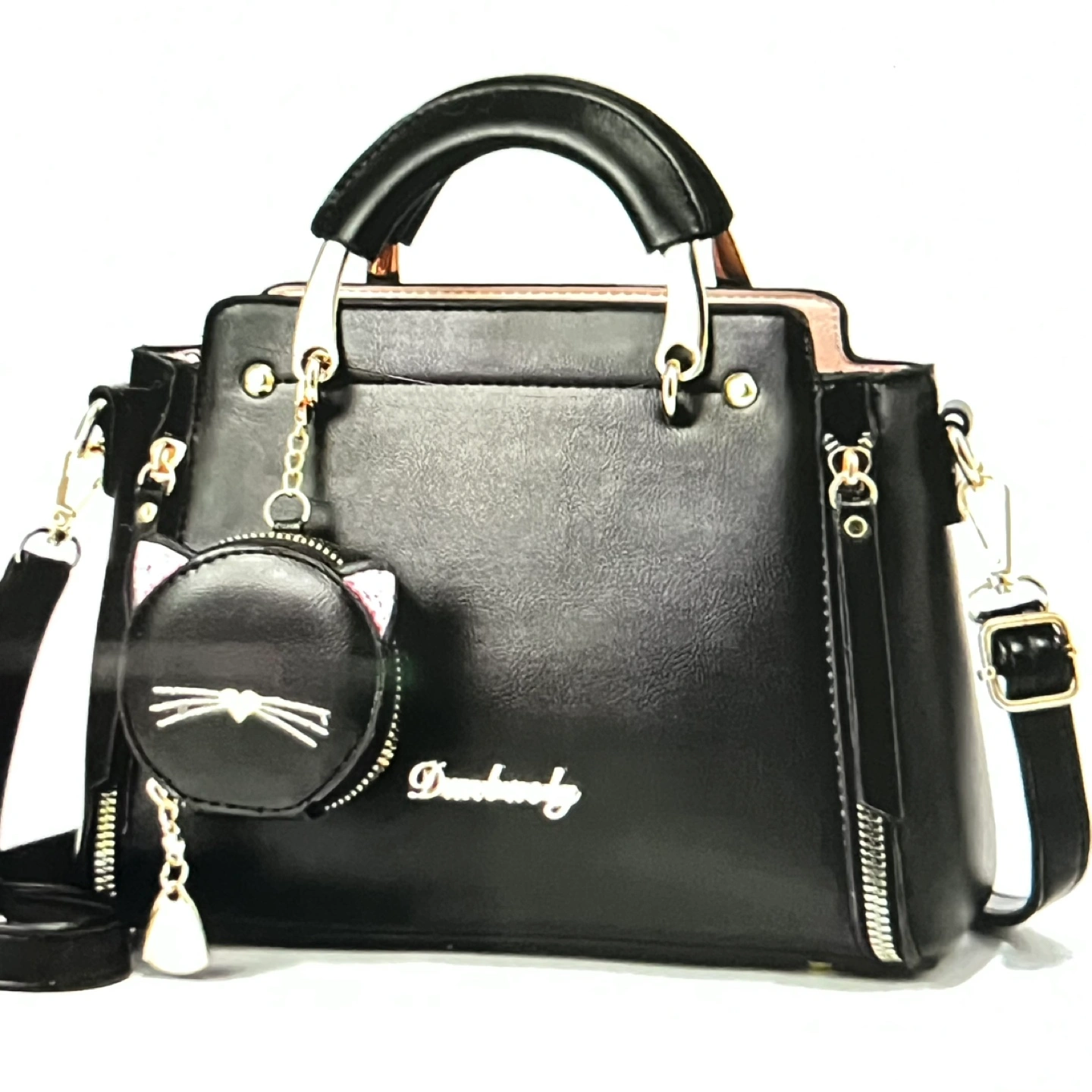 Small purse with detachable shoulder strap, gold accents and cat charm.