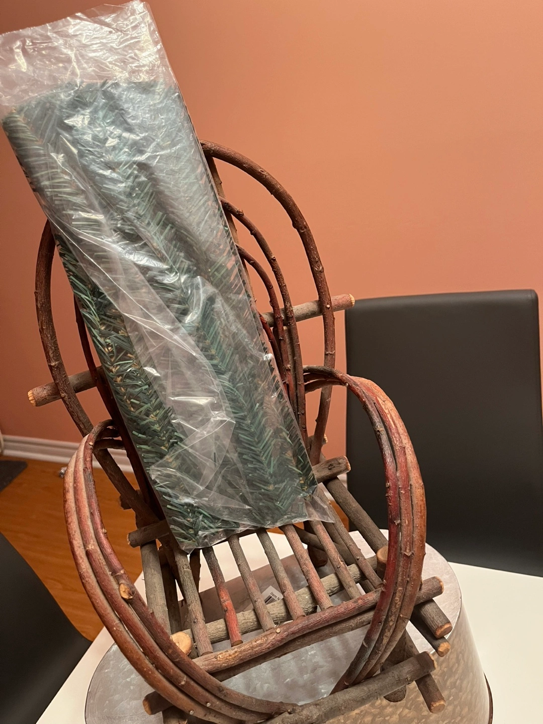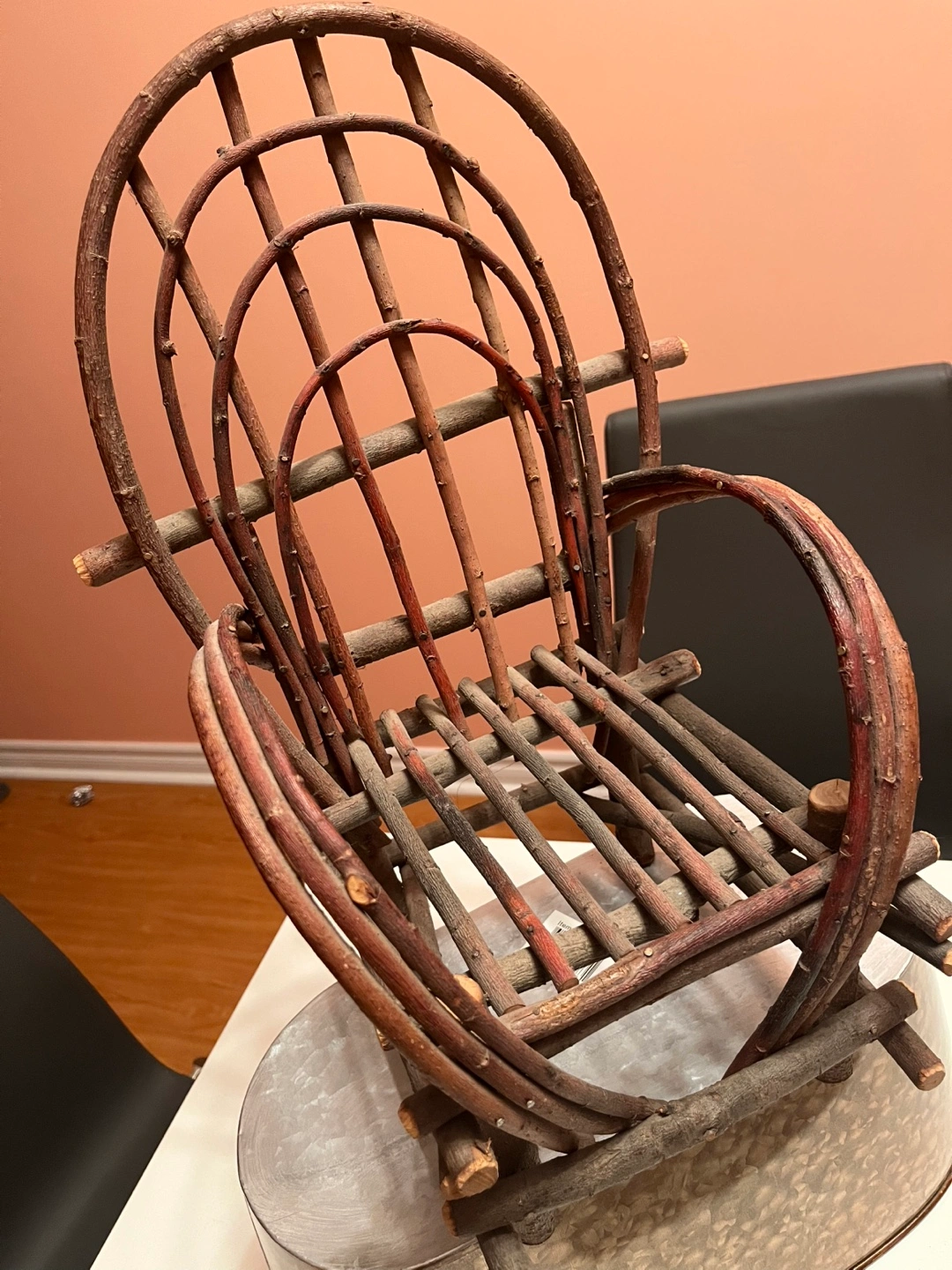 Small twig chair. Perfect for a doll or stuffed animal. Includes a small plastic bag containing green twines to add color or creat some thing . The chair is in good condition.