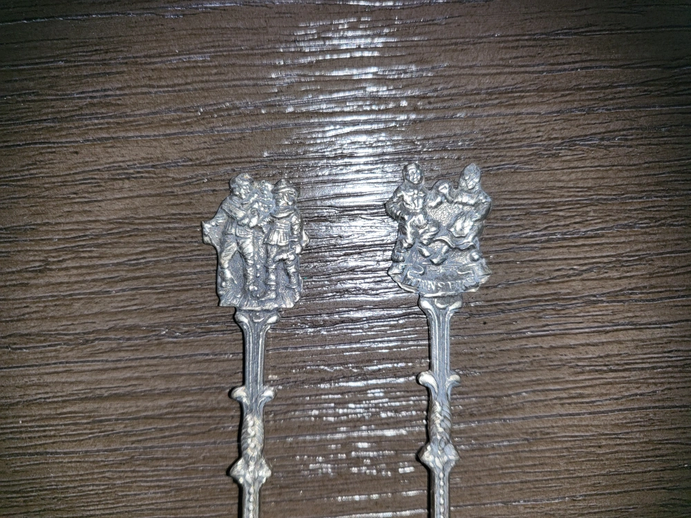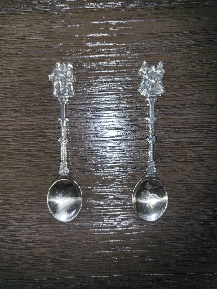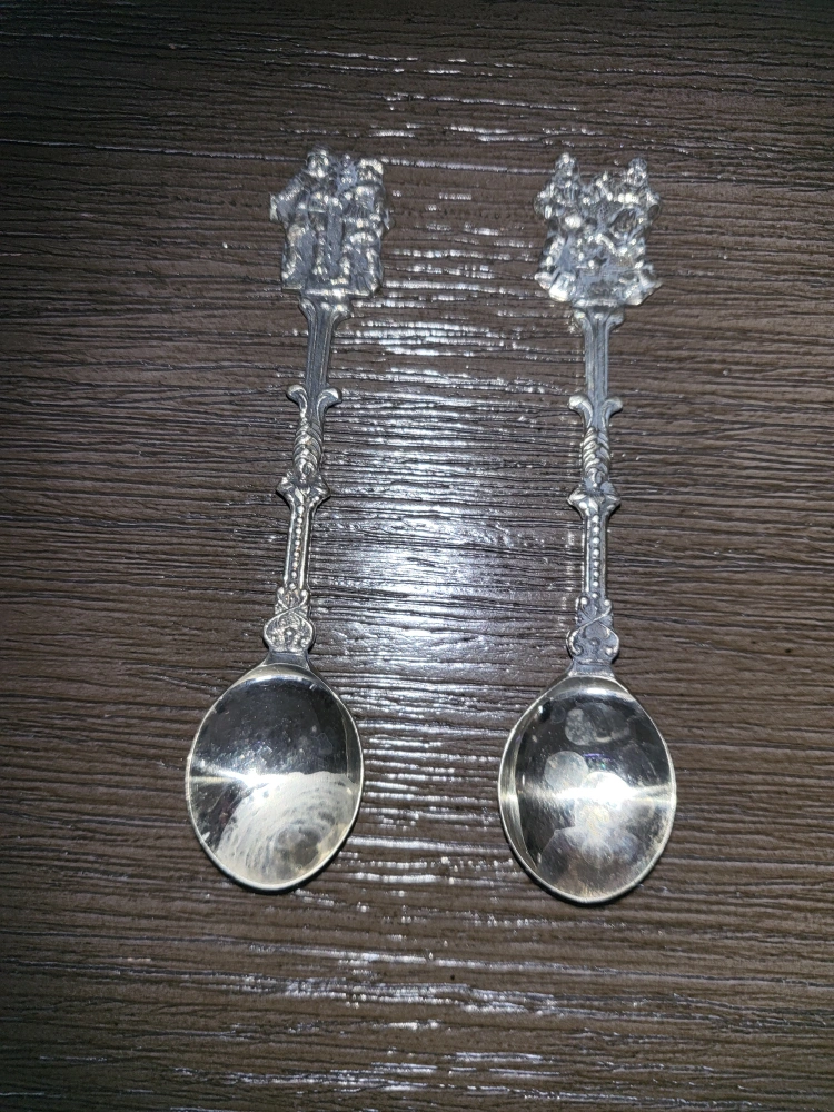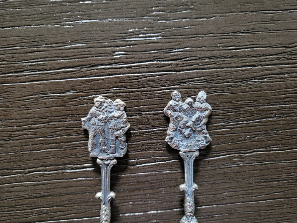 Set of two vintage silver spoons. Each spoon has an ornate design on the handle with a group of figures. This is a pair of authentic vintage Dutch silver plated spoons. These were made in Holland. If you zoom in on the back you'll see the Holland inscription. Asking $25 obo.