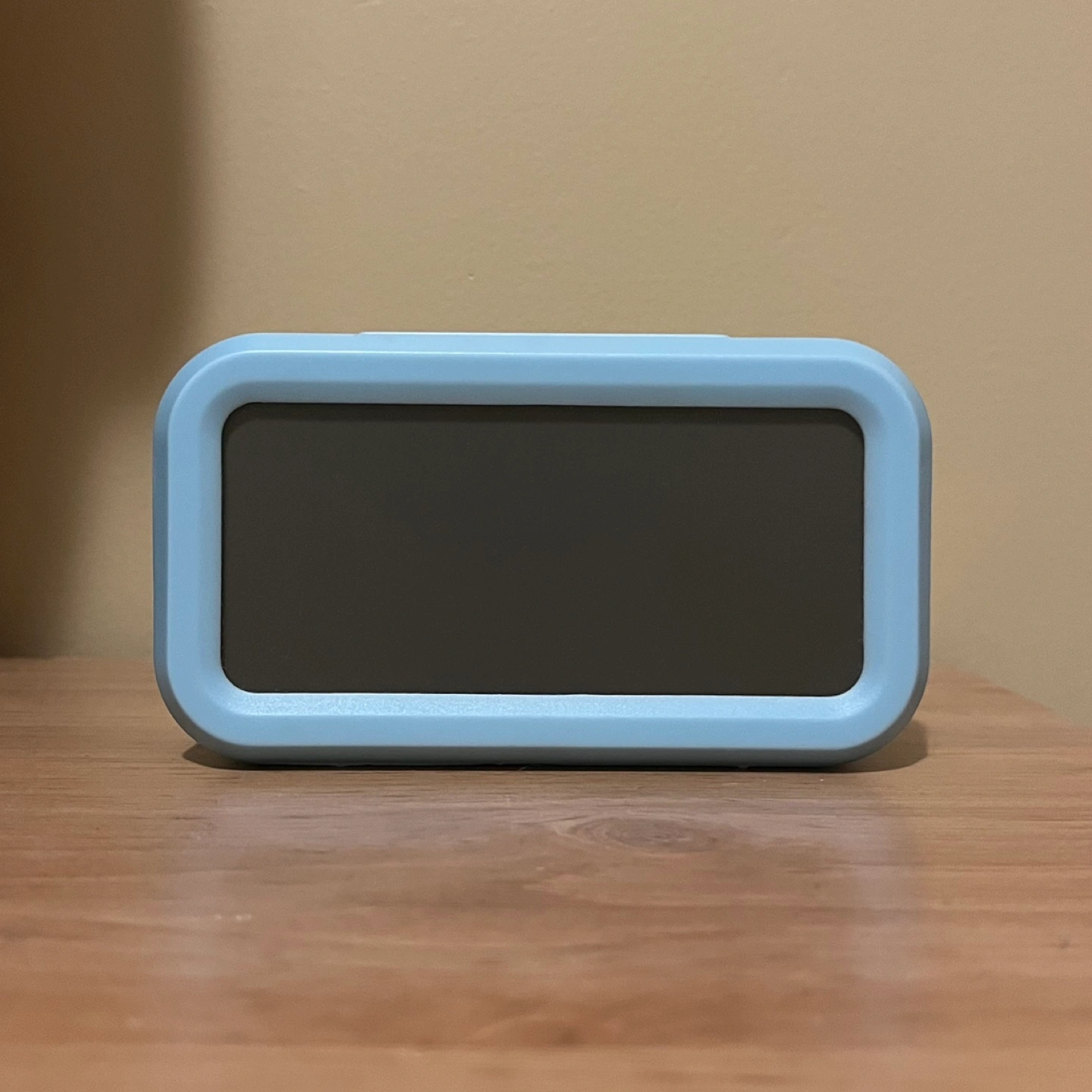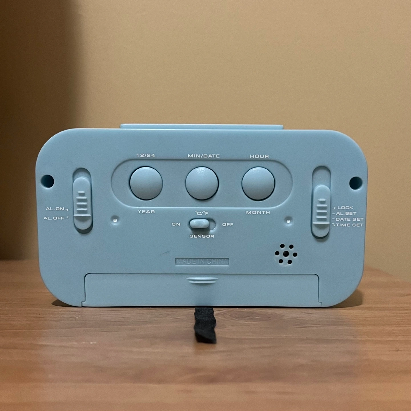 Digital alarm clock with blue casing. Includes features like alarm, snooze, and temperature display.