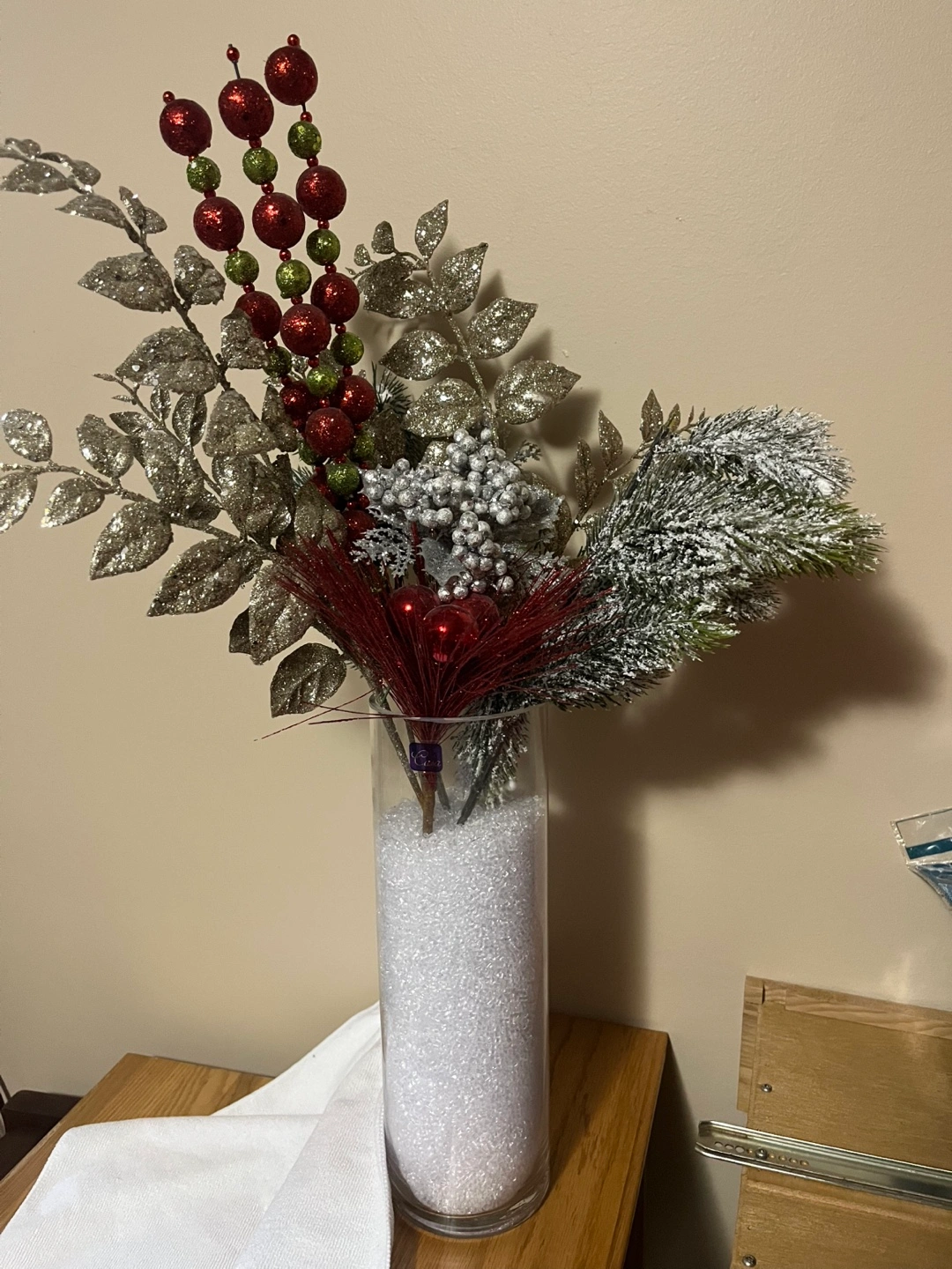 Silver glitter leaves, red and green berry sprigs, and frosted pine sprigs in a glass vase filled with white glitter.