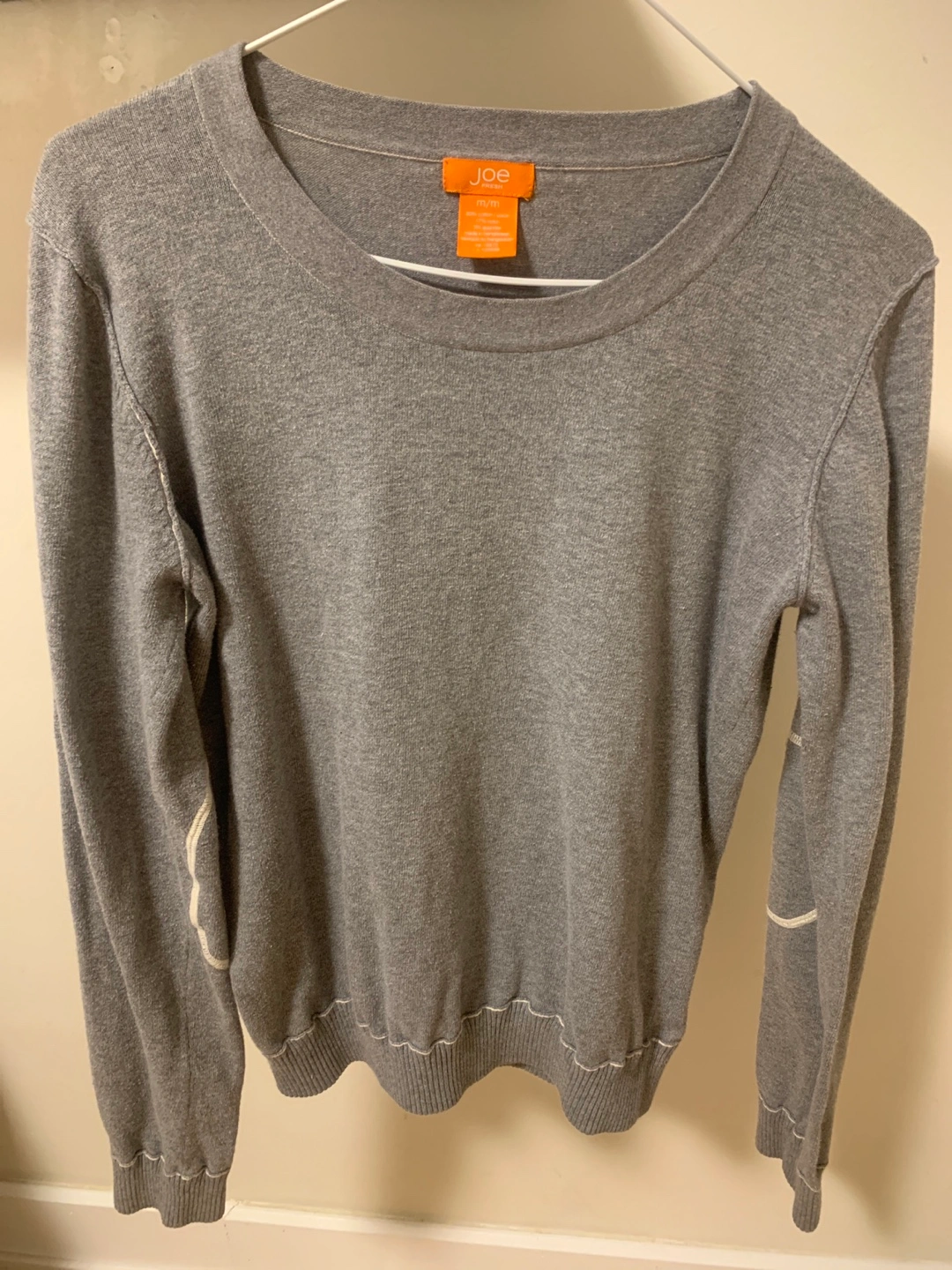 Grey sweater with white detail on the elbows. Long sleeves. Crew neck. Size M