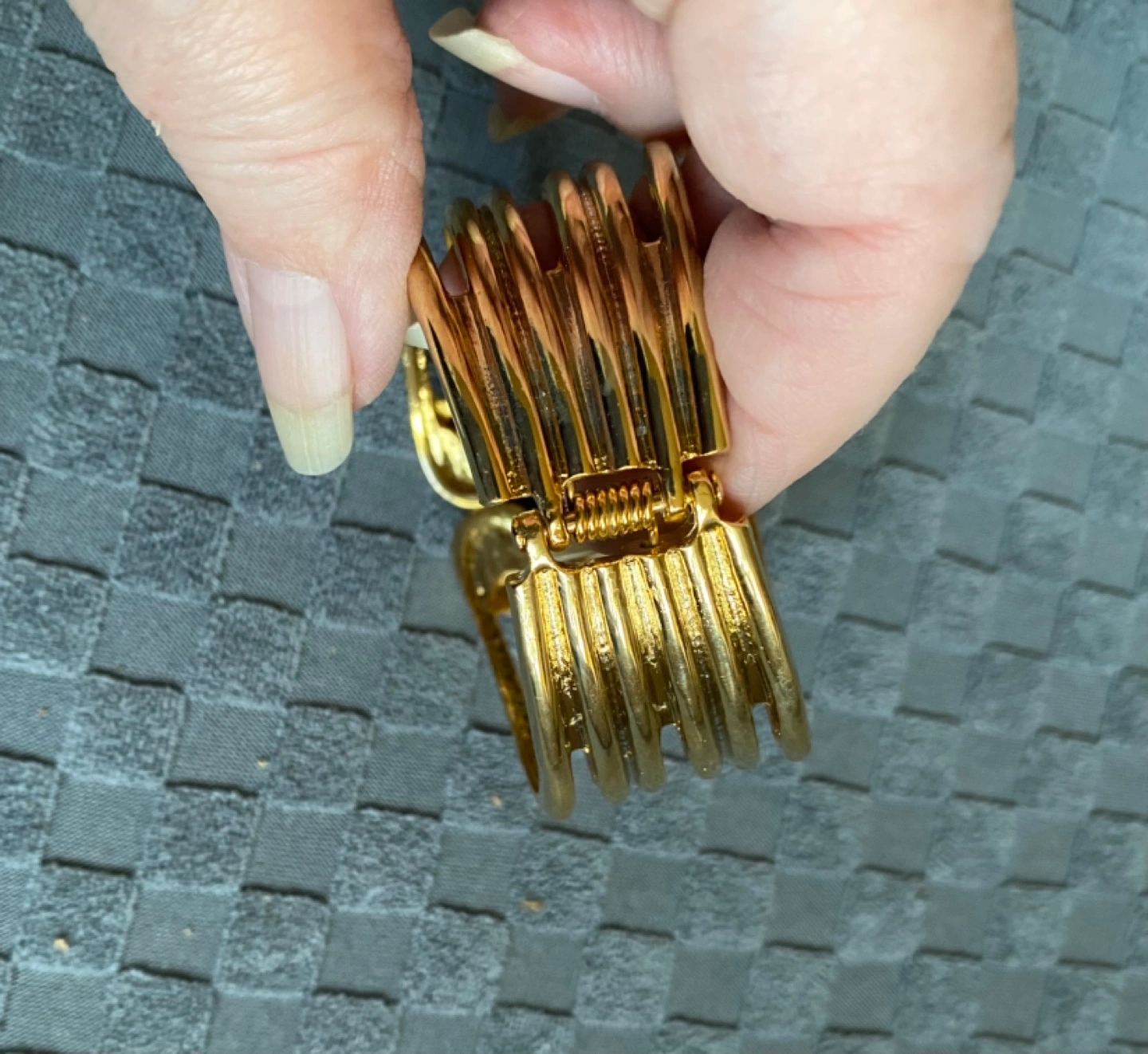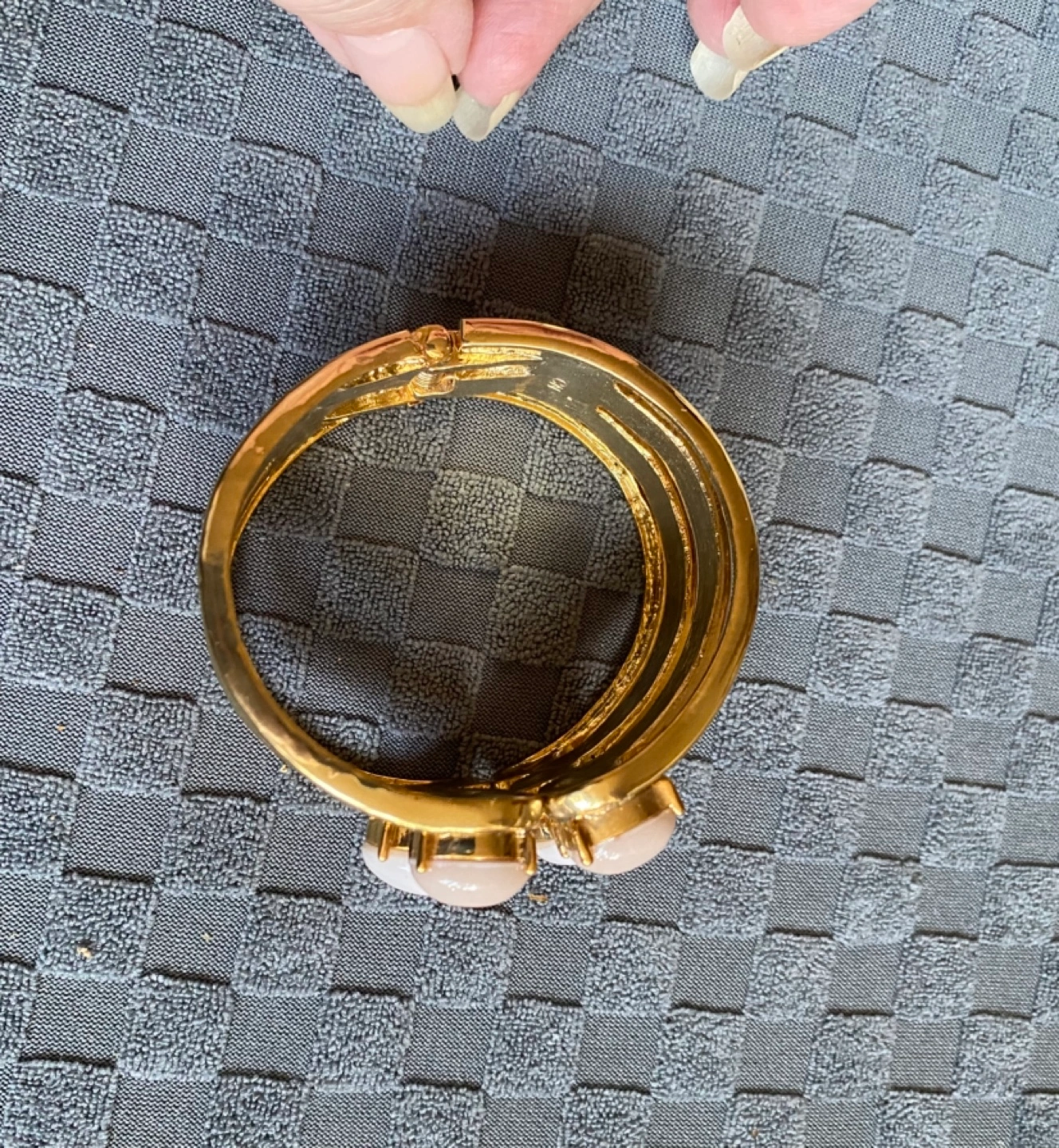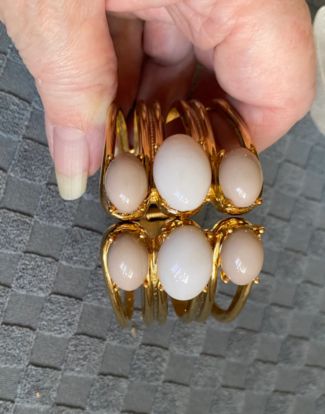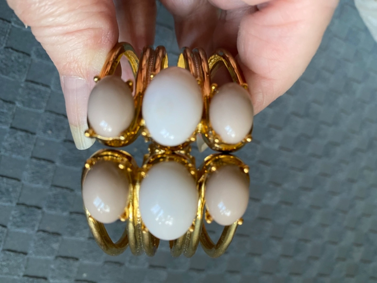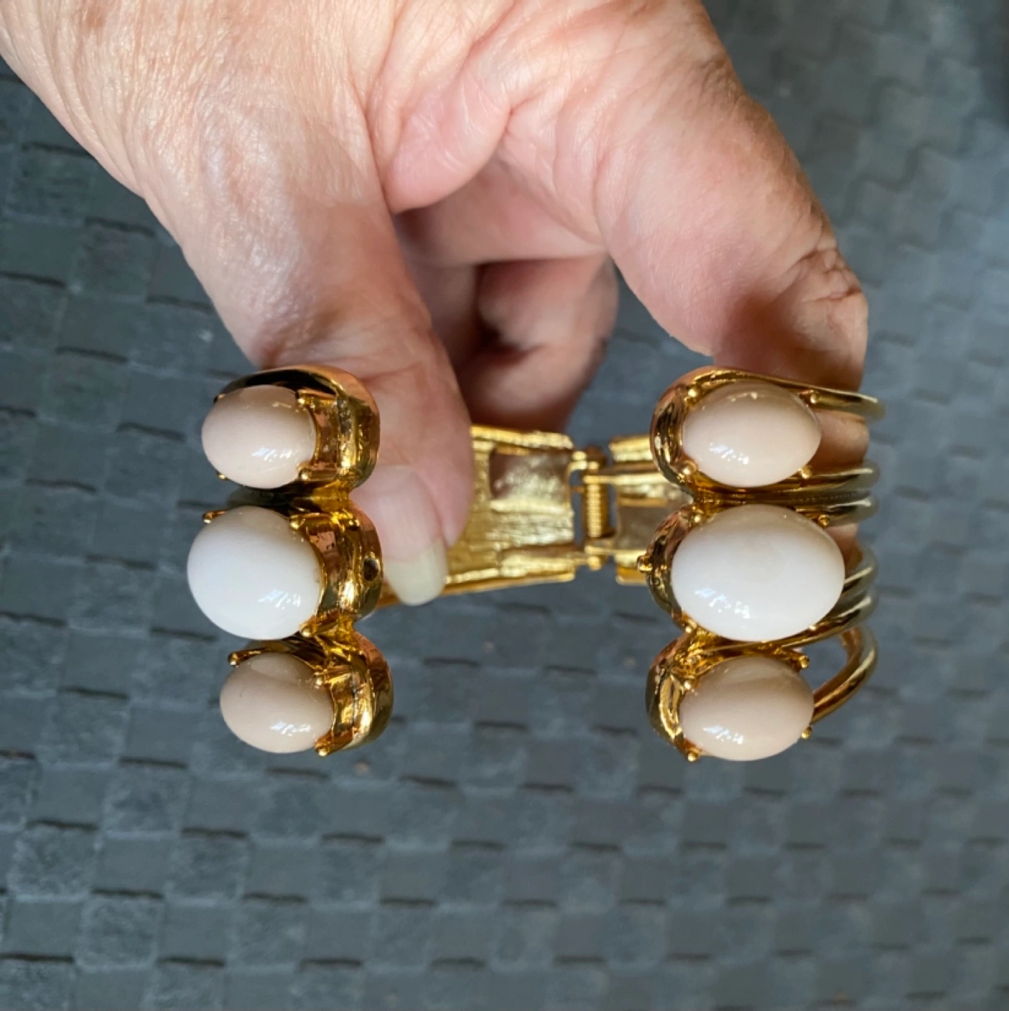 Gold tone bracelet with six large bone white stones. Has a spring closure.