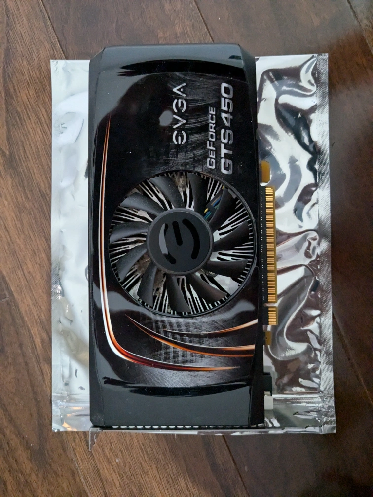 I'm selling a Nvidia GeForce GTS 450 graphics card. It still works in good condition. You will need to download the drivers online. I don't have the original packaging because I took it out from an existing build. The graphics card is carefully stored in ESD packaging.