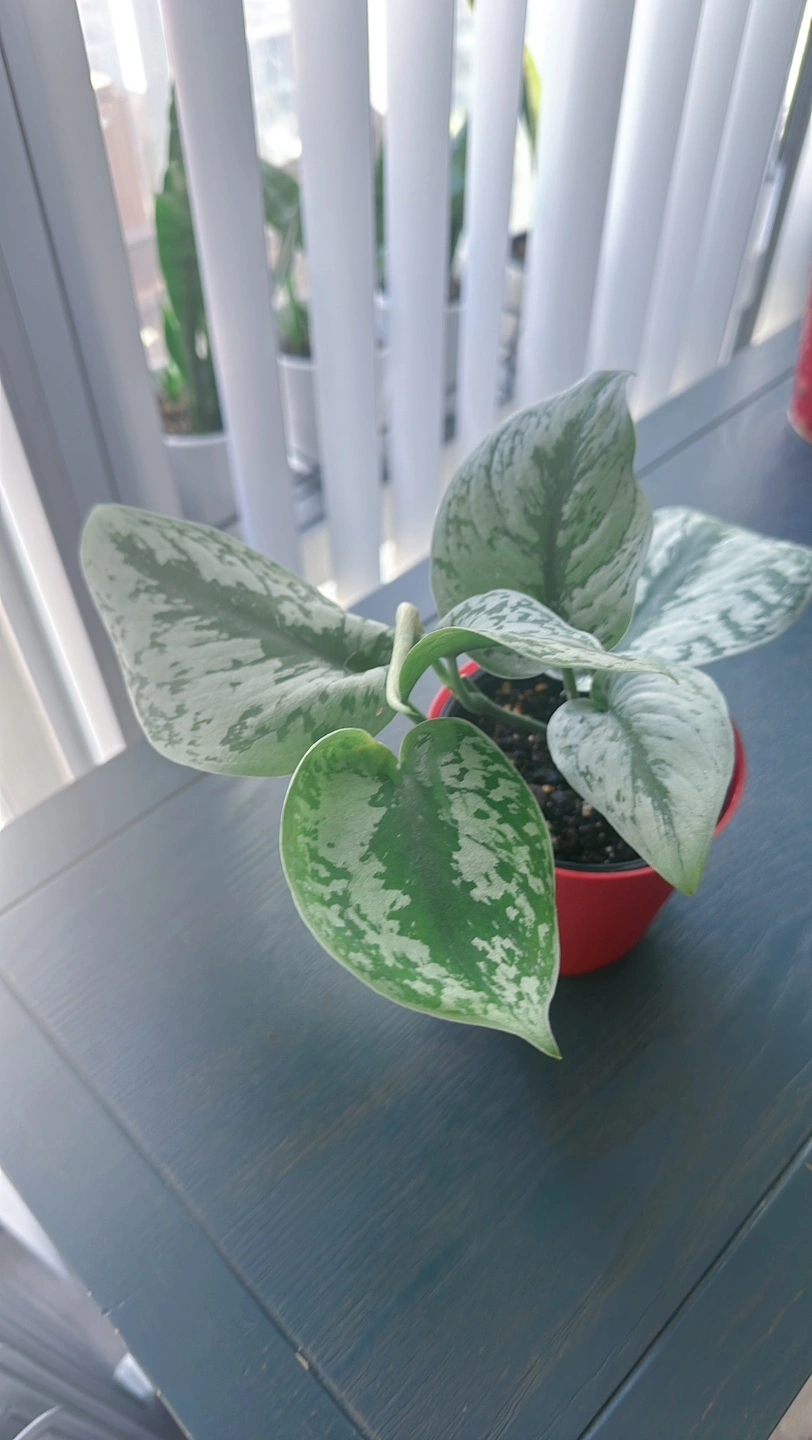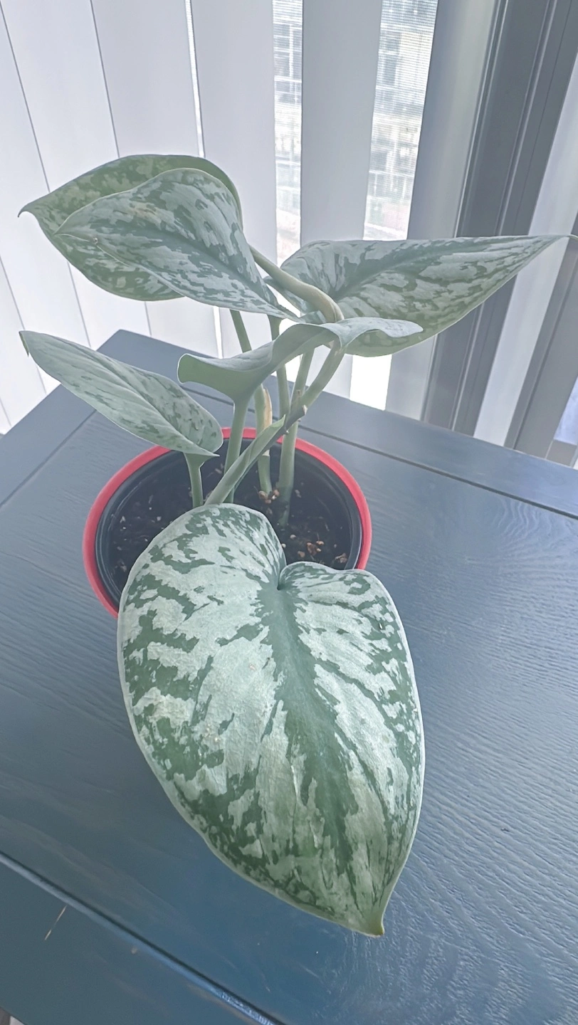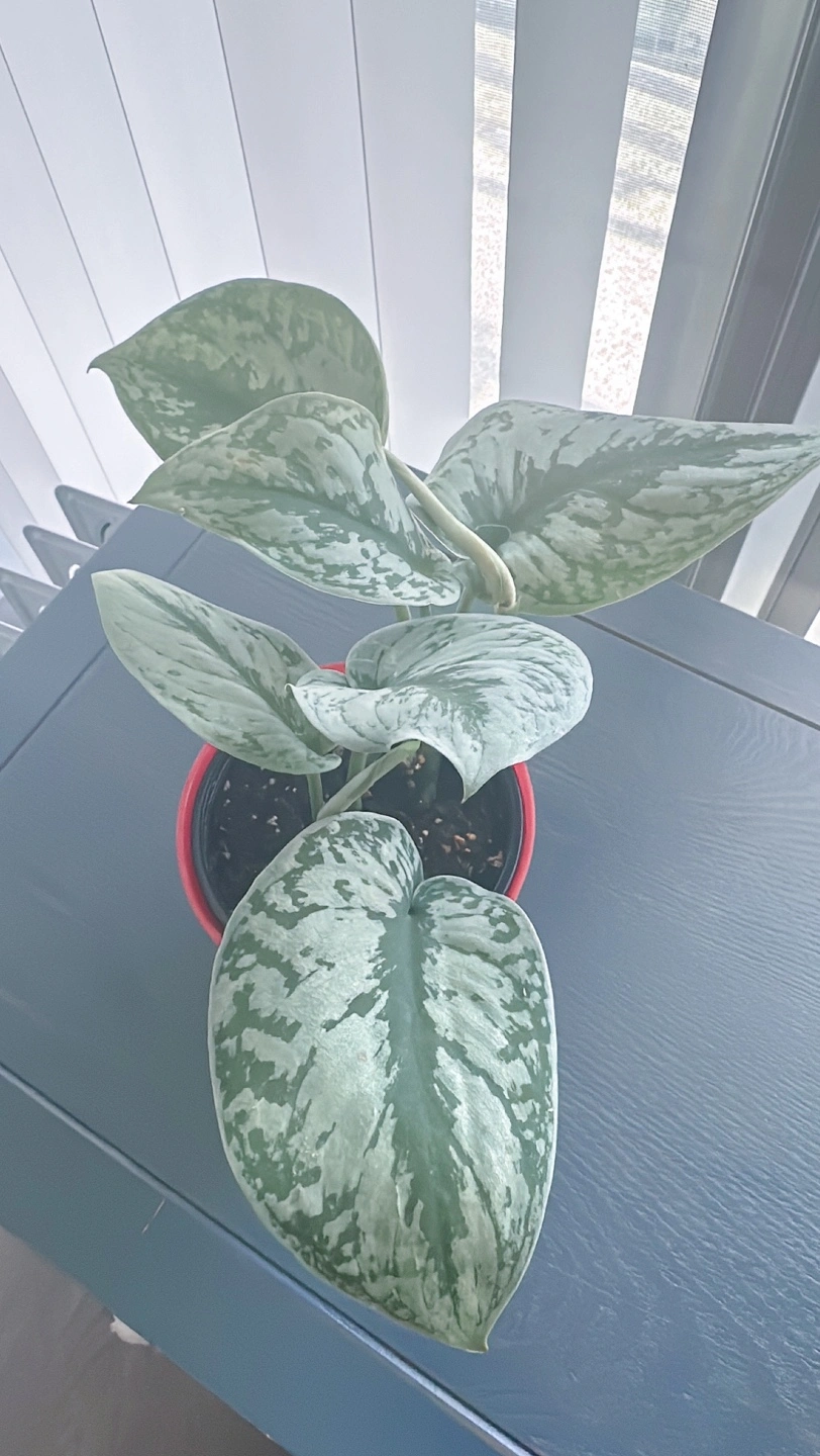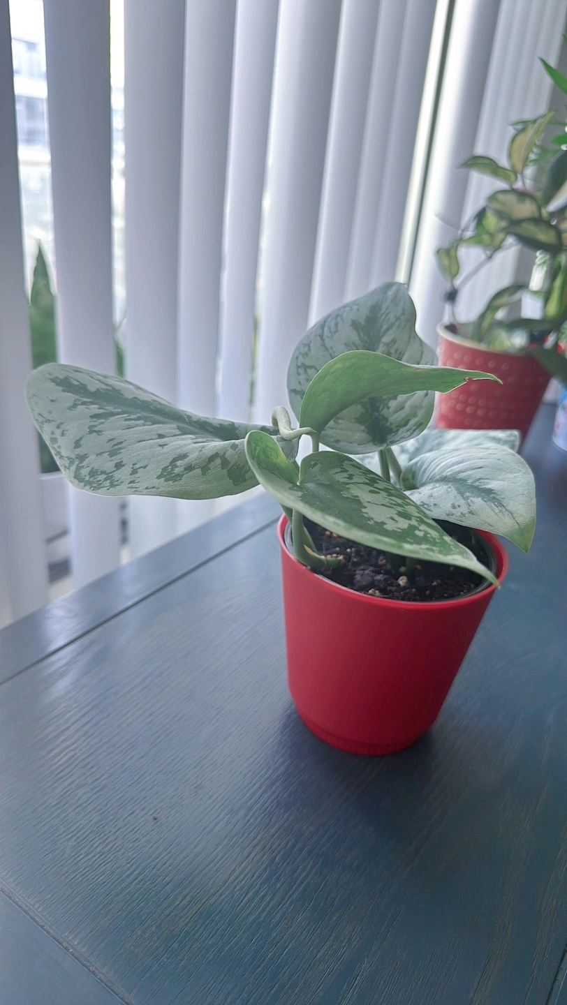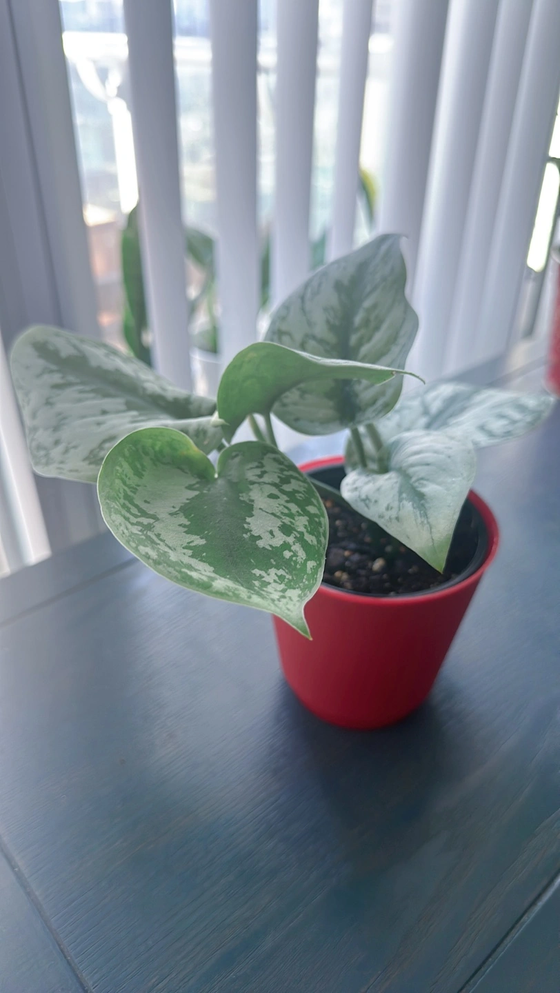 Healthy silver satin pothos in a red pot. It is a beautiful plant that thrives in bright, indirect light. It can tolerate lower light conditions, but it will not grow as quickly.
