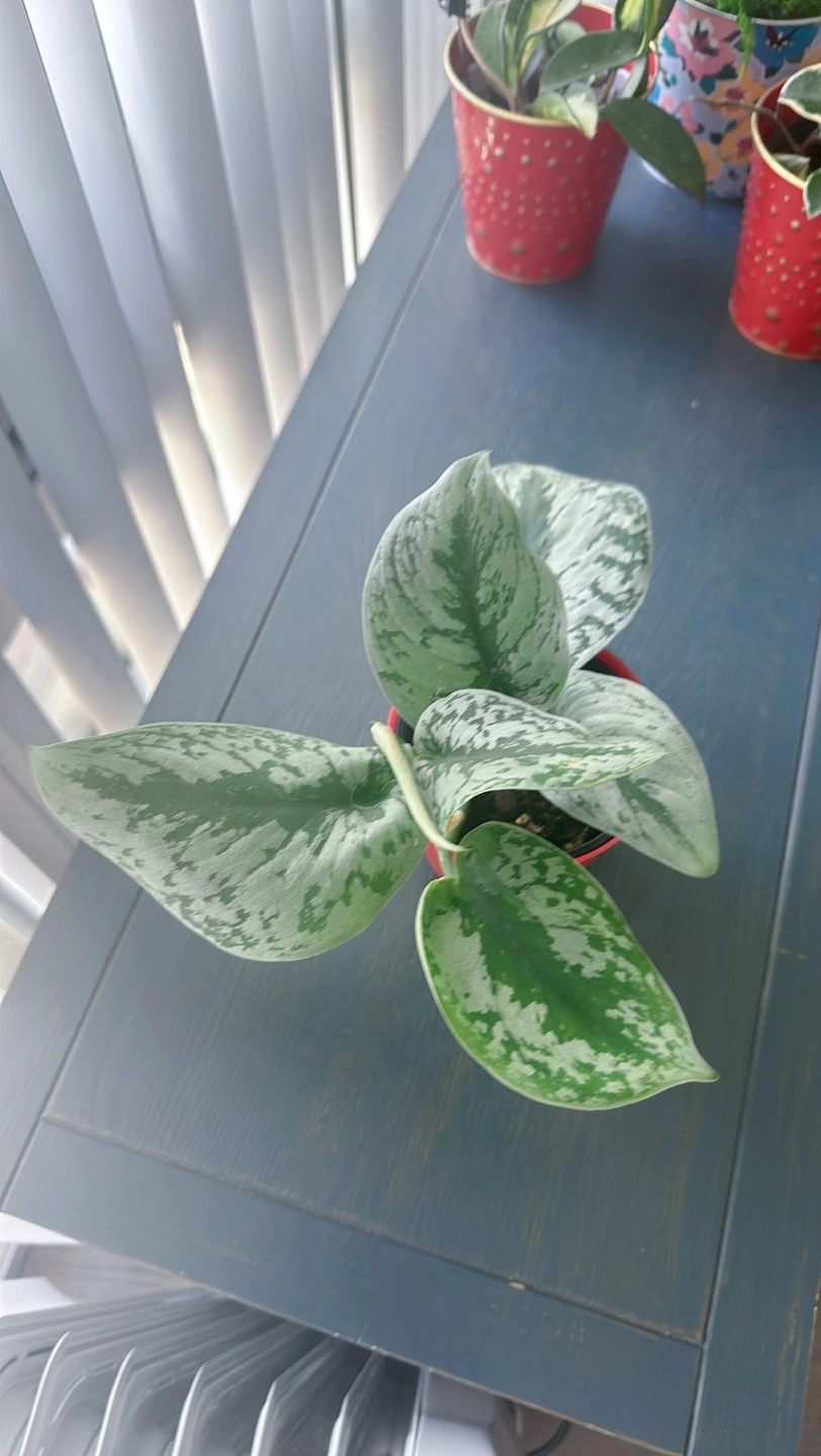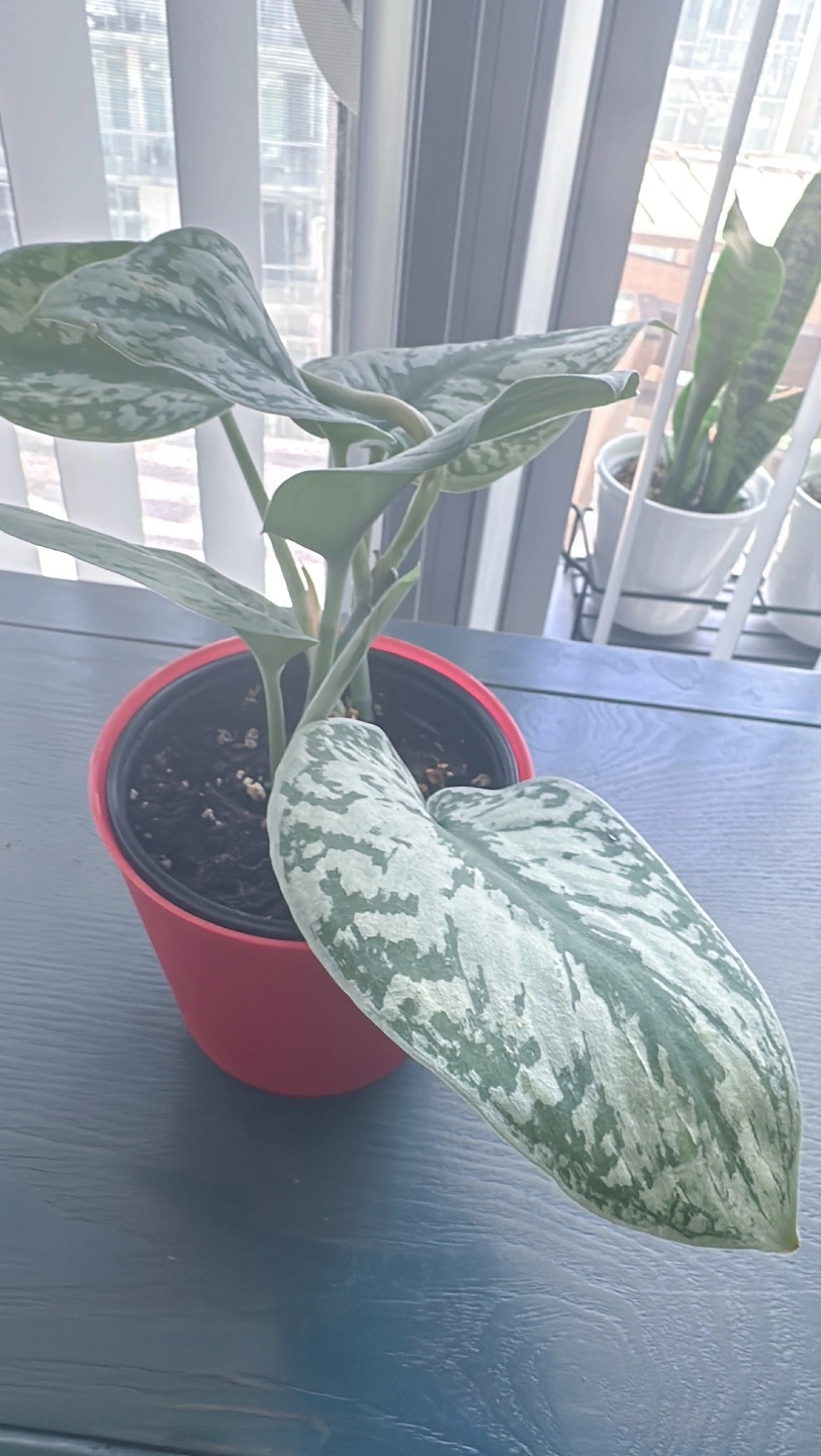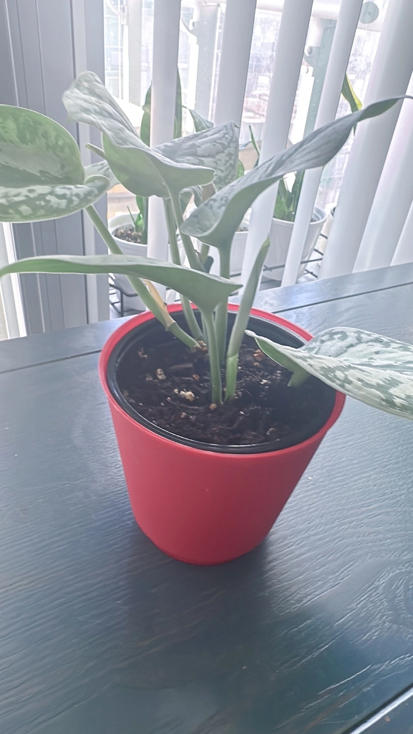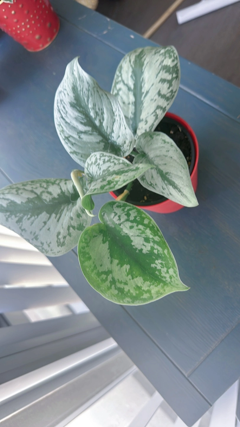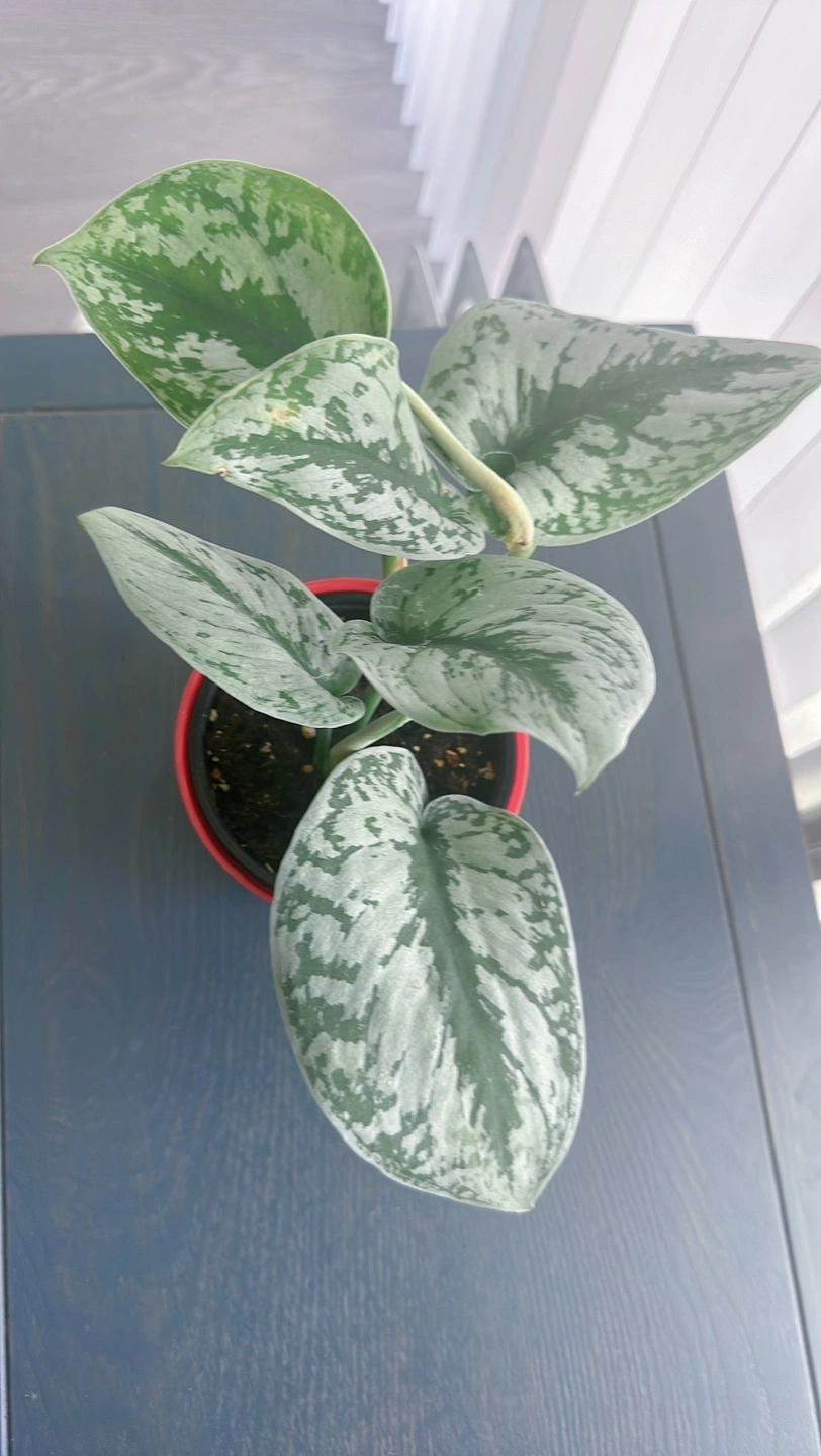 Healthy silver satin pothos in a red pot. It is a beautiful plant that thrives in bright, indirect light. It can tolerate lower light conditions, but it will not grow as quickly.