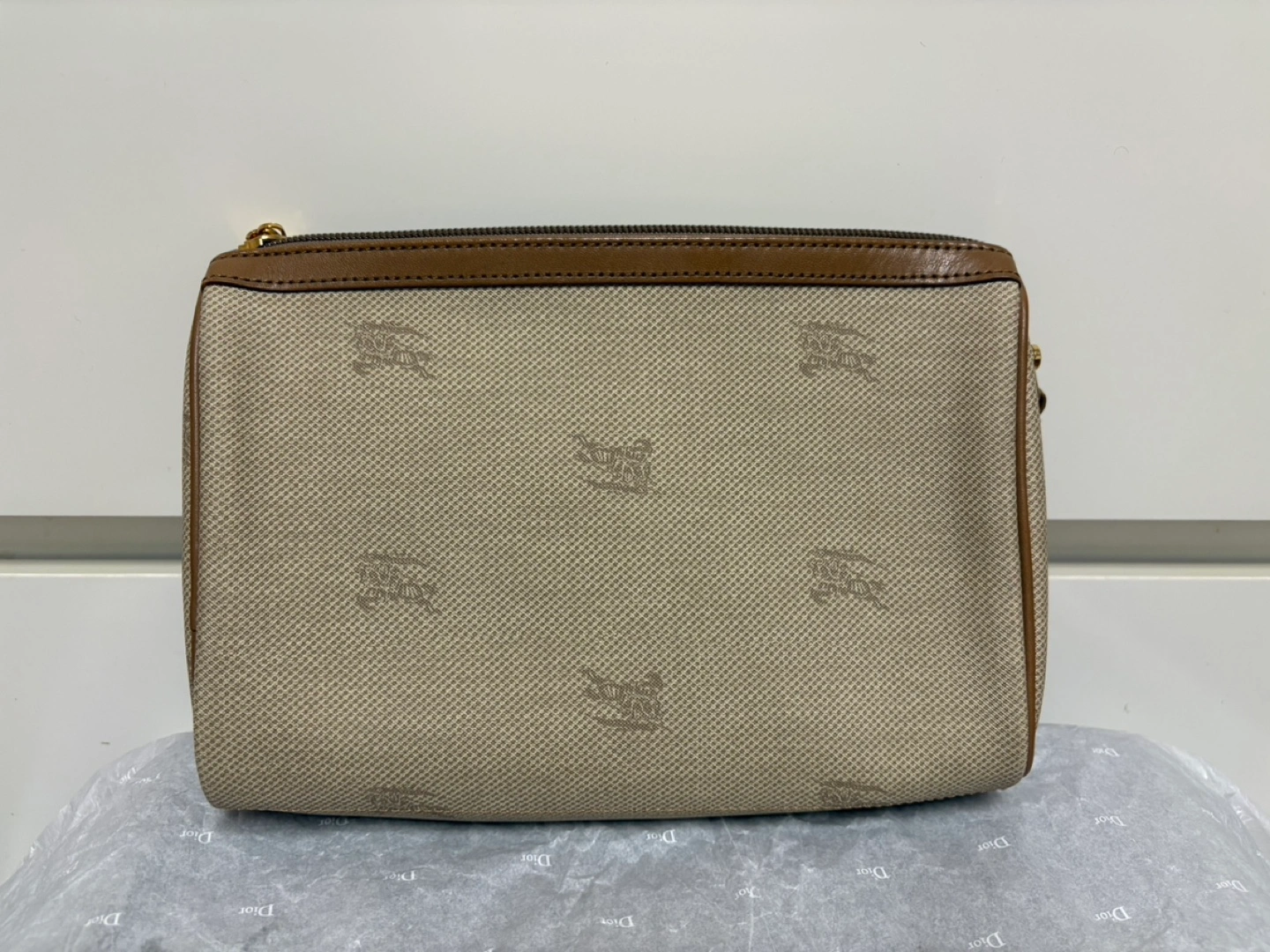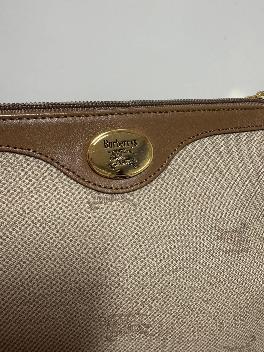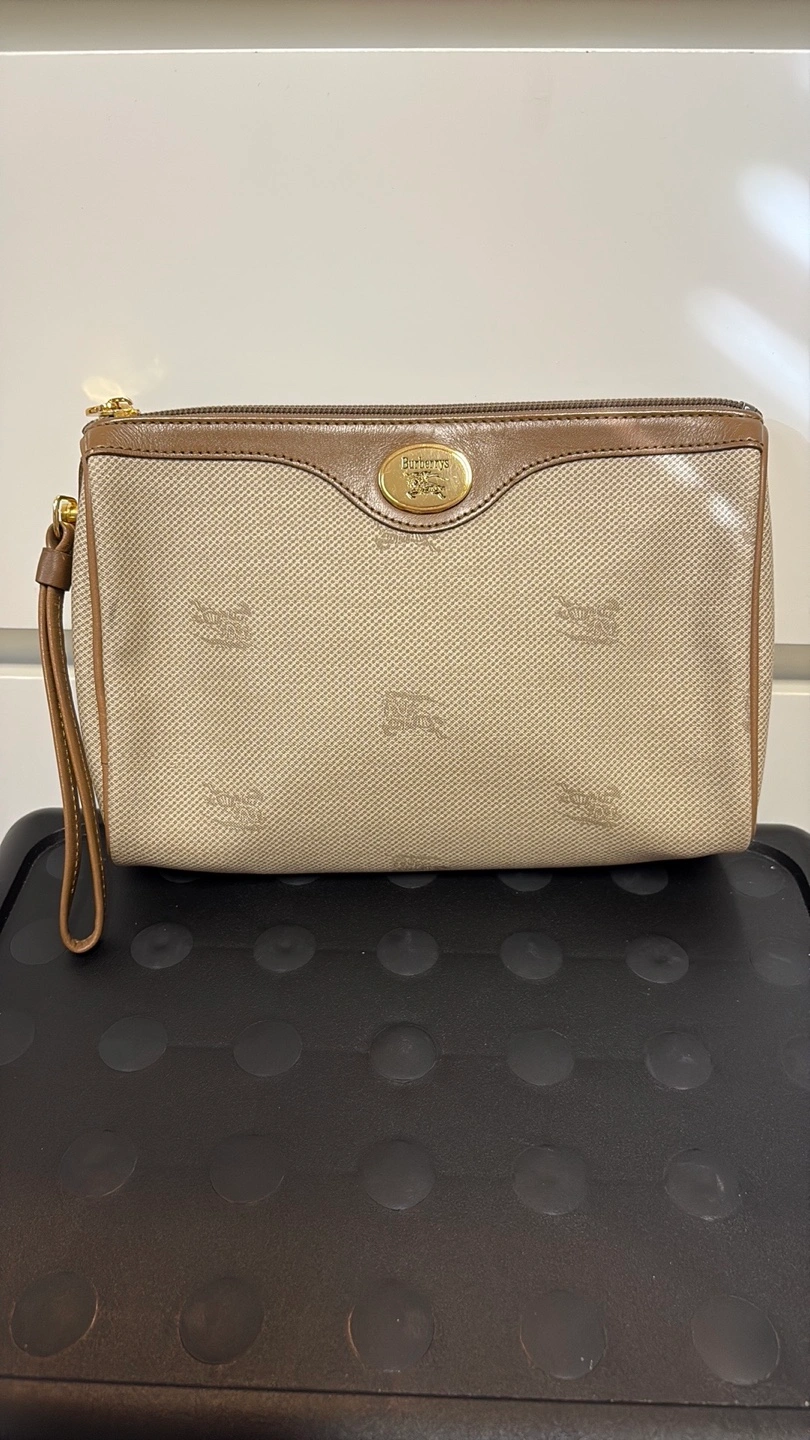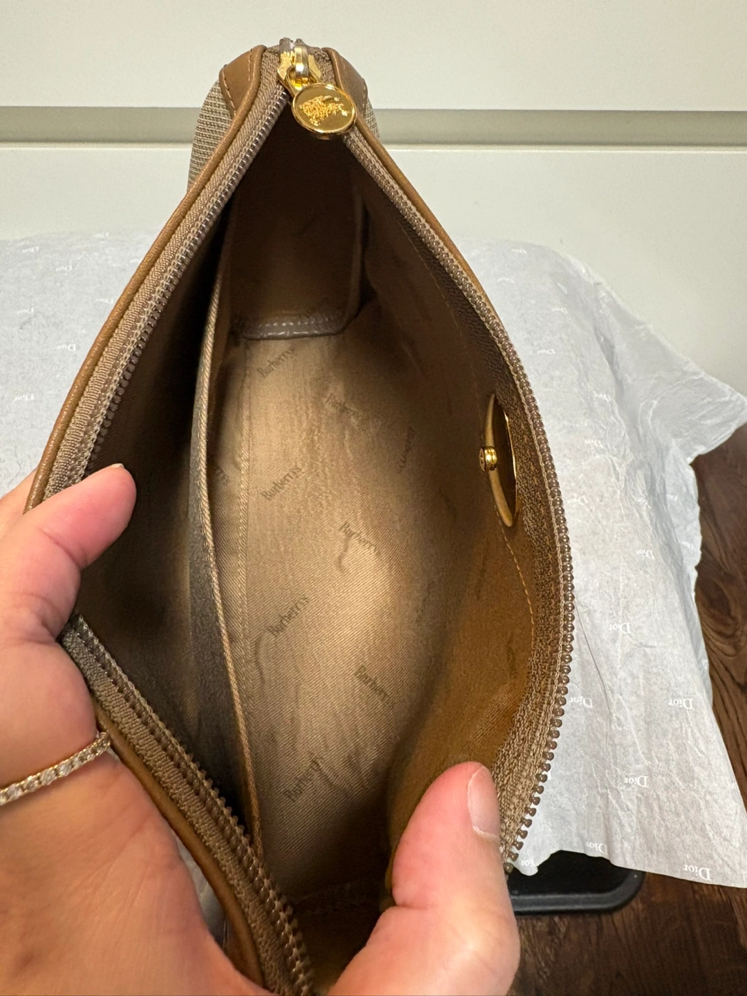 Small clutch bag with a brown leather strap and a zipper closure. The bag features a Burberrys logo.