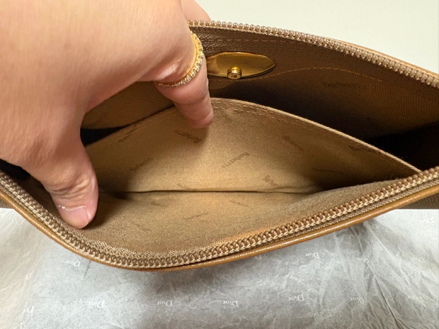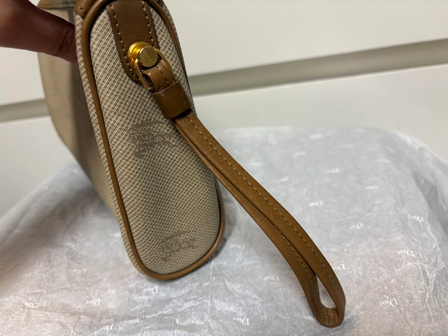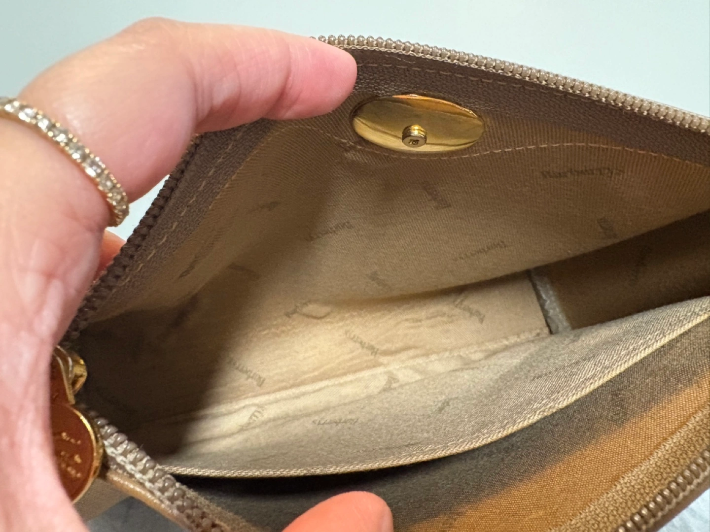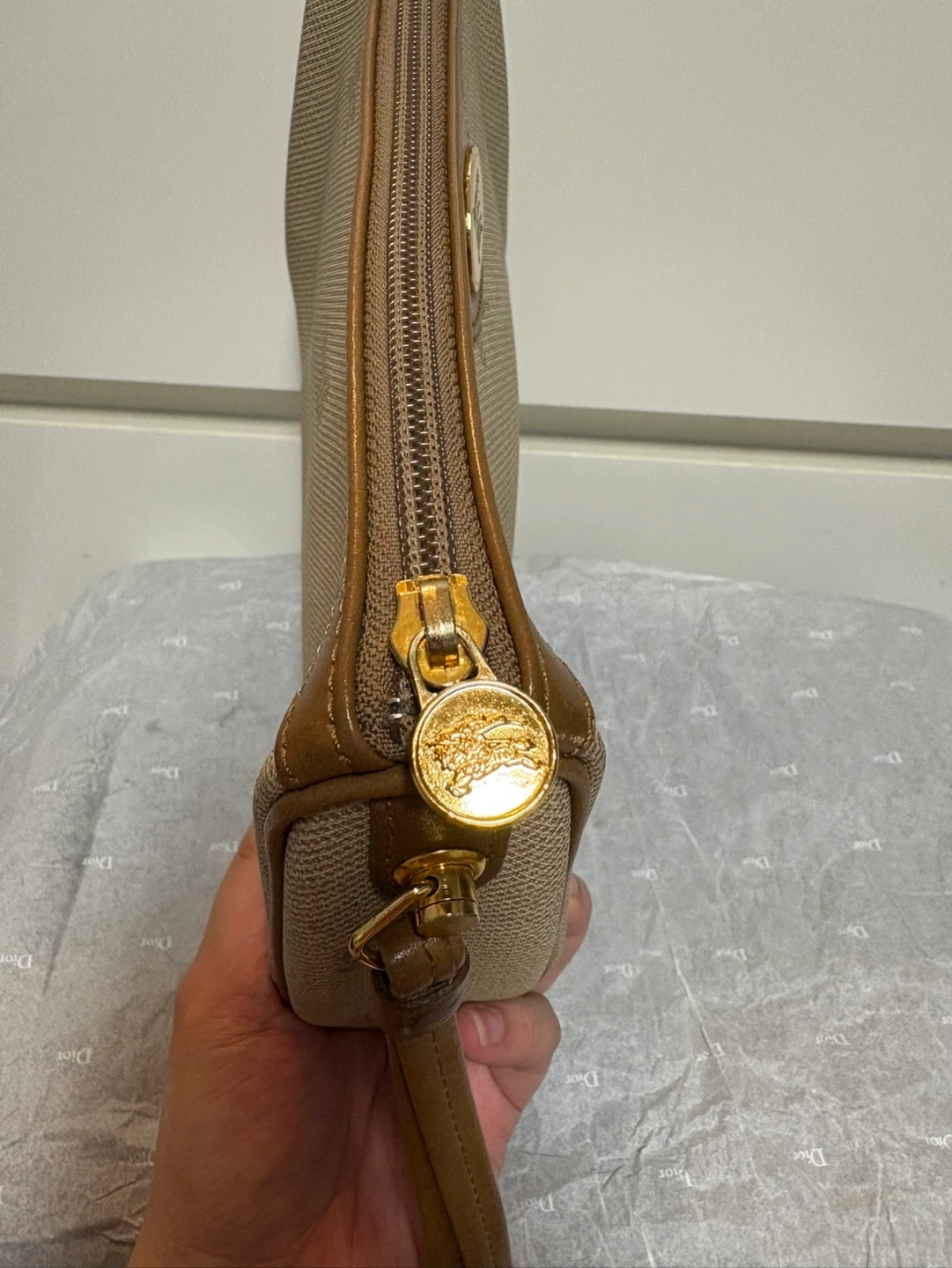 Small clutch bag with a brown leather strap and a zipper closure. The bag features a Burberrys logo.