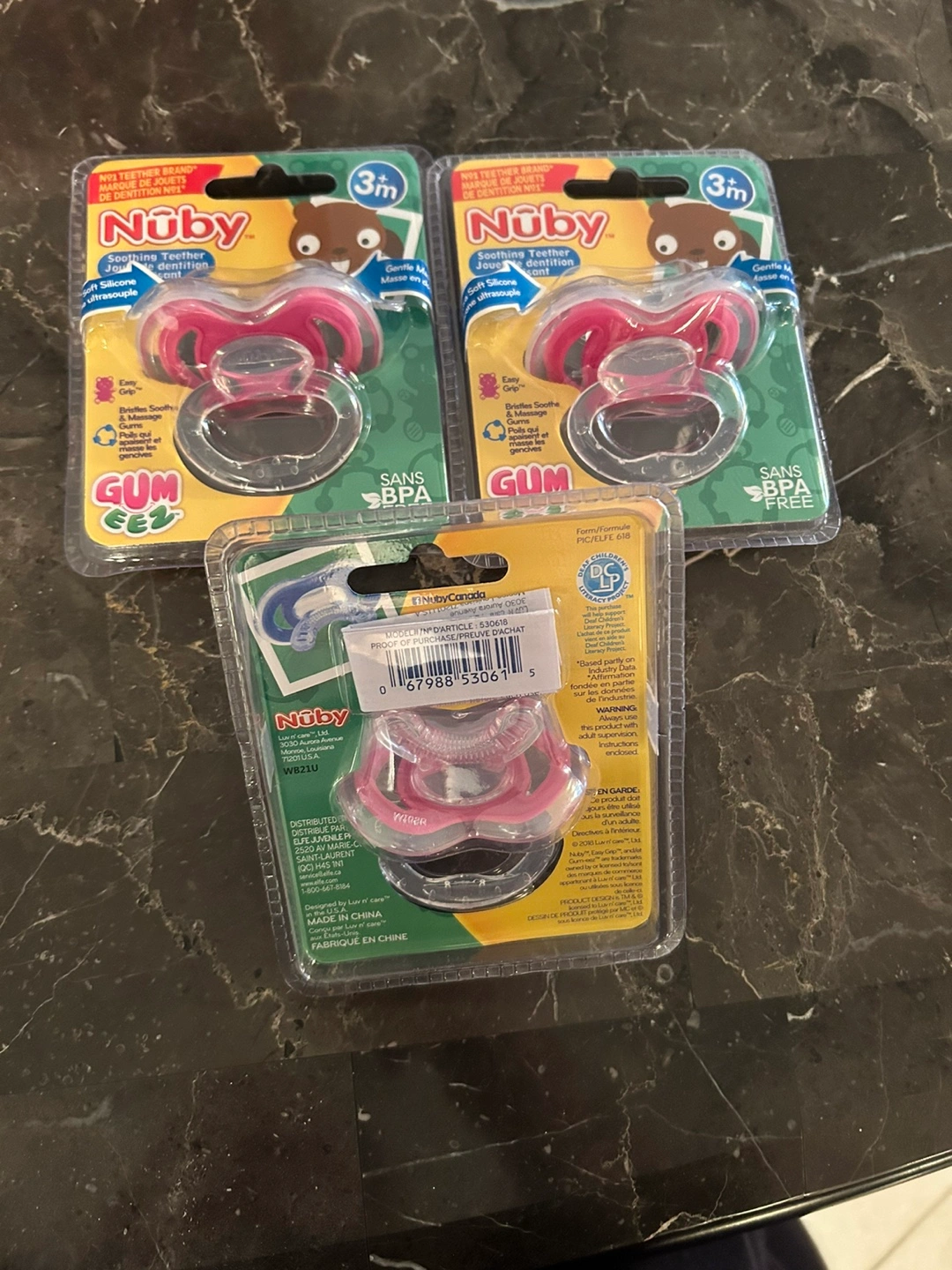 Three pink Nuby Gum Teethers. Soft silicone, gentle on gums. Easy-grip and helps soothe gums. $5 each 2 dark pink available 1 light pink available