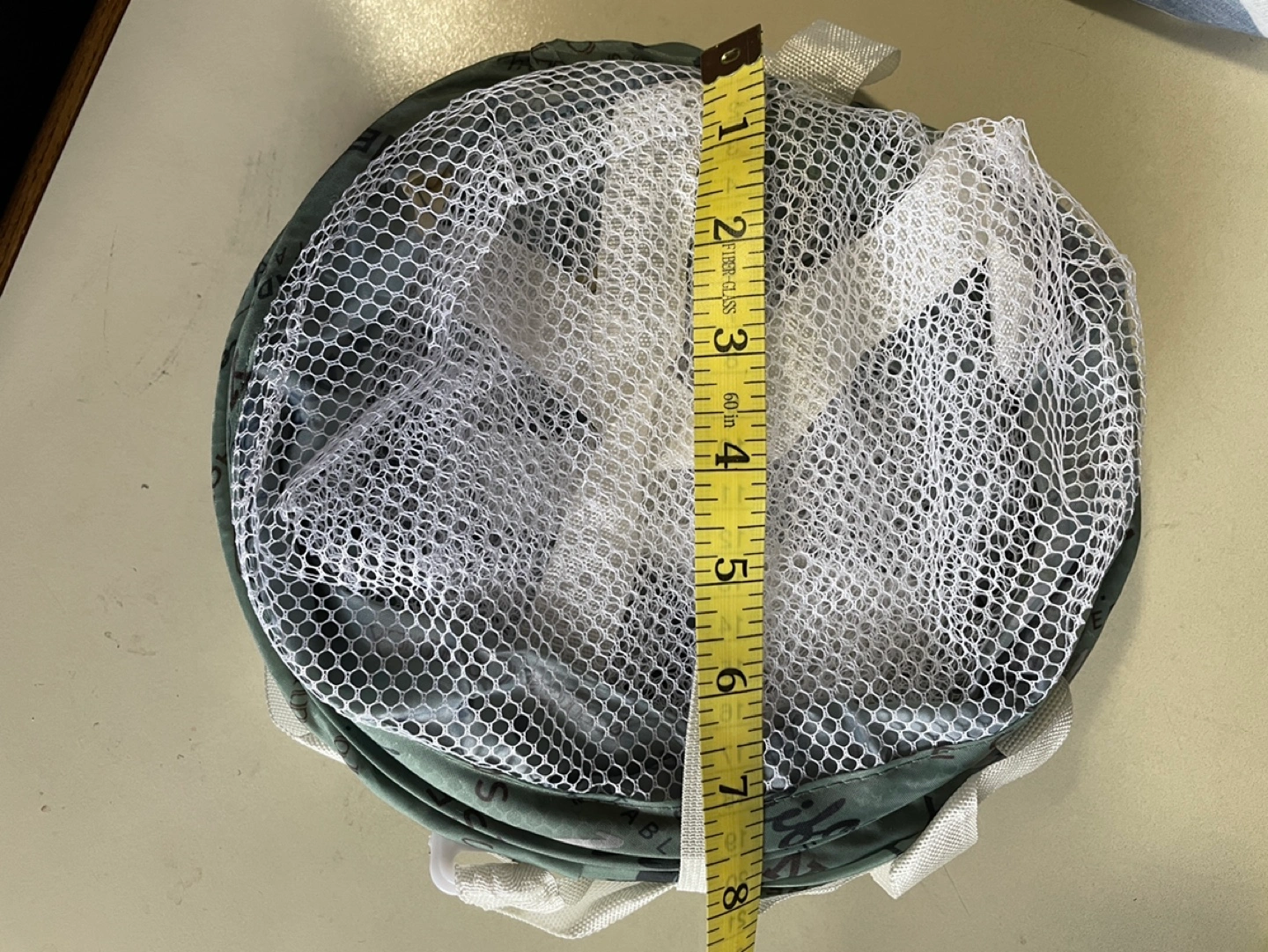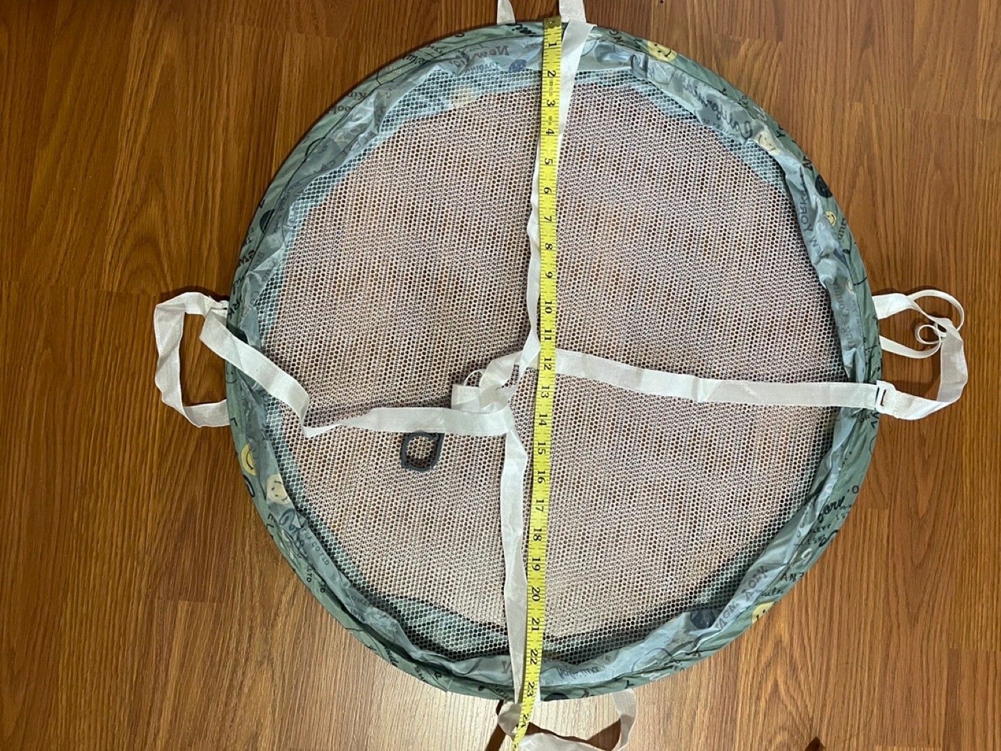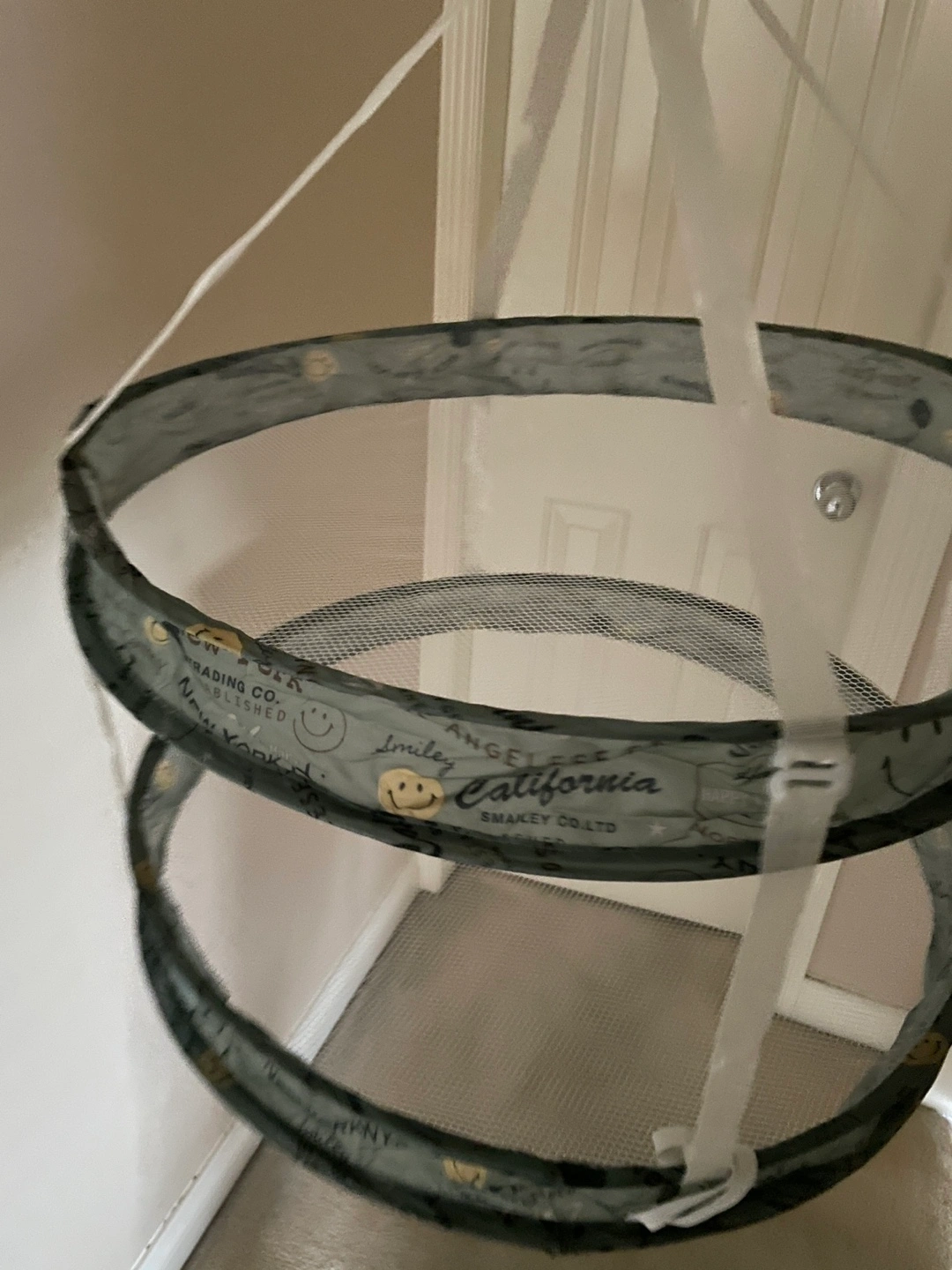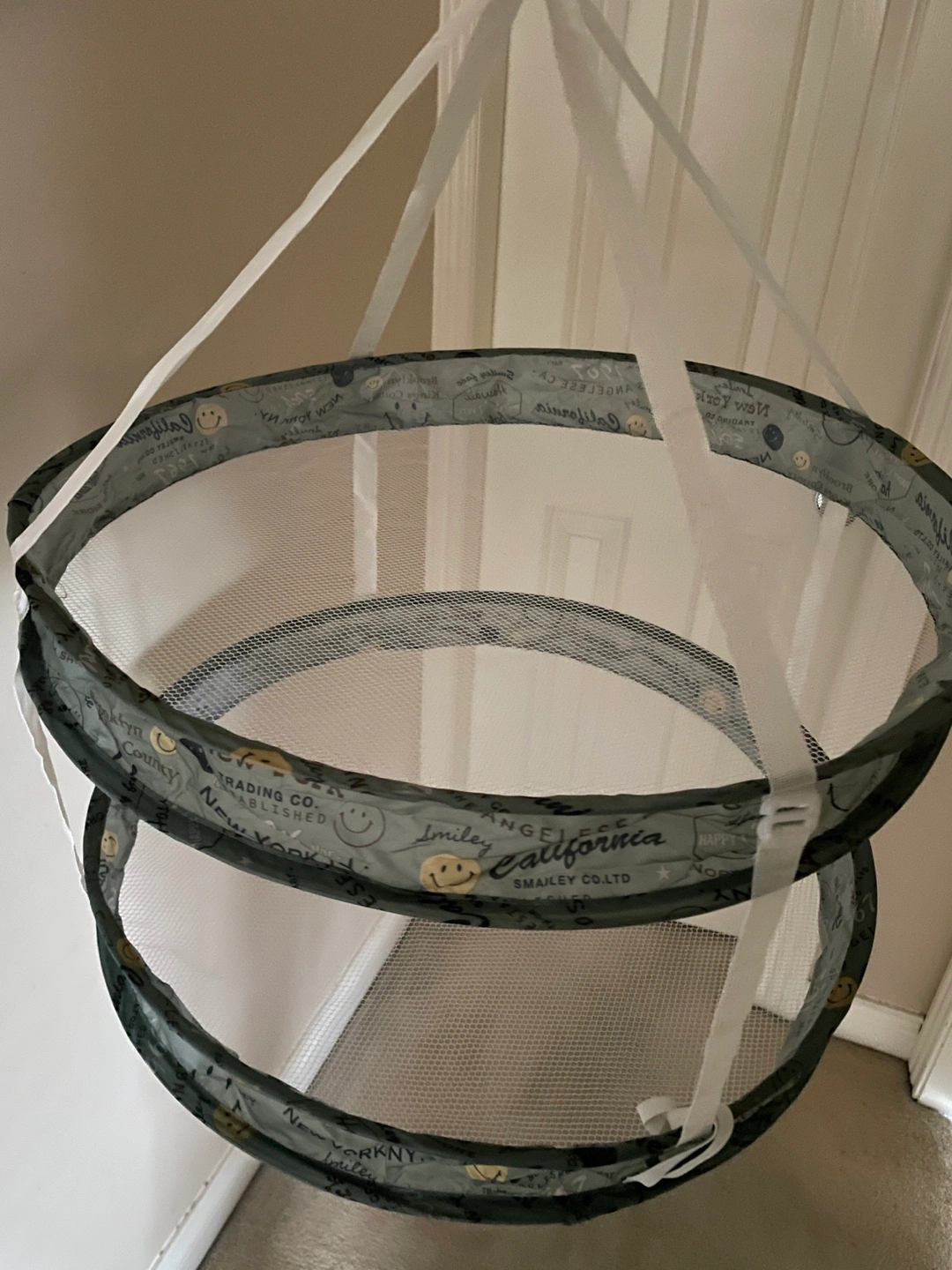 Circular hanging drying rack with mesh sides. Features 2 tiers. Size diameter in the second picture. Fold up neatly for easy storage. 4th picture show size of folded item.